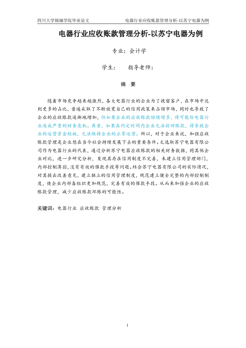 四川大学锦城学院毕业论文电器行业应收账款管理分析-以苏宁电器为例电器行业应收账款管理分析-以苏宁电器为例专业:会计学学生:指导老师:摘要随着市场竞争越来越激烈,各大电器行业的企业为了挽留客户,在市场中达到更多的占比,普遍采取了不断放宽自己的信用政策来占领市场,同时也导致了企业的应收账款逐渐地增加,但如果企业的应收账款继续增多,将可能给电器行业造成严重的财务危机。再者,如果在约定时间内企业无法收回账款,将导致企业的运营资金短缺,无法维持企业的正常运营。所以,对于企业来说,加强应收账款管理是企业想在当今社会持续发展下去的重要条件。文选取苏宁电器有限公司作为电器行业的代表,通过分析苏宁电器应收账款的相关财务数据,同其他企业对比,进一步研究分析,发现其存在信用制度不完善,未建立信用管理部门,内部控制薄弱,没有有效的催款手段等问题。结合苏宁电器有限公司的实际情况,对其提出改善意见,建立独立的信用管理制度,规范建立健全完整的内部控制制度,使企业内部各组织更加规范,完善有效的催款手段。从而来加强企业的应收账款管理,减少应收账款坏账的可能性。关键词:电器行业应收账款管理分析四川大学锦城学院毕业论文电器行业应收账款管理分析-以苏宁电器为例Electrical industry accounts receivablemanagement analysis-Suning electrical appliancesas an exampleMajor:AccountingStudents:Ye Yuxin Supervisor:AndyAbstractAlong with the market competition is more and more fierce,each big electricalindustry enterprises in order to retain customers,to achieve more in the market share,widely adopted a loosening of credit policy to occupy the market,but also led to theenterprise receivables increase gradually,but if the enterprise accounts receivable tocontinue to grow,may cause serious financial crisis for electronics industry.Moreover,if the enterprise can not collect the accounts within the agreed time,it willlead to the shortage of working capital of the enterprise,unable to maintain thenormal operation of the enterprise.Therefore,for enterprises,strengthening accountsreceivable management is an important condition for enterprises to continue todevelop in today's society.In this paper,Suning Electric Appliance Co.,Ltd.isselected as the representative of the electrical industry.By analyzing the relevantfinancial data of the receivables of Suning Electric Appliance Co.,Ltd.andcomparing with other enterprises,it is further analyzed and found that the creditsystem is not perfect,the credit management department has not been established,theinternal control is weak,and there is no effective means to demand payment.Combined with the actual situation of Suning Electric Appliance Co.,Ltd.,putforward suggestions for improvement,establish an independent credit managementsystem,standardize the establishment of a sound and complete internal control system,make the internal organizations of the enterprise more standardized,improve theeffective means of payment.Thus to strengthen the enterprise accounts receivablemanagement,reduce the possibility of accounts receivable bad debt.Key Words:Electrical Industry Accounts Receivable Management analysis四川大学锦城学院毕业论文电器行业应收账款管理分析-以苏宁电器为例目录1绪论…1.1研究背景及意义1.1.1研究背景1.1.2研究意义1.2文献综述1.2.1国外研究现状.…1.2.2国内研究现状1.3研究思路及方法21.3.1研究思路.…1.3.2研究方法…2应收账款的理论基础…32.1应收账款的概念2.2应收账款产生的动因及影响42.2.1应收账款产生的动因2.2.2应收账款产生的影响42.3应收账款管理的目标2.4应收账款的相关指标.…52.4.1应收账款占流动资产比重52.4.2应收账款占营业收入比重52.4.3应收账款周转率52.4.4应收账款账龄…3苏宁电器应收账款管理现状63.1苏宁电器简介…3.2苏宁电器应收账款分析…63.2.1应收账款占比分析3.2.2应收账款周转率分析3.2.3应收账款的具体账龄情况.94苏宁电器应收账款管理存在的问题94.1应收账款的信用管理制度不完善4.2内部控制管理制度不够完善…104.3缺乏有效的催款管理手段…105苏宁电器应收账款管理优化策略5.1建立信用管理制度.…