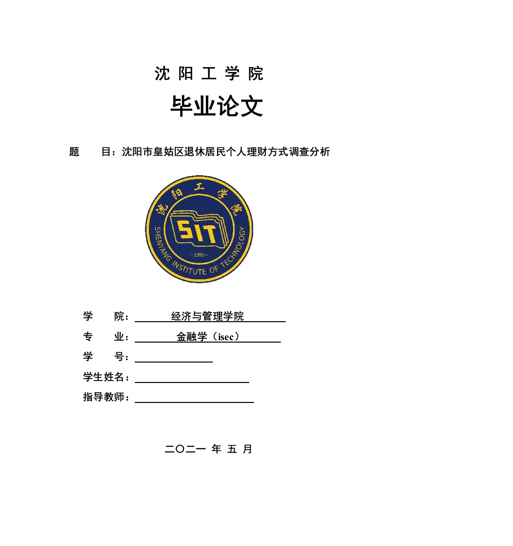 沈阳工学院毕业论文题目:沈阳市皇姑区退休居民个人理财方式调查分析阳沈1999-OF学经济与管理学院专金融学(isec)学号:学生姓名:指导教师:独创性声明本人声明,所呈交的学位论文是在导师的指导下进行研究工作所取得的成果。尽我所知,除文中已经注明引用内容和致谢的地方外,论文中不包含其他人已经发表或撰写过的研究成果,也不包括本人为获得其他学位而使用过的材料。与我一同工作的同志对本研究所做的任何贡献均己在论文中做了明确的说明并表示了谢意。学位论文作者签名:王迪导师签名:石坤平学位论文版权使用授权书本学位论文作者完全了解沈阳工学院有关保留、使用学位论文的规定。特授权沈阳工学院可以将学位论文的全部或部分内容编入有关数据库进行检索,提供阅览服务,并采用影印、缩印或扫描等复制手段保存、汇编以供查阅和借阅。同意学校向国家有关部门或机构送交论文的复印件和磁盘。学校可以为存在馆际合作关系的兄弟高校用户提供文献传递服务和交换服务。(保密的学位论文在解密后适用本授权说明)学位论文作者签名:王迪导师签名:石坤平签字日期:2021年6月16日签字日期:2021年6月16日摘要近几十年,我国经济发展迅速,国民可支配收改稳步增长,国民理财意愿不断提升,国民投资理财活动已经成为国家经济活动中不可缺少的一部分。投资理财不仅可以使个人获得消费资金,还可以获得经营性资金,筹集资金的方式有股票投资、债券投资以及各类金融投资项目。从2000年以来,我国人口老龄化,以不可逆转的方式逐步增加,基于以上种种原因,退休居民消费,理财等问题与中国经济结构密切相关。本文分析了以下问题,退休居民理财投资的经济来源,退休居民理财投资目的,退休居民理财投资的主要目标等,分析了退休居民关于关于资金管理回报,未来理财投资准备和风险行为等方面以及其身边亲朋好友对其理财投资的影响。结果表明,越来越多的退休居民有理财投资意向并准备进行理财投资,但是由于缺乏投资经验,针对性产品,以及对金融市场的认识不足,大多数退休居民是盲目的在选择金融投资方式。此外,社会公共机构对退休理财投资的培训和管理极少(除从事金融行业人员),这也许会导致退休居民无法回避风险,并在财务上有一些隐患。关键词:沈阳市皇姑区退休居民:理财投资:理财产品:理财方式
