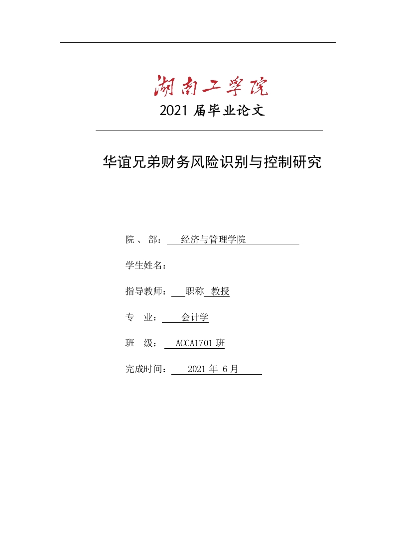 2021届毕业论文华谊兄弟财务风险识别与控制研究院、部:经济与管理学院学生姓名:指导教师:职称教授专业:会计学班级:ACCA1701班完成时间:2021年6月摘要近些年,影视娱乐行业大量民间资本不断涌入,影视产业公司数量不断激增,这使得影视行业内部资本竞争不断加剧。在宏观政策与资本市场的双重强力调控下,影视娱乐行业近三年都在持续调整中,整体业绩表现不佳。本文以华谊兄弟传媒股份有限公司(以下简称华谊兄弟)为案例,2016年至2020年间的财务报表所述为研究基础,对其历年财报所述中财务状况和运营范围进行了分析,从营运、投资、筹资和现金流等方面识别其财务风险,主要有存货变现能力有待提升、资产流动性减弱、资产利用率较弱、债务结构不合理、盈利质量不高、现金流量阶段性不稳定等风险。最后从提高周转率,提升营运能力:合理安排债务组合,优化资本结构:以风险为导向,加强现金流量管理:加强内部控制与监督,提高企业现金的使用率等方面为华谊兄弟如何规避相关财务风险问题提供参考。关键词:财务风险:财务报表:经营风险ABSTRACTIn recent years,a large number of private capital has been pouring into the filmand television entertainment industry,and the number of film and television industrycompanies has been increasing,which makes the internal capital competition in thefilm and television industry continue to intensify.Under the double strong control ofmacro policy and capital market,the film and television entertainment industry hasbeen in continuous adjustment in the past three years,and the overall performance ispoor.This paper takes Huayi Brothers Media Co.,Ltd.(hereinafter referred to asHuayi Brothers)as a case,based on the financial statements from 2016 to 2020,analyzes its financial status and operating results in the financial statements over theyears,and identifies its financial risks from the aspects of operation,investment,financing and cash flow,mainly risk including:the liquidity of inventory needs to beimproved ,the weakening of asset liquidity,the weak utilization ratio of assets,theunreasonable debt structure,the low profit quality and the unstable cash flow.Finally,the paper puts forward some suggestions:to improve the turnover rate and operationalcapacity;Reasonable arrangement of debt portfolio and optimization of capitalstructure;Risk oriented,strengthen cash flow management;Strengthen internalcontrol and supervision,improve the utilization rate of cash,and provide reference forHuayi Brothers how to avoid related financial risks.Key words financial risk;financial statements;business risk