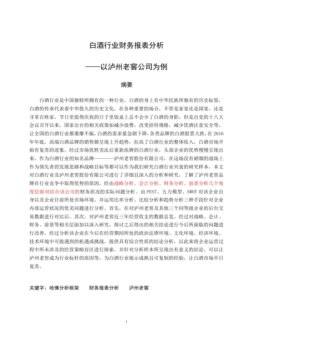 白酒行业财务报表分析以泸州老窖公司为例摘要白酒行业是中国独特所拥有的一种行业,白酒的身上有中华民族所独有的历史标签,白酒的传承代表着中华悠久的历史文化,在各种重要的场合,不管是家宴还是国宴,还是寻常百姓家,节日里值得庆祝的日子里饭桌上总不会少了白酒的身影,但是自党的十八大会议召开以来,国家出台的相关政策如减少浪费,改变招待规格,减少饮酒注意安全等,让全国的白酒行业都萎靡不振,白酒的需求量急剧下降,各类品牌的白酒股票大跌,在2016年年底,高端白酒品牌的销售额呈现上升趋势,拉高了白酒行业的整体收入,白酒市场开始有复苏的迹象,经过市场优胜劣汰后重新洗牌的白酒行业,头部企业的优势慢慢呈现出来,作为白酒行业的知名品牌一一一一泸州老窖股份有限公司,在这场没有硝烟的战场上作为领先者的发展思路和战略目标等都可以作为我们研究白酒行业兴衰的研究样本,本文对白酒行业及泸州老窖股份有限公司进行了详细且深入的分析和研究,了解了泸州老窖品牌在行业竞争中取得优势的原因,经由战略分析、会计分析、财务分析、前景分析几个角度层面对结合该公司的财务状况的实际问题分析。由PEST、五力模型、SW0T对该企业自身以及企业目前所处市场环境。并运用比率分析、比较分析和趋势分析三种手段针对企业内部运营状况的优劣问题进行分析。首先,在对泸州老窖及其他三个同等级企业的后台交易数据进行对比后,其次,对泸州老窖近三年经营收支的数据总览。经过对战略、会计、财务、前景等相关层面加以深入研究,探讨之后得出的相关结论进行今后所面临的问题进行改善,经过分析该企业在今后在经营期间所处的政治法律环境、文化环境、经济环境、技术环境中可能遇到的机遇或挑战,提供具有综合性质的结论分析,以此来将企业运营过程中所未涉及的经营策略盲区进行探索,并针对分析样本所呈现出有意义的结论,可以让泸州老窖成为行业标杆的原因等,为白酒行业展示成熟且可复制的经验,让白酒市场早日复苏。关键字:哈佛分析框架财务报表分析泸州老窖目录摘要1绪论1.1研究背景与意义1.2国内外研究动态1.3研究方法…1.4研究内容…2相关理论基础…2.1财务报表分析概述21.1财务报表分析概念62.1.2财务报表分析方法2.2哈佛分析框架相关理论.63泸州老窖公司财务分析3.1公司概况…3.2战略分析…83.3泸州老窖的会计分析错误!未定义书签。3.4泸州老窖财务分析错误!未定义书签。3.5泸州老窖前景分析错误!未定义书签。4公司综合评价和建议错误!未定义书签。4.1产品定位与定价错误!未定义书签。4.2成本控制错误!未定义书签。结论错误!未定义书签。参考文献错误!未定义书签。致谢错误!未定义书签。3.2战略分析3.3会计分析3.4财务分析3.5前景分析结论前的标号5删掉白酒行业财务报表分析以泸州老窖为例1绪论1.1研究背景与意义1.1.1研究背景白酒是我国独有的一种特色,由高粱小麦以及酒曲酿造而成,在中华上下五千年的历史长河中,白酒的文化伴随着历史的发展一路被传承下来,白酒的种类和工艺都繁杂又传统,高粱和小麦都要通过蒸馏的方法一步步进行提纯,是全世界独有的技术和文化,白酒在生活中是最常见的用来品味的饮料,在我国各个领域都发挥着巨大的作用,根据各地域历史传承留下不同的原材料和不同的技术,我国发展出各种不同的白酒品牌,知名品牌如茅台、五粮液、汾酒、泸州老窖等,品牌发展成行业的领军者,带领着白酒行业蓬勃发展,经过这几十年的发展,尤其是改革开放以来,市场的调控使我国的白酒行业向这些品牌的进行挤压式靠拢,近几年,我国的白酒企业数量锐减,市场份额也都是各类耳熟能详的大品牌占有,使优者更优,弱者消失,大品牌的高端白酒系列价格昂贵,反而让下一个梯队的白酒品牌显得性价比高,次高端的白酒发展势头迅猛,随着市场上消费者的不断选择,次高端白酒的需求量不断增加,但该价位的白酒市场还不稳定,所以还具有很多未知的机遇和风险,当前我国消费者更加喜欢浓香型酒品,在全行业的销售总量中,酱香型占总销售量的一半以上。当下,浓香型的白酒是泸州老窖的特色和招牌,称为浓香白酒的鼻祖。1.1.2研究意义借助财务报表中的相关数据分析,我们可以对所研究企业的当前财务状况及即将面临的问题进行探究并解决,但该研究探讨非仅局限于财务所关联因素,否则范围的局限性可能使得研究探讨的问题解决方案有所缺失。本文比较了陆州老交股份有限公司(以下简称“泸州老窖股份有限公司”)2017年至2019年年报中的相关数据,以哈佛框架进行探讨,对其财务分析具有很强的研究意义。本文的研究意义如下:(1)探索泸州老窖股份有限公司在发展过程中存在的财务问题和经营问题,对企业中的相关利益环节做出正确的认识性指导。(2)鉴于该公司在行业内的高水准,其财务报表分析能够帮助不仅限于自身企业的进步。(3)由对泸州老窖股份有限公司财务报表,结合国家当前政策环境下对品牌建设、观念升级方面更好的贴合受众观念,进而稳定巩固行业内的地位。此外,再以与它种同类企业的横向比较,让其运营环节能够最终收获品牌效应的辐射影响范围扩展和行业的切实性进步。