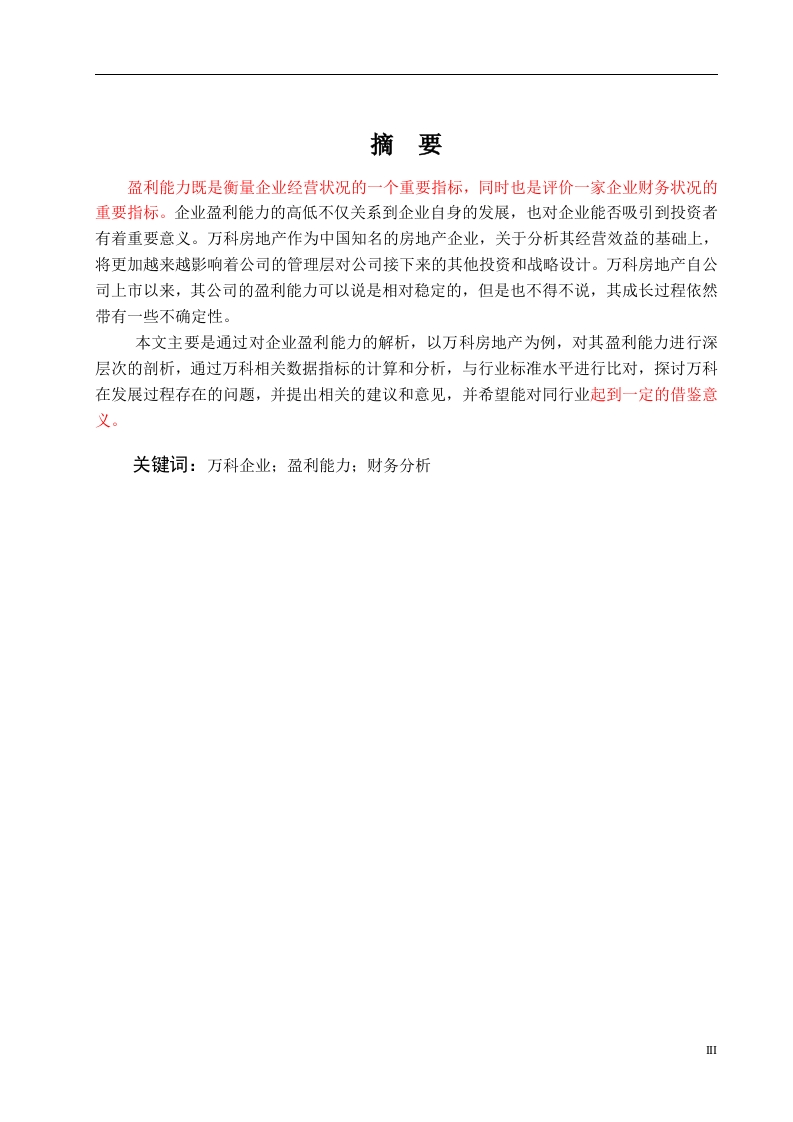 摘要盈利能力既是衡量企业经营状况的一个重要指标,同时也是评价一家企业财务状况的重要指标。企业盈利能力的高低不仅关系到企业自身的发展,也对企业能否吸引到投资者有着重要意义。万科房地产作为中国知名的房地产企业,关于分析其经营效益的基础上,将更加越来越影响着公司的管理层对公司接下来的其他投资和战略设计。万科房地产自公司上市以来,其公司的盈利能力可以说是相对稳定的,但是也不得不说,其成长过程依然带有一些不确定性。本文主要是通过对企业盈利能力的解析,以万科房地产为例,对其盈利能力进行深层次的剖析,通过万科相关数据指标的计算和分析,与行业标准水平进行比对,探讨万科在发展过程存在的问题,并提出相关的建议和意见,并希望能对同行业起到一定的借鉴意义。关键词:万科企业:盈利能力:财务分析AbstractProfitability is not only an important index to measure the business situation of anenterprise,but also an important index to evaluate the financial situation of an enterprise.Theprofitability of enterprises is not only related to the development of enterprises themselves,butalso to whether enterprises can attract investors.Vanke Real Estate,as a well-known real estateenterprise in China,will more and more affect the management's next investment and strategicdesign on the basis of analyzing its operating efficiency.Vanke real estate since the listing of thecompany,its profitability can be said to be relatively stable,but also have to say that its growthprocess is still with some uncertainty.This paper mainly through the analysis of the profitability of enterprises,taking Vanke realestate as an example,deeply analyzes its profitability,through the calculation and analysis ofVanke related data indicators,compared with the industry standard level,This paper discussesthe problems existing in Vanke's development process,and puts forward some suggestions andsuggestions.Key words:Vanke Enterprise;Profitability;Financial Analysis目录441.2国内外文献综述41.3论文的结构及主要内容..61.4论文的研究方法....62企业盈利能力理论综述..·62.1企业盈利能力概念......72.2企业盈利能力分析的目的......73房地产公司盈利能力评价指标及影响因素.83.1房地产公司盈利能力影响因素....83.2房地产公司盈利能力指标确定原则93.3房地产公司盈利能力分析指标体系910104.2具体分析与评价105对万科集团盈利能力的总体评价及建议125.2营销转型...125.3加强财务管理12