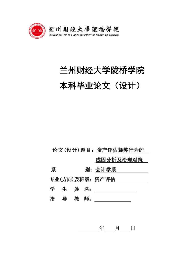 兰州财经大学陇桥学院本科毕业论文(设计)论文(设计)题目:资产评估舞弊行为的成因分析及治理对策系别:会计学系专业(方向)及班级:资产评估学生姓名:指导教师:年月日陇桥学院本科毕业论文(设计)原创性声明本人郑重声明:所呈交的论文(设计)是本人在导师的指导下独立进行研究所取得的研究成果。除了文中特别加以标注引用的内容外,本论文(设计)不包含任何其他个人或集体已经发表或撰写的成果作品。本人完全意识到本声明的法律后果由本人承担。作者签名:年月日