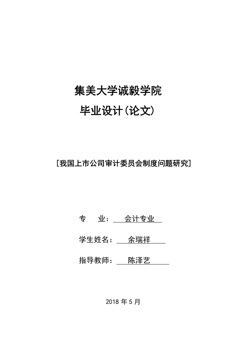集美大学诚毅学院毕业设计(论文)[我国上市公司审计委员会制度问题研究]专业:会计专业学生姓名:余瑞祥指导教师:陈泽艺2018年5月我国上市公司审计委员会制度问题研究[摘要]20世纪末到21世纪初我国发生了一系列后果严重的财务舞弊、造假事件,造成这些事件的原因是多方面的,但是无疑这些公司治理作用的缺失有着不可推卸的责任。与此同时,大量学者和相关部门开始关注深受发达国家推崇的审计委员会制度,希望像发达国家一样用这个制度来加强公司治理作用。2002年我国发布了针对上市公司治理的准则,该准则是国内首次涉及审计委员会制度的官方规范,其正式规定上市公司董事会可根据股东大会决议,在董事会下设立审计委员会,并对审计委员会的人员构成和职责进行了简要的规定。随着国外审计委员会制度的发展,我国也相继对审计委员会制度进行完善。2007年我国证监会发布了关于上市公司信息披露的准则,该准则要求上市公司披露审计委员会年度履职情况报告。这份报告应包括以下内容:针对公司年度财务报表的两次审议意见,对外部审计工作督促情况,对外部审计工作的总结报告以及对下一年有关外部审计机构选聘的决议书。但是由于我国对于审计委员会制度的研究与实施起步较晚,导致我国审计委员会制度还存在很多的缺陷没有被认知和改进。时至今日,几乎所有上市公司都设立了审计委员会,但是由于审计委员会制度存在缺陷导致审计委员会未能发挥其强化治理的作用。本文通过发掘我国上市公司审计委员会制度存在的问题,分析问题的成因,提出改善的措施,以期为我国上市公司审计委员会制度的完善和发展贡献绵薄之力。[关键词]审计委员会、公司治理、信息评价应包括(背景。意义。写作思路。结论。观点。我的创新贡献。不足。可能的进一步研究)40字左右Research on audit committee system of Listed Companies inChinaAbstract:[Abstract]from the end of twentieth Century to the beginning oftwenty-first Century,a series of serious financial frauds and fraudulent events havetaken place in China.The reasons for these events are multifaceted,but there is nodoubt that the lack of the corporate governance of these companies has anunshirkable responsibility.At the same time,a large number of scholars and relateddepartments have begun to pay attention to the audit committee system highlyrespected by developed countries,hoping to use this system to strengthen corporategovernance,like developed countries.In 2002,China issued the guidelines for thegovernance of listed companies.This standard is the first official regulation of theaudit committee system in China.It formally stipulates that the board of directors oflisted companies can set up an audit committee under the board of directorsaccording to the resolution of the shareholders'meeting,and make a brief rule on thecomposition and responsibility of the audit committee.Set.With the development offoreign audit committee system,China has perfected the audit committee system oneafter another.In 2007,China Securities Regulatory Commission issued guidelines forinformation disclosure of listed companies,which requires listed companies todisclose the annual performance report of the board of auditors.The report shouldinclude the following:two comments on the annual financial statements of thecompany,the supervision of the external audit work,the summary report on theexternal audit work and the resolution on the selection of external audit institutions forthe next year.However,due to the late start of the research and implementation of theaudit committee system in China,the audit committee system in China has not beenrecognized and improved.Today,almost all listed companies have set up an auditcommittee,but the audit committee has failed to play its role of strengthening itsgovernance because of the defects of the audit committee system.By exploring the problems existing in the audit committee system of the listed