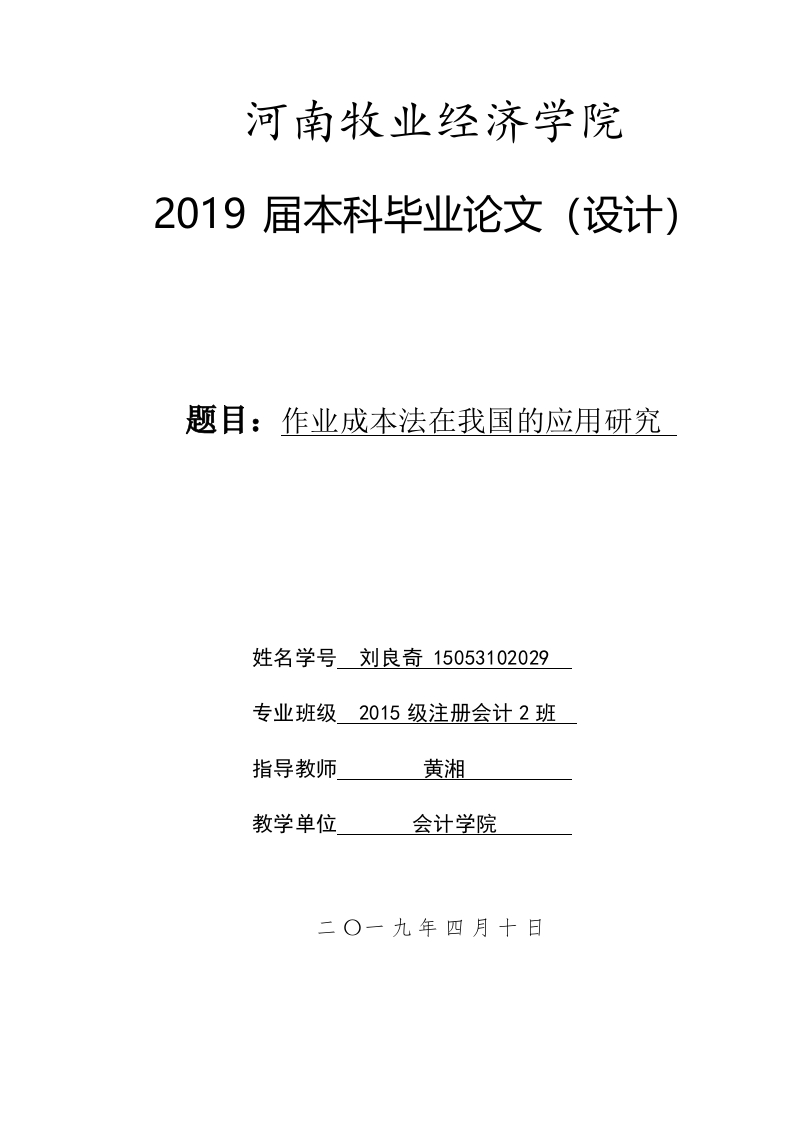 河南牧业经济学院2019届本科毕业论文(设计)题目:作业成本法在我国的应用研究姓名学号刘良奇15053102029专业班级2015级注册会计2班指导教师黄湘教学单位会计学院二O一九年四月十日毕业论文(设计)版权使用授权书本人完全了解河南牧业经济学院关于收集、保存和使用学位毕业论文(设计)的规定,同意如下各项内容:按照学校要求提交毕业论文(设计)的印刷本和电子版本:学校有权保存毕业论文(设计)的印刷本和电子版,并采用影印、缩印、扫描、数字化或其它手段保存毕业论文(设计);学校有权提供目录检索以及提供本毕业论文(设计)全文或者部分的阅览服务:学校有权按有关规定向国家有关部门或者机构送交毕业论文(设计)的复印件和电子版:在不以赢利为目的的前提下,学校可以适当复制毕业论文(设计)的部分或全部内容用于学术活动。毕业论文(设计)作者签名:年月日河南牧业经济学院本料毕业论文〔设计)毕业论文(设计)原创性声明本人郑重声明:所呈交的毕业论文(设计),是本人在指导教师指导下,进行研究工作所取得的成果。除文中已经注明引用的内容外,本毕业论文(设计)的研究成果不包含任何他人创作的、已公开发表或者没有公开发表的作品的内容。对本毕业论文(设计)所涉及的研究工作做出贡献的其他个人和集体,均已在文中以明确方式标明。本学位毕业论文(设计)原创性声明的法律责任由本人承担。毕业论文(设计)作者签名:年月日