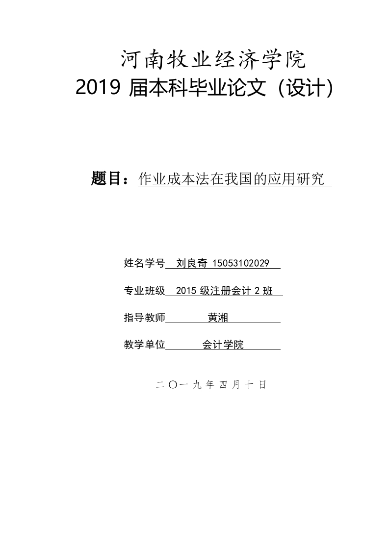 河南牧业经济学院2019届本科毕业论文(设计)题目:作业成本法在我国的应用研究姓名学号刘良奇15053102029专业班级2015级注册会计2班指导教师黄湘教学单位会计学院二O一九年四月十日毕业论文(设计)版权使用授权书本人完全了解河南牧业经济学院关于收集、保存和使用学位毕业论文(设计)的规定,同意如下各项内容:按照学校要求提交毕业论文(设计)的印刷本和电子版本;学校有权保存毕业论文(设计)的印刷本和电子版,并采用影印、缩印、扫描、数字化或其它手段保存毕业论文(设计);学校有权提供目录检索以及提供本毕业论文(设计)全文或者部分的阅览服务:学校有权按有关规定向国家有关部门或者机构送交毕业论文(设计)的复印件和电子版;在不以赢利为目的的前提下,学校可以适当复制毕业论文(设计)的部分或全部内容用于学术活动。毕业论文(设计)作者签名:年月日河南牧业经济学院本料毕业论文〔设计)毕业论文(设计)原创性声明本人郑重声明:所呈交的毕业论文(设计),是本人在指导教师指导下,进行研究工作所取得的成果。除文中已经注明引用的内容外,本毕业论文(设计)的研究成果不包含任何他人创作的、已公开发表或者没有公开发表的作品的内容。对本毕业论文(设计)所涉及的研究工作做出贡献的其他个人和集体,均已在文中以明确方式标明。本学位毕业论文(设计)原创性声明的法律责任由本人承担。毕业论文(设计)作者签名:年月日