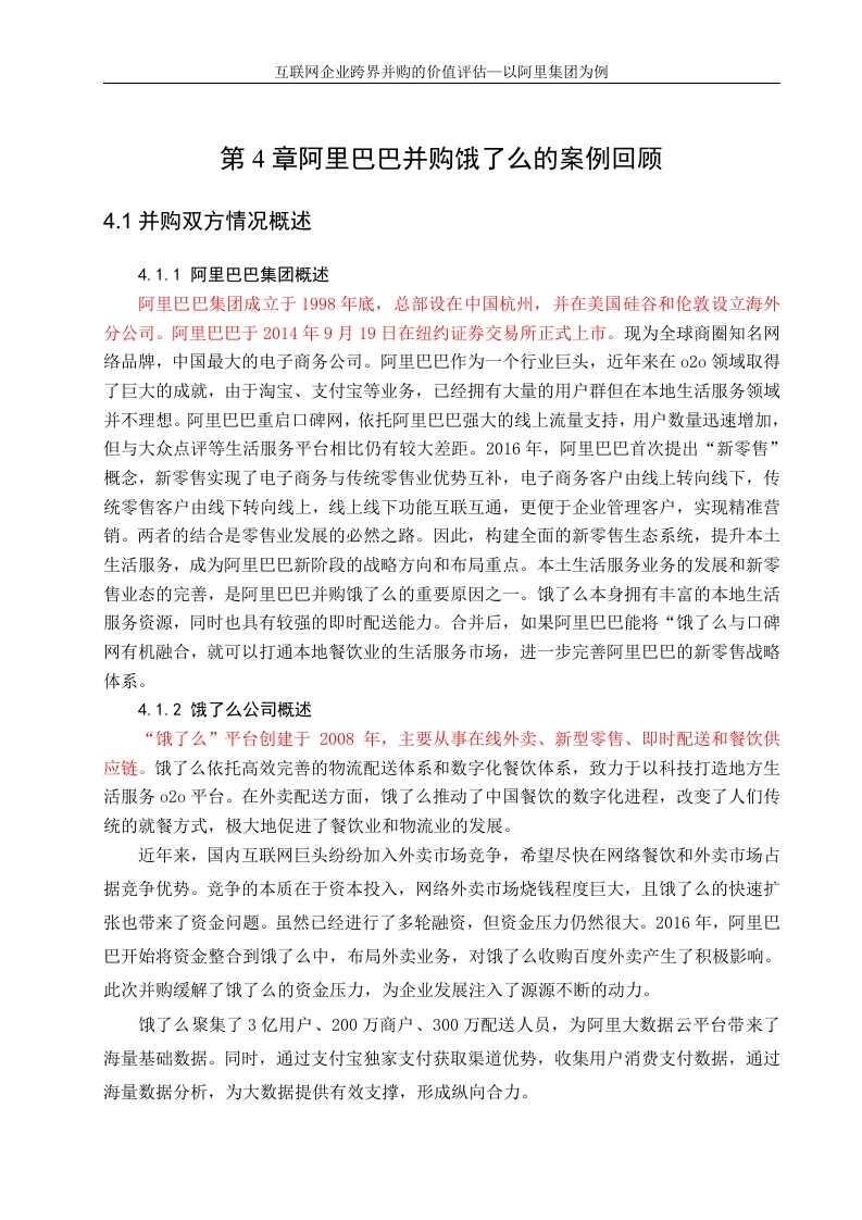 互联网企业界并购的价值评估一以阿里集团为例第4章阿里巴巴并购饿了么的案例回顾4.1并购双方情况概述4.1.1阿里巴巴集团概述阿里巴巴集团成立于1998年底,总部设在中国杭州,并在美国硅谷和伦敦设立海外分公司。阿里巴巴于2014年9月19日在纽约证券交易所正式上市。现为全球商圈知名网络品牌,中国最大的电子商务公司。阿里巴巴作为一个行业巨头,近年来在o20领域取得了巨大的成就,由于淘宝、支付宝等业务,已经拥有大量的用户群但在本地生活服务领域并不理想。阿里巴巴重启口碑网,依托阿里巴巴强大的线上流量支持,用户数量迅速增加,但与大众点评等生活服务平台相比仍有较大差距。2016年,阿里巴巴首次提出“新零售”概念,新零售实现了电子商务与传统零售业优势互补,电子商务客户由线上转向线下,传统零售客户由线下转向线上,线上线下功能互联互通,更便于企业管理客户,实现精准营销。两者的结合是零售业发展的必然之路。因此,构建全面的新零售生态系统,提升本土生活服务,成为阿里巴巴新阶段的战略方向和布局重点。本土生活服务业务的发展和新零售业态的完善,是阿里巴巴并购饿了么的重要原因之一。饿了么本身拥有丰富的本地生活服务资源,同时也具有较强的即时配送能力。合并后,如果阿里巴巴能将“饿了么与口碑网有机融合,就可以打通本地餐饮业的生活服务市场,进一步完善阿里巴巴的新零售战略体系。4.1.2饿了么公司概述“饿了么”平台创建于2008年,主要从事在线外卖、新型零售、即时配送和餐饮供应链。饿了么依托高效完善的物流配送体系和数字化餐饮体系,致力于以科技打造地方生活服务020平台。在外卖配送方面,饿了么推动了中国餐饮的数字化进程,改变了人们传统的就餐方式,极大地促进了餐饮业和物流业的发展。近年来,国内互联网巨头纷纷加入外卖市场竞争,希望尽快在网络餐饮和外卖市场占据竞争优势。竞争的本质在于资本投入,网络外卖市场烧钱程度巨大,且饿了么的快速扩张也带来了资金问题。虽然已经进行了多轮融资,但资金压力仍然很大。2016年,阿里巴巴开始将资金整合到饿了么中,布局外卖业务,对饿了么收购百度外卖产生了积极影响。此次并购缓解了饿了么的资金压力,为企业发展注入了源源不断的动力。饿了么聚集了3亿用户、200万商户、300万配送人员,为阿里大数据云平台带来了海量基础数据。同时,通过支付宝独家支付获取渠道优势,收集用户消费支付数据,通过海量数据分析,为大数据提供有效支撑,形成纵向合力。福州大学至诚学院本科生毕业设计(论文)4.2并购动因分析4.2.1开展新零售计划的需要作为B2B电子商务企业,阿里巴巴拥有丰富的线上经验,但缺乏线下经验。线下这一区域,可以说是一个新的领域,也是一个空白领域。如果自己从零开始构建整个线下系统,缺乏相关的经验、技术和人脉,是一个不理智的商业决策。作为一家成熟的o20企业,饿了么拥有完善的物流配送体系,正好满足了阿里巴巴线下业务发展的需要。有数以百万计的全职和兼职骑手。通过与阿里巴巴的合作,饿了么可以使自己的业务不再局限于外卖行业,而是与阿里巴巴共享资源和渠道。通过饿了么的线下分销平台和阿里巴巴网购平台,如淘宝、支付宝等,打通了线上线下之间的壁垒。4.2.2带来协同效应的需要阿里巴巴并购饿了么可以形成协同效应,有助于形成“1+1>2”效应。通过内外部相结合的形式,两家企业可以降低经营成本,增加利润,并购方可以向被并购方提供资金以促进其发展。4.2.3制衡竞争对手的需要目前,线下领先的o20企业只有饿了么和美团两家。腾讯优先考虑美团。如果阿里巴巴想拓展线下业务,那么阿里巴巴别无选择,只能选择饿了么。从阿里巴巴的角度来看,阿里巴巴需要制衡的竞争对手是百度、腾讯等,饿了么的业务正好符合阿里巴巴蚂蚁金服的业务发展战略需要。阿里巴巴并购饿了么就可以让支付宝和淘宝的口碑可以直接与饿了么联系起来,这样阿里巴巴就可以利用蚂蚁金服重新冲刺本地生活服务领域。4.3并购交易活动分析阿里巴巴以95亿美元现金对价的形式成功实现了对饿了么的并购,并完成了对饿了么的全资收购。此次收购被称为互联网史上最大的现金收购。在此之前,阿里巴巴分别以45亿美元和46.8亿美元收购优酷土豆网和万达电影。华联股份披露了相关细节,其对饿了么进行估值,该公司的估值约为90.53亿美元,低于阿里巴巴的现金投资总额。阿里巴巴此次收购的形式是巨额的全现金对价,这次支付的对价是以前的两倍多。不过,虽然阿里巴巴能够迅速实现并购目的,而且现金对价的形式也不同于债务融资和股权融资,但它具有防止股权过度分散的优势,也在一定程度上避免了举债的财务杠杆风险。但在一定程度上会影响企业的正常经营,因为它需要在短时间内快速支付大量资金,所以企业的资金链可能会断裂。此外,企业可能会产生过度交易的不良后果。饿了么可能会丧失独立性。阿里巴巴通过全资收购饿了么,其实也是全资控股饿了么,成为绝对大股东。且由阿里巴巴集团副总裁王磊出任公司CE0,这与阿里巴巴在并购时坚互联网企业跨界并购的价值评估一以阿里集团为例持自主经营原则、维护自主品牌和运营的做法相矛盾,虽然饿了么被阿里巴巴收购后可以获得强大的资金支持,但