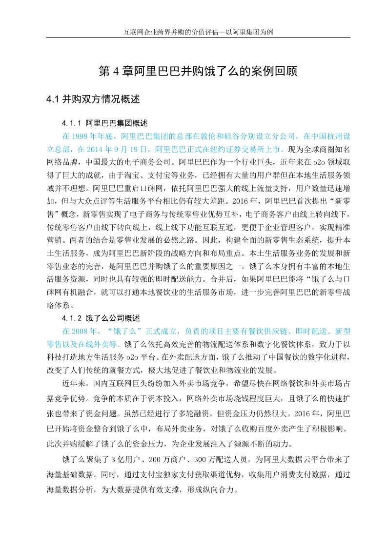 互联网企业跨界并购的价值评估一以阿里集团为伤第4章阿里巴巴并购饿了么的案例回顾4.1并购双方情况概述4.1.1阿里巴巴集团概述在1998年年底,阿里巴巴集团的总部在敦伦和硅谷分别设立分公司,在中国杭州设立总部,在2014年9月19日,阿里巴巴正式在纽约证券交易所上市。现为全球商圈知名网络品牌,中国最大的电子商务公司。阿里巴巴作为一个行业巨头,近年来在o20领域取得了巨大的成就,由于淘宝、支付宝等业务,已经拥有大量的用户群但在本地生活服务领域并不理想。阿里巴巴重启口碑网,依托阿里巴巴强大的线上流量支持,用户数量迅速增加,但与大众点评等生活服务平台相比仍有较大差距。2016年,阿里巴巴首次提出“新零售”概念,新零售实现了电子商务与传统零售业优势互补,电子商务客户由线上转向线下,传统零售客户由线下转向线上,线上线下功能互联互通,更便于企业管理客户,实现精准营销。两者的结合是零售业发展的必然之路。因此,构建全面的新零售生态系统,提升本土生活服务,成为阿里巴巴新阶段的战略方向和布局重点。本土生活服务业务的发展和新零售业态的完善,是阿里巴巴并购饿了么的重要原因之一。饿了么本身拥有丰富的本地生活服务资源,同时也具有较强的即时配送能力。合并后,如果阿里巴巴能将“饿了么与口碑网有机融合,就可以打通本地餐饮业的生活服务市场,进一步完善阿里巴巴的新零售战略体系。4.1.2饿了么公司概述在2008年,“饿了么”正式成立,负责的项目主要有餐饮供应链、即时配送、新型零售以及在线外卖等。饿了么依托高效完善的物流配送体系和数字化餐饮体系,致力于以科技打造地方生活服务020平台。在外卖配送方面,饿了么推动了中国餐饮的数字化进程,改变了人们传统的就餐方式,极大地促进了餐饮业和物流业的发展。近年来,国内互联网巨头纷纷加入外卖市场竞争,希望尽快在网络餐饮和外卖市场占据竞争优势。竞争的本质在于资本投入,网络外卖市场烧钱程度巨大,且饿了么的快速扩张也带来了资金问题。虽然已经进行了多轮融资,但资金压力仍然很大。2016年,阿里巴巴开始将资金整合到饿了么中,布局外卖业务,对饿了么收购百度外卖产生了积极影响。此次并购缓解了饿了么的资金压力,为企业发展注入了源源不断的动力。饿了么聚集了3亿用户、200万商户、300万配送人员,为阿里大数据云平台带来了海量基础数据。同时,通过支付宝独家支付获取渠道优势,收集用户消费支付数据,通过海量数据分析,为大数据提供有效支撑,形成纵向合力。福州大学至诚学院本科生毕业设计(论文)4.2并购动因分析4.2.1开展新零售计划的需要作为B2B电子商务企业,阿里巴巴拥有丰富的线上经验,但缺乏线下经验。线下这一区域,可以说是一个新的领域,也是一个空白领域。由于阿里巴巴缺乏线下经验,相关技术与人才都不充沛,若不结合实际情况冒险建设线下系统,是非常冒进的商业决策。作为一家成熟的o20企业,物流配送系统的完整是重中之重,饿了么就具有这点,其公司全职与兼职骑手多达几百万,所以饿了么是目前最适合阿里巴巴进军线下业务的目标。并购后,双方能够共享渠道以及资源,饿了么能够通过阿里巴巴进一步拓展业务范围。同时将各自的线上网购平台与线下分销平台有效结合,如淘宝、支付宝等,打通了线上线下之间的壁垒。4.2.2带来协同效应的需要饿了么被阿里巴巴并购,其产生的效果是“1+1>2”的,有利于实现协同效应。若加强内外部联系,能够减少两者的经营成本,利润收入会得到显著的提高,饿了么同时可以接受并购方的资金帮助,加快自身发展。4.2.3制衡竞争对手的需要目前,线下领先的o20企业只有饿了么和美团两家。美团被腾讯率先接触。若想要与腾讯、百度等竞争对手更好的抗衡,所以饿了么是阿里巴巴进军线下业务的最优解也是唯选择。同时,蚂蚁金服在战略发展方面的需求,饿了么能够满足其发展需求。若并购后,并购方的口碑能够直接影响被并购方,借此,阿里巴巴在生活服务领域能够借用蚂蚁金服进行新一轮冲刺。4.3并购交易活动分析饿了么被阿里巴巴实现全资收购,其采取了现金对价的方法进行并购,并购金额高达95亿美元,也是互联网领域历史最高收购金额。除了这起并购,阿里巴巴在这之前还完成了两次收购,分别是万达电影与优酷土豆网,这两家企业被收购金额分别为46.8亿美元以及45亿美元。华联股份结合相关数据对饿了么进行了科学化估值,其企业价值多达90.53亿美元左右,但这身价远不及阿里巴巴对其收购的投资金额。阿里巴巴此次收购的形式是巨额的全现金对价,这次支付的对价是以前的两倍多。不过,虽然阿里巴巴能够迅速实现并购目的,而且现金对价的形式也不同于债务融资和股权融资,但它具有防止股权过度分散的优势,也在一定程度上避免了举债的财务杠杆风险。但在一定程度上会影响企业的正常经营,因为它需要在短时间内快速支付大量资金,所以企业存有资金链断裂的情况。另外,企业因过度交易产生一系列恶劣影响。互联网企业界并购的价值评估一以阿里集团为例饿了么在此之后,不再具有独立性。在被全资收购后,阿里巴巴成为最大股东,实现对其完全控股。企业CE0也被换成了王磊,他是阿里巴巴的副总裁,从该方面反映出阿里巴巴并购前后所提倡的原则有