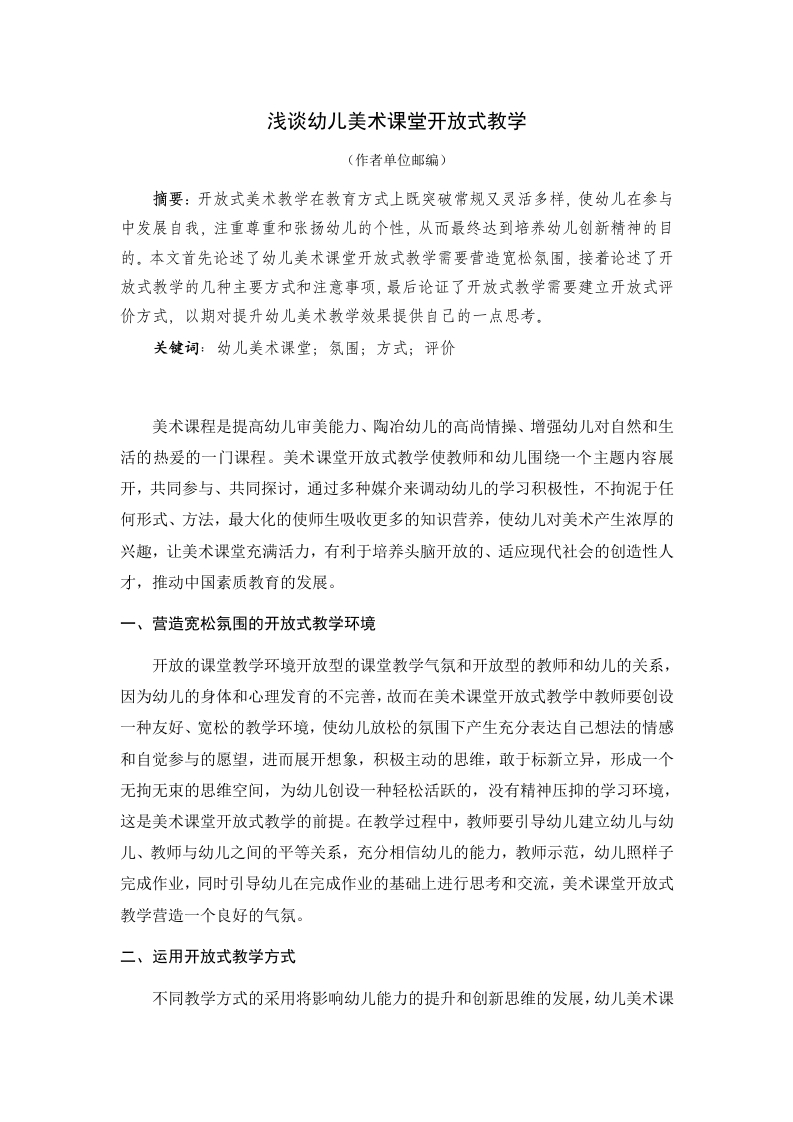 浅谈幼儿美术课堂开放式教学(作者单位邮编)摘要:开放式美术教学在教育方式上既突破常规又灵活多样,使幼儿在参与中发展自我,注重尊重和张扬幼儿的个性,从而最终达到培养幼儿创新精神的目的。本文首先论述了幼儿美术课堂开放式教学需要营造宽松氛围,接着论述了开放式教学的几种主要方式和注意事项,最后论证了开放式教学需要建立开放式评价方式,以期对提升幼儿美术教学效果提供自己的一点思考。关健词:幼儿美术课堂;氛围;方式:评价美术课程是提高幼儿审美能力、陶治幼儿的高尚情操、增强幼儿对自然和生活的热爱的一门课程。美术课堂开放式教学使教师和幼儿围绕一个主题内容展开,共同参与、共同探讨,通过多种媒介来调动幼儿的学习积极性,不拘泥于任何形式、方法,最大化的使师生吸收更多的知识营养,使幼儿对美术产生浓厚的兴趣,让美术课堂充满活力,有利于培养头脑开放的、适应现代社会的创造性人才,推动中国素质教育的发展。一、营造宽松氛围的开放式教学环境开放的课堂教学环境开放型的课堂教学气氛和开放型的教师和幼儿的关系,因为幼儿的身体和心理发育的不完善,故而在美术课堂开放式教学中教师要创设一种友好、宽松的教学环境,使幼儿放松的氛围下产生充分表达自己想法的情感和自觉参与的愿望,进而展开想象,积极主动的思维,敢于标新立异,形成一个无拘无束的思维空间,为幼儿创设一种轻松活跃的,没有精神压抑的学习环境,这是美术课堂开放式教学的前提。在教学过程中,教师要引导幼儿建立幼儿与幼儿、教师与幼儿之间的平等关系,充分相信幼儿的能力,教师示范,幼儿照样子完成作业,同时引导幼儿在完成作业的基础上进行思考和交流,美术课堂开放式教学营造一个良好的气氛。二、运用开放式教学方式不同教学方式的采用将影响幼儿能力的提升和创新思维的发展,幼儿美术课堂开放式教学要求教师按照以下集中教学方式进行教学。(一)生活化教学方式教学中可以将乡土美术或生活引入课堂,知识来源于生活,让幼儿通过传统文化去了解中国的文化内涵,这对知识的构建、作品的创造以及国情怀的培养都将起到积极作用,美术教学可以对民间的美术创作加以挖掘,如潮汕的剪纸、佛山木刻版画等,都可以让幼儿在美术学习中对生活的了解,幼儿到大自然中去感受自然之美,都是美术教学的重要资源,都带领幼儿深入生活,对幼儿美术学习的提高是有很大帮助的。(二)互动式教学方式互动式教学是近年来较为流行的教学方式,包括教师和幼儿的互动、幼儿之间的互动两种情形。在美术欣赏教学中,如果教师只是进行枯燥的讲解,缺乏课堂整体的互动,幼儿的就对课堂难以产生兴趣,进而使幼儿会感到疲惫。若换用活动的方式,问题将迎刃而解,通过让幼儿通过交流和讨论,教师最后进行总结提升,课堂气氛就会较为融洽。互动式教学还要求教师尽可能多的通过多媒体对图画的展示,在制作多媒体课件时,教师可以加些相应的音乐背景,让整个多媒体课件更加赏心悦目,让幼儿从听觉、视觉多方位地感受艺术作品,幼儿的积极性得到了提高,从而加深了对课堂内容的理解。(三)比赛式教学方式通过比赛的方式能激发幼儿的学习的主动性和积极性,这种方法在实践课程中使用最多,教师可组织幼儿进行绘画比赛,规定一定的时间让幼儿在合作中完成作品,在最后的评比过程中,教师要对幼儿在比赛中的优点进行表扬,同时指出幼儿的不足,为以后的学习提出要求。由于幼儿的心理调节能力较弱,故而点评应以表扬为主,以免打消幼儿的积极性。对于成功的同学而言,教师可以给与一定的物质奖励,激发幼儿的创造欲望。三、幼儿美术课堂开放式教学注意事项(一)开放固定的教学空间教室是我们实施教学的重要场所,我们就会自然地会把教学与教室联系在一起,但是外面的世界也很精彩,教师可以在适当的时候让幼儿走出教室、走进大自然,让幼儿们在大自然中观察各种小动物的动态,让幼儿们观察花鸟虫鱼的色彩特征和形状,有条件的学校可以带领幼儿走进生态养殖园、植物园,让幼儿尽情感受平时容易忽略的事物。开放幼儿美术活动的空间,不仅拓宽了幼儿的思维领域,同时有利于让幼儿贴近生活,让幼儿真正领自然的美,提升幼儿对美术的认知水平。(二)扩大绘画的材料范围纸和笔不是唯一的绘画材料,幼儿有着强烈的好奇心,随着涂鸦期经验的不断丰富,这种好奇心驱使幼儿尝试运用各种材料进行创作,按照自己的意图形成各种作品,在使用这些原材料的过程中获得满足,在幼儿美术教学中可以鼓励幼儿利用彩色纸、水彩棍、牛皮纸、石头块、一次性筷子等身边的物品作为绘画工具和材料,绘制成不同效果的画。(三)引导幼儿想象幼儿认识和观察世界与成人不一样,艺术创作并没有统一的定式和标准,他们表现作品中的色、形、空间就有其独特的创造。教室在幼儿美术教学中要在形式上有选择性,让每个幼儿都能突出自己的闪光点,引导幼儿进行想象,自由的选择自己感兴趣的表现方式,激发幼儿创作热情,发挥自己的创作特长,展示了自己的激情,从乐学上点燃了幼儿创作的火花。四、建立开放式评价方式美术作业评价是实现美术教学目标的基本保证,美术作业是一种饱含热情的创造性活动产品,是美术教学活动中的一个重要环