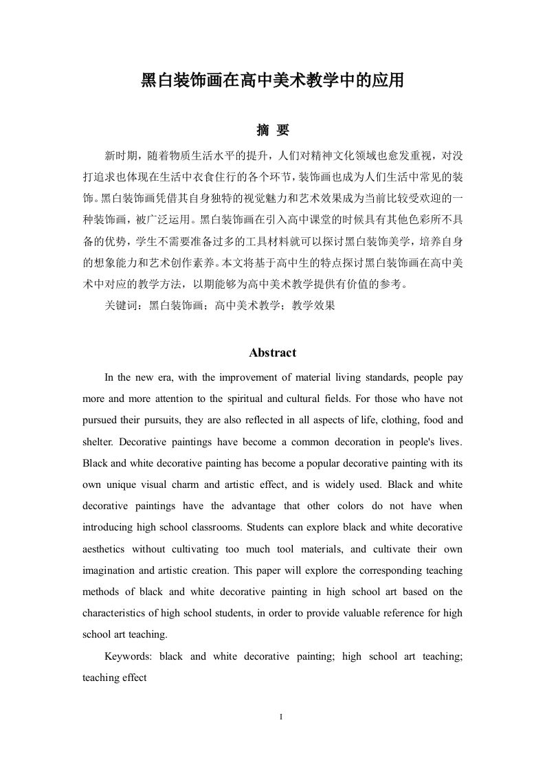 黑白装饰画在高中美术教学中的应用摘要新时期,随着物质生活水平的提升,人们对精神文化领域也愈发重视,对没打追求也体现在生活中衣食住行的各个环节,装饰画也成为人们生活中常见的装饰。黑白装饰画凭借其自身独特的视觉魅力和艺术效果成为当前比较受欢迎的一种装饰画,被广泛运用。黑白装饰画在引入高中课堂的时候具有其他色彩所不具备的优势,学生不需要准备过多的工具材料就可以探讨黑白装饰美学,培养自身的想象能力和艺术创作素养。本文将基于高中生的特点探讨黑白装饰画在高中美术中对应的教学方法,以期能够为高中美术教学提供有价值的参考。关键词:黑白装饰画;高中美术教学:教学效果AbstractIn the new era,with the improvement of material living standards,people paymore and more attention to the spiritual and cultural fields.For those who have notpursued their pursuits,they are also reflected in all aspects of life,clothing,food andshelter.Decorative paintings have become a common decoration in people's lives.Black and white decorative painting has become a popular decorative painting with itsown unique visual charm and artistic effect,and is widely used.Black and whitedecorative paintings have the advantage that other colors do not have whenintroducing high school classrooms.Students can explore black and white decorativeaesthetics without cultivating too much tool materials,and cultivate their ownimagination and artistic creation.This paper will explore the corresponding teachingmethods of black and white decorative painting in high school art based on thecharacteristics of high school students,in order to provide valuable reference for highschool art teaching.Keywords:black and white decorative painting;high school art teaching;teaching effect目录摘要Abstract.....引言一、黑白装饰画的特征(一)黑白装饰画的含义及特征2(二)黑白装饰画与色彩装饰画的区别.2二、黑白装饰画在高中美术教学中开展的可行性…2三、黑白装饰画在高中美术教学中的应用探讨…4(一)黑白装饰画的高中美术教学实录…42.写生练习…5(二)黑白装饰画的高中美术教学效果(三)黑白装饰画的高中美术教学问题及改进对策71.问题分析72.解决对策7四、结语…8参考文献.引言黑白装饰画是人们较为喜欢的装饰画类型之一,黑白相互对比是它的重要艺术手段,在作画时,作者利用黑色和白色的互相衬托,互相结合,巧用点、线、面等基本元素的有机结合。进行构图和描绘。画面会很有很强的装饰意味。(如图1所示)。黑白画对于绘画的硬件要求比较低,不需要太多的工具,对于时间、环境也不需要太高的要求。一张白纸,一只铅笔就可以完成对于黑白画的临墓或者创作。而且工具的简单化也就意味这着学生可以自己抽取零碎时间去练习。除此之外,黑白装饰画具有多样的表现方式,就算是造型能力很差的学生,经过一段时间的练习,也可以掌握住相关的绘画手法,只要勤加练习,规划好黑白灰对比关系,也就可以表现出很好的画面效果,所以相对于其他的绘画学习来说,黑白艺术画更加利于初学者学习。本文将结合具体的教学实践来探讨高中黑白装饰画教学。希望通过不断学习与自我练习,可以让学生能够理解黑白装饰的艺术美感,同时对于装饰语言有一定的认识,学会欣赏黑白装饰画。通过统一的练习,使学生掌握一些黑白画的基础表现手法,能独立完成具有自己想法的黑白装饰画作品。并且不断练习和自我创作,使其在此过程中,能够提高自身的创作能力、想象能力和造型能力等综合能力,激发学生的学习兴趣。作者在文中分析出了高中生的学习特点,并且找到了与之对应的教学方法,并且插入了与学习情况相符合的教学内容。希望能都对高中生的美术教学提供有价值的参考。图1黑白装饰画作品展示