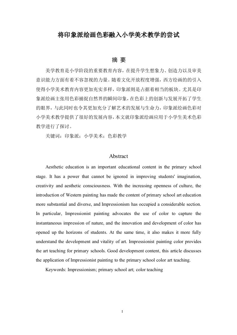 将印象派绘画色彩融入小学美术教学的尝试摘要美学教育是小学阶段的重要教育内容,在提升学生想象力、创造力以及审美意识能力方面有着不容忽视的力量。随着文化开放程度增强,西方绘画的的引入使得小学美术教育内容更加充实多样,印象派则是占据着相当的板块。尤其是印象派绘画主张用色彩捕捉自然界的瞬间印象,在色彩上的创新与发展开拓了学生的眼界,与此同时也令其更加充分了解艺术的发展与生命力,印象派绘画色彩对小学美术教学提供了很好的发展内容,本文就印象派绘画应用于小学生美术色彩教学进行了探讨。关键词:印象派:小学美术:色彩教学AbstractAesthetic education is an important educational content in the primary schoolstage.It has a power that cannot be ignored in improving students'imagination,creativity and aesthetic consciousness.With the increasing openness of culture,theintroduction of Western painting has made the content of primary school art educationmore substantial and diverse,and Impressionism has occupied a considerable section.In particular,Impressionist painting advocates the use of color to capture theinstantaneous impression of nature,and the innovation and development of color hasopened up the horizons of students.At the same time,it also makes it more fullyunderstand the development and vitality of art.Impressionist painting color providesthe art teaching for primary schools.Good development content,this article discussesthe application of Impressionist painting to the primary school color art teaching.Keywords:Impressionism;primary school art;color teachingI目录..............引言…一、印象派绘画色彩概述…二、印象派绘画色彩对小学美术教学的价值分析2(一)小学美术色彩教学的目标.…21.提高眼力,培养美感.…22.提高艺术创造力3(二)印象派绘画色彩对小学美术教学的价值3三、印象派绘画色彩教学应用4(一)小学生美术色彩欣赏创新实践性主题教学.4(二)创新实践型美术欣赏教学设计4(三)教学实践过程需要注意的问题1.注意因材施教2.比较性学习53.调创新意识…四、结论参考文献引言小学时代是学生发展的重要时期,时期个性、思维等的关键形成阶段,对其综合素质的培养尤为重要。美术教育对学生专业素质培养以及全面发展有着不可或缺的影响力。而色彩教学则是美术教学的重要内容之一,其独特性将在很大程度上影响学生的审美能力。色彩作为绘画创作的最基础的一种元素,具有强烈的表现力和强大的感染力,它可以将感情信号直接的展现给观众们,所以说色彩的运用技术是学生们必须掌握的一种基本绘画语言。想要熟练地掌握色彩的奥秘,必须真正的了解和体会色彩的传达给你的信息,拥有一定的色彩素养,为以后的学习和训练打好坚实的基础。在小学美术教育中,对印象派绘画色彩的表现力的了解,以及对其所揭示的自然发展规律和趋势的把握尤为重要。去引导学生在实践中体会自然之美、生活之美,并使其学会更好的理解运用色彩语言是当前小学美术教育的关键之一。本文致力于研究印象派绘画色彩融入小学生美术教学的价值和方法,以期为美术教学实践提供有价值的参考。一、印象派绘画色彩概述美术的发展历史从世界的范围来看,印象派的作品在整个历史中都占有独特的角色,它通过对色彩和光的控制熟练地运用其中的变化,从而促进了美术的发展。印象派的画家对古典主义创作时常用的“酱油调子”技艺进行了摒弃,创作出了自己新的绘画手法,运用事物和色彩、色彩和色彩之间的渗透、影响而展现了大自然中颜色变化的奥秘(例如图1-1)。印象主义派的写意方式和中国画作的绘画方式如出一辙,中国的艺术表达的精髓就是“书写性”。中国的古老传统艺术文化对书写有着硬性的标准,通过对线条的严谨把握和力度的要求,从而表现出中国艺术创作的画面痕迹。例如,雷诺阿的《穿着露颈装的Jeanne Samary》(图1-2),绘画者在画作中运用多种颜色的对比和补充,体现出了一种随意但是精致的美感,这幅画对于色彩的运用达到了极高的水平。印象派的画家是最先运用色彩和光进行创作的先驱,是色彩使用的开创者。他们通过运用颜色的相互补充而达到了更加高的效果。颜色在画作中不但展现出了形体而且处于主要地位,并且在艺术创作中有珍贵独立的价值。