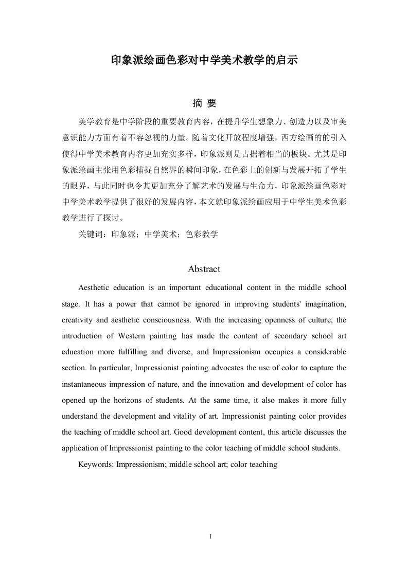 印象派绘画色彩对中学美术教学的启示摘要美学教育是中学阶段的重要教育内容,在提升学生想象力、创造力以及审美意识能力方面有着不容忽视的力量。随着文化开放程度增强,西方绘画的的引入使得中学美术教育内容更加充实多样,印象派则是占据着相当的板块。尤其是印象派绘画主张用色彩捕捉自然界的瞬间印象,在色彩上的创新与发展开拓了学生的眼界,与此同时也令其更加充分了解艺术的发展与生命力,印象派绘画色彩对中学美术教学提供了很好的发展内容,本文就印象派绘画应用于中学生美术色彩教学进行了探讨。关键词:印象派:中学美术:色彩教学AbstractAesthetic education is an important educational content in the middle schoolstage.It has a power that cannot be ignored in improving students'imagination,creativity and aesthetic consciousness.With the increasing openness of culture,theintroduction of Western painting has made the content of secondary school arteducation more fulfilling and diverse,and Impressionism occupies a considerablesection.In particular,Impressionist painting advocates the use of color to capture theinstantaneous impression of nature,and the innovation and development of color hasopened up the horizons of students.At the same time,it also makes it more fullyunderstand the development and vitality of art.Impressionist painting color providesthe teaching of middle school art.Good development content,this article discusses theapplication of Impressionist painting to the color teaching of middle school students.Keywords:Impressionism;middle school art;color teachingI目录Abstract…引言…一、印象派绘画色彩概述(一)印象派简述(二)印象派绘画色彩2二、印象派绘画色彩对中学美术教学的价值分析…(一)中学美术色彩教学的目标31.提高眼力,培养美感.…2.提高艺术创造力.4(二)印象派绘画色彩对中学美术教学的价值4三、印象派绘画色彩教学应用.5(一)中学生美术色彩欣赏创新实践性主题教学(二)创新实践型美术欣赏教学设计(三)教学实践过程需要注意的问题1.注意因材施教.…2.比较性学习..63.调创新意识7参考文献.7引言中学时代是学生发展的重要时期,时期个性、思维等的关键形成阶段,对其综合素质的培养尤为重要。美术教育对学生专业素质培养以及全面发展有着不可或缺的影响力。而色彩教学则是美术教学的重要内容之一,其独特性将在很大程度上影响学生的审美能力。色彩作为绘画创作的最基础的一种元素,具有强烈的表现力和强大的感染力,它可以将感情信号直接的展现给观众们,所以说色彩的运用技术是学生们必须掌握的一种基本绘画语言。想要熟练地掌握色彩的奥秘,必须真正的了解和体会色彩的传达给你的信息,拥有一定的色彩素养,为以后的学习和训练打好坚实的基础。所以,在日常教学中一定要非常注意培养学生的审美能力和颜色素养,不能一味地进行绘画技能训练,创作创新精神更加需要注重培养并让他们将这些精神融入到生活中去。在中学美术教育中,对印象派绘画色彩的表现力的了解,以及对其所揭示的自然发展规律和趋势的把握尤为重要。去引导学生在实践中体会自然之美、生活之美,并使其学会更好的理解运用色彩语言是当前中学美术教育的关键之一。本文致力于研究印象派绘画色彩融入中学生美术教学的价值和方法,以期为美术教学实践提供有价值的参考。一、印象派绘画色彩概述(一)印象派简述印象派绘画是在19世纪下半时期出现的,最初出现在法国,并在欧洲快速发展最后影响了全世界的印象主义绘画现象。代表人物有马奈、德加、莫奈、毕沙罗、雷诺阿、西斯莱等,由于当时这批独特的画作并没有被主流的官方沙龙展所认可,所以这些有着独特的思考和自己独特的作画特点的艺术家最初只有在巴黎的闹市区举行了名叫“无名艺术家展”的画展,而莫奈的《日出的印象》这幅画更被保守的批评家嘲笑,将它评论为“印象派画展”。印象派的画作在创作时与当时的科学成就相结合,画家通过直接观察物体并将自己的切身感受体现在了画布上。