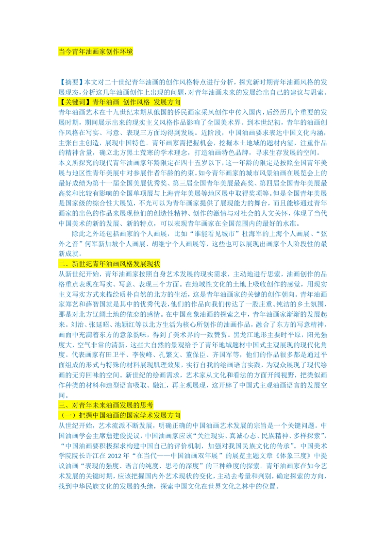 当今青年油画家创作环境【摘要】本文对二十世纪青年油画的创作风格特点进行分析,探究新时期青年油画风格的发展现态,分析这几年油画创作上出现的问题,对青年油画未来的发展给出自己的建议与思索。【关键词】青年油画创作风格发展方向青年油画艺术在十九世纪末期从俄国的侨民画家采风创作中传入国内,后经历几个重要的发展时期,期间展示出来的现实主义风格作品影响了全国美术界。到本世纪初,青年的油画创作风格在写实、写意、表现三方面均得到发展。近阶段,中国油画要求表达中国文化内涵,主张自主创造,展现中国特色。青年画家需把握机会,挖掘本土地域的题材内函,注重作品的精神含量,确立北方黑土荒寒的学术理念,打造油画特色品牌,寻求生存发展的空间。本文所探究的现代青年油画家年龄限定在四十五岁以下,这一年龄的限定是按照全国青年美展与地区性青年美展中对参展作者年龄的约束。如今青年画家的城市风景油画在展览会上的最好成绩为第十一届全国美展优秀奖、第三届全国青年美展最高奖、第四届全国青年美展最高奖和比较有影响的全国单项展与上海青年美展等地区展中取得奖项等。但是全国青年美展是国家级的综合性大展览,不光可以为青年画家提供了展现能力的舞台,而且能够通过青年画家的出色的作品来展现他们的创造性精神、创作的激情与对社会的人文关怀,体现了当代中国美术的新的发展、新的特点,可以表现青年画家在全国范围内的最好的水准除此之外还包括画家的个人画展,比如“谁能看见城市”杜海军的上海个人画展、“弦外之音”何军新加坡个人画展、胡继宁个人画展等,这些也可以展现出画家个人阶段性的最新成就。二、新世纪青年油画风格发展现状从新世纪开始,青年油画家按照自身艺术发展的现实需求,主动地进行思索,油画创作的品格重点表现在写实、写意、表现三个方面。在地域性文化的土地上吸收创作的感觉,用现实主义写实方式来描绘质朴自然的北方的生活,这是青年油画家的关键的创作朝向。青年油画家郑艺和薛智国就是其中的优秀代表,他们的作品向我们传达了一股庄重、纯洁的乡土氛围,那是对北方辽阔土地的依恋的感情。在中国意象油画的探索之中,青年油画家渐渐的发展起来。刘治、张延昭、池颗红等以北方生活为核心所创作的油画作品,融合了东方的写意精神,画面中充满着东方的意象韵味,得到了美术界的一致赞赏。黑龙江地形主要时平原,阳光强度大,空气非常的清新,这些大自然的景观给予了青年地域题材中国式主观展现的现代化角度。代表画家有田卫平、李俊峰、孔繁文、董保臣、齐国军等,他们的作品很多都是通过平面组成的形式与特殊的材料展现肌理效果,实行自我的绘画语言实践,为观众展现了现代绘画的无穷回味的空间。新世纪的绘画需求,艺术家从文化和看法的方面开阔视野,把类似画作种类的材料和造型语言吸取、融汇,再主观展现,这开辟了中国式主观油画语言的发展空间。三、对青年未来油画发展的思考(一)把握中国油画的国家学术发展方向从世纪开始,艺术流派不断发展,明确正确的中国油画艺术发展的宗旨是一个关键问题。中国油画学会主席詹建俊提议,中国油画家应该“关注现实、真诚心态、民族精神、多样探索”,“中国油画要积极探求构建中国自己的评价机制,加强对我国民族文化的传承”。中国美术学院院长许江在2012年“在当代一一中国油画双年展”的展览主题文章《体象三度》中提议油画“表现的强度、语言的纯度、思考的深度”的三种维度的探索。青年油画家在如今艺术发展的关键时期,应该把握国内外艺术现状的变化,主动去考量和判别,确定探索的方向,找到中华民族文化的发展的头绪,探索中国文化在世界文化之林中的位置。(三)借鉴兄弟边疆省区油画发展的成功经验,思考青年油画的发展方向广西、内蒙古和黑龙江这三个省份分别属于西南、西北、东北,刚好都是中国版图上的边界地带,兄弟省份的油画创作发展经验能够参考和借鉴。二十世纪九十年代之前,广西油画和黑龙江油画的发展历程非常的相似。在新世纪之后,广西油画界发现了缺点,认真探索了广西的地域性特色,吸收亚热带漓江地貌的山水画的境界美与油画的语言互相联结,创造出拥有明确地域特色的“南方风景”。在此之后,出现了大量的适合时代的需求,拥有明显的地域性特色的作品。广西油画找寻到了正确的创作方向之后,持续的推出以“亚热带、大漓江、南方”为主题的作品展览,展现了广西特别的地域特色与多民族的地域文化特色,创建大离江油画品牌,在国内最近一段时间的画展之中不新的获得奖项,被油画同行所羡慕。内蒙古自治区地跨中国西北、北方的很大一部分地界,地貌文化资源丰厚。以妥木斯为代表的内蒙古油画家把牧区生活作为主题,把草原作为创作的元素,采取纯洁的油画语言,展现高超的作画技巧,表现个性的写意语言,创造别具一格的草原主题作品。内蒙古画家不随波逐流,几乎不受到外界的扰乱,作品的主题掌控十分确切,形成了影响了全国的具备蒙古族特点的草原画派。在以上省份之外,各地区按照自身的文化发展目标,颁布了很多扶持与奖励的政策。内蒙古创立了年度创作大奖,给艺术家提供创作的资金与荣誉的表彰