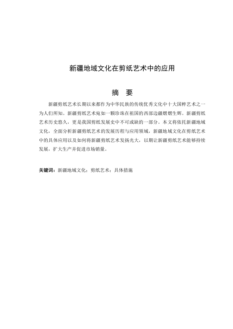 新疆地域文化在剪纸艺术中的应用摘要新疆剪纸艺术长期以来都作为中华民族的传统优秀文化中十大国粹艺术之一为人们所知。新疆剪纸艺术宛如一颗珍珠在祖国的西部边疆熠熠生辉。新疆剪纸艺术历史悠久,更是我国剪纸发展史中不可或缺的一部分。本文将依托新疆地域文化,全面分析新疆剪纸艺术的发展历程与应用领域,新疆地域文化在剪纸艺术中的具体应用以及如何将新疆剪纸艺术发扬光大,以期让新疆剪纸艺术能够持续发展,扩大生产并促进市场销量。关键词:新疆地域文化:剪纸艺术:具体措施The Application of Xinjiang Regional Culture inPaper-cut ArtTHE APPLICATION OF XINJIANG REGIONALCULTURE IN PAPER-CUT ARTXinjiang paper-cut art has long been known as one of the top ten quintessential Chinese arts inChinese traditional culture.Xinjiang paper-cut art is like a pearl shining in the western frontier ofthe motherland.Xinjiang paper-cut art has a long history and is an indispensable part of the historyof Chinese paper-cut.Based on xinjiang regional culture,this paper will comprehensively analyzethe development process and application field of xinjiang paper-cut art,the specific application ofxinjiang regional culture in paper-cut art and how to carry forward xinjiang paper-cut art,so as tomake xinjiang paper-cut art sustainable development,expand production and promote market sales.Key words:xinjiang regional culture;Paper cutting;Specific measures目录引言第一部分课题分析一、剪纸艺术的国内外设计现状。。。。。。。2二、剪纸艺术的设计方向...三、剪纸艺术的设计思路...3四、剪纸艺术的设计意图4第二部分课题分析5一、趋势调查..5二、处境调查…6第三部分方案绘制与设计提案7二、设计系列草图/设计过程展现..713四、最终成果展示(视频/图片)19五、周边产品设计及策展图23第四部分延展性课题分析24一、创作经验分析24二、未解决的问题24结论25参考文献2627
