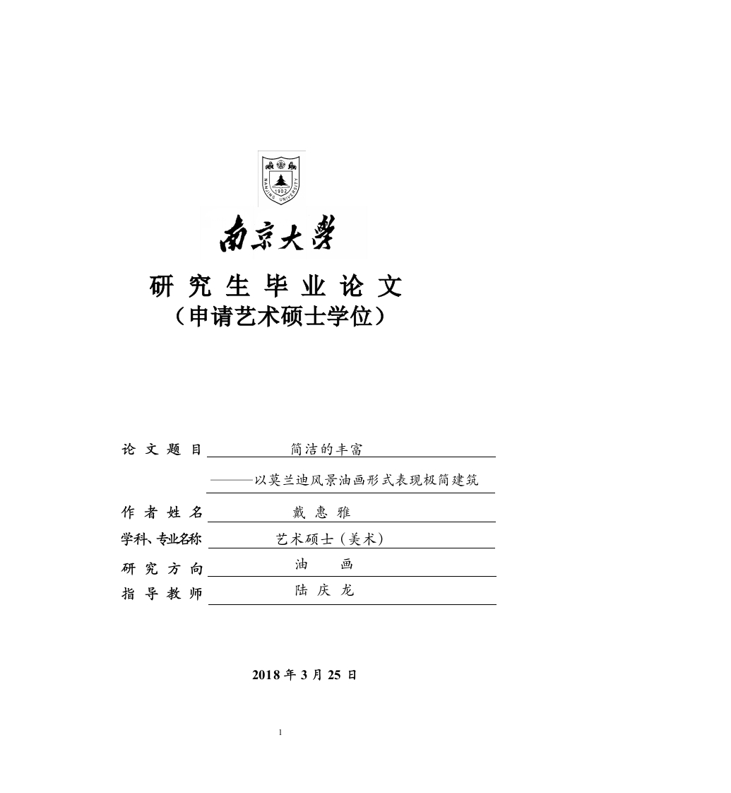 研究生毕业论文(申请艺术硕士学位)论文题目简洁的丰富以莫兰迪风景油画形式表现极简建筑作者姓名戴惠雅学科专业名称艺术硕士(美术)研究方向油画指导教师陆庆龙2018年3月25日1学号:MP1516005论文答辩日期:2018年4月12日指导教师:(签字)2南京大学研究生毕业论文中文摘要首页用纸毕业论文题目:简洁的丰富一一以莫兰迪风景油画形式表现极简建筑2015级硕士生姓名:戴惠雅指导教师(姓名、职称)陆庆龙副教授中文摘要本论文围绕乔治莫兰迪的艺术特征对我毕业创作的影响开展,阐释了我的创作体会。乔治·莫兰迪(Giorgio Morandi,.1890-1964)作为20世纪最具影响力的画家之一,其凭借强烈个人化的特征被我们关注,通过精致的笔触与巧妙色彩诠释事物的简洁魅力。阿尔瓦罗·西扎(Alvaro Siza,1933-),著名的葡萄牙建筑设计师,用简洁的形式表现建筑内在的丰富性,这种“简洁的丰富”与莫兰迪的绘画风格异曲同工。本文旨在通过研究阿尔瓦罗·西扎、密斯范德罗等建筑设计师的作品,从建筑外形特征、材料运用及功能性等方面分析极简建筑的特色,体会极简建筑之美。探究提炼此类建筑中与乔治·莫兰迪艺术特征的共同点,并结合莫兰迪风景油画的创作技法,将极简建筑表现在油画创作中,通过造型的塑造、色彩的处理,突出画面的简约美,营造宁静、平和的画面氛围。关键词:莫兰迪西扎极简建筑设计风景油画