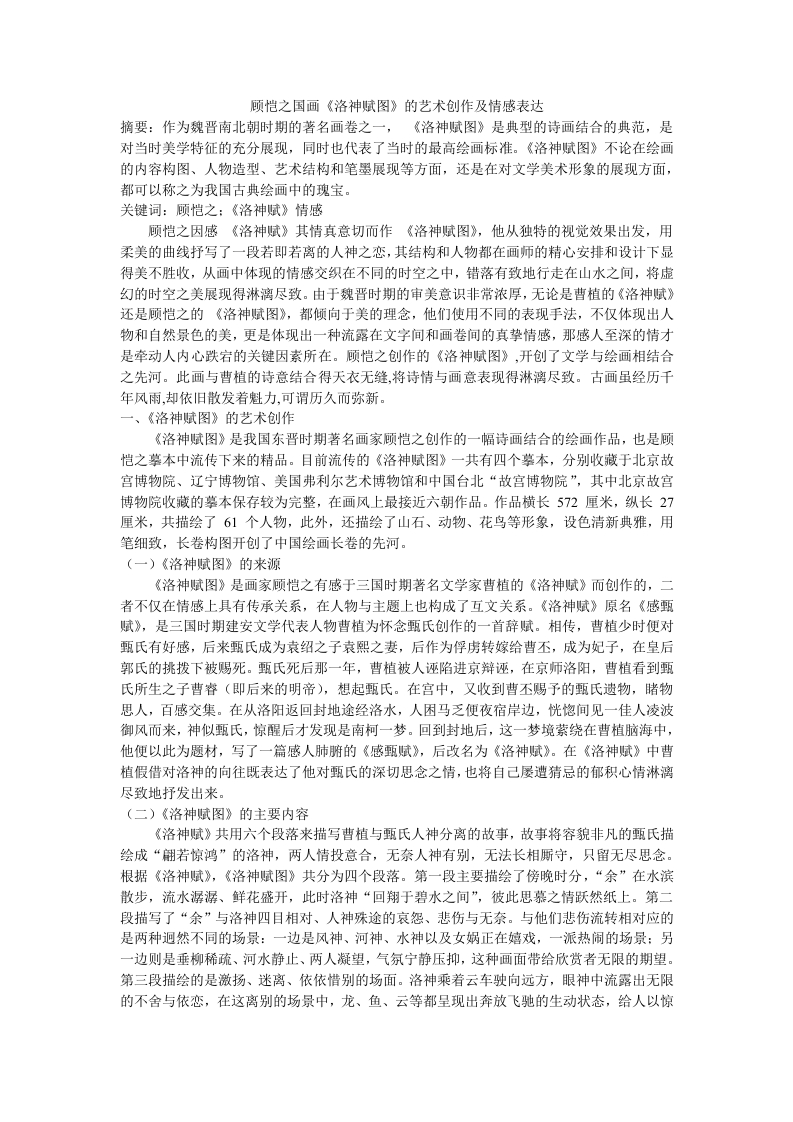 顾恺之国画《洛神赋图》的艺术创作及情感表达摘要:作为魏晋南北朝时期的著名画卷之一,《洛神赋图》是典型的诗画结合的典范,是对当时美学特征的充分展现,同时也代表了当时的最高绘画标准。《洛神赋图》不论在绘画的内容构图、人物造型、艺术结构和笔墨展现等方面,还是在对文学美术形象的展现方面,都可以称之为我国古典绘画中的瑰宝。关键词:顾恺之:《洛神赋》情感顾恺之因感《洛神赋》其情真意切而作《洛神赋图》,他从独特的视觉效果出发,用柔美的曲线抒写了一段若即若离的人神之恋,其结构和人物都在画师的精心安排和设计下显得美不胜收,从画中体现的情感交织在不同的时空之中,错落有致地行走在山水之间,将虚幻的时空之美展现得淋漓尽致。由于魏晋时期的审美意识非常浓厚,无论是曹植的《洛神赋》还是顾恺之的《洛神赋图》,都倾向于美的理念,他们使用不同的表现手法,不仅体现出人物和自然景色的美,更是体现出一种流露在文字间和画卷间的真挚情感,那感人至深的情才是牵动人内心跌宕的关键因素所在。顾恺之创作的《洛神赋图》,开创了文学与绘画相结合之先河。此画与曹植的诗意结合得天衣无缝,将诗情与画意表现得淋漓尽致。古画虽经历千年风雨,却依旧散发着魁力,可谓历久而弥新。一、《洛神赋图》的艺术创作《洛神赋图》是我国东晋时期著名画家顾恺之创作的一幅诗画结合的绘画作品,也是顾恺之墓本中流传下来的精品。目前流传的《洛神赋图》一共有四个墓本,分别收藏于北京故宫博物院、辽宁博物馆、美国弗利尔艺术博物馆和中国台北“故宫博物院”,其中北京故宫博物院收藏的墓本保存较为完整,在画风上最接近六朝作品。作品横长572厘米,纵长27厘米,共描绘了61个人物,此外,还描绘了山石、动物、花鸟等形象,设色清新典雅,用笔细致,长卷构图开创了中国绘画长卷的先河。(一)《洛神赋图》的来源《洛神赋图》是画家顾恺之有感于三国时期著名文学家曹植的《洛神赋》而创作的,二者不仅在情感上具有传承关系,在人物与主题上也构成了互文关系。《洛神赋》原名《感甄赋》,是三国时期建安文学代表人物曹植为怀念甄氏创作的一首辞赋。相传,曹植少时便对甄氏有好感,后来甄氏成为袁绍之子袁熙之妻,后作为俘虏转嫁给曹不,成为妃子,在皇后郭氏的桃拨下被赐死。甄氏死后那一年,曹植被人诬陷进京辩诬,在京师洛阳,曹植看到甄氏所生之子曹睿(即后来的明帝),想起甄氏。在宫中,又收到曹不赐予的甄氏遗物,睹物思人,百感交集。在从洛阳返回封地途经洛水,人困马乏便夜宿岸边,恍惚间见一佳人凌波御风而来,神似甄氏,惊醒后才发现是南柯一梦。回到封地后,这一梦境萦绕在曹植脑海中,他便以此为题材,写了一篇感人肺腑的《感甄赋》,后改名为《洛神赋》。在《洛神赋》中曹植假借对洛神的向往既表达了他对甄氏的深切思念之情,也将自己屡遭猜忌的郁积心情淋漓尽致地抒发出来。(二)《洛神赋图》的主要内容《洛神赋》共用六个段落来描写曹植与甄氏人神分离的故事,故事将容貌非凡的甄氏描绘成“翩若惊鸿”的洛神,两人情投意合,无奈人神有别,无法长相厮守,只留无尽思念。根据《洛神赋》,《洛神赋图》共分为四个段落。第一段主要描绘了傍晚时分,“余”在水滨散步,流水潺潺、鲜花盛开,此时洛神“回翔于碧水之间”,彼此思慕之情跃然纸上。第二段描写了“余”与洛神四目相对、人神殊途的哀怨、悲伤与无奈。与他们悲伤流转相对应的是两种迥然不同的场景:一边是风神、河神、水神以及女娲正在嬉戏,一派热闹的场景:另一边则是垂柳稀疏、河水静止、两人凝望,气氛宁静压抑,这种画面带给欣赏者无限的期望。第三段描绘的是激扬、迷离、依依惜别的场面。洛神乘着云车驶向远方,眼神中流露出无限的不舍与依恋,在这离别的场景中,龙、鱼、云等都呈现出奔放飞驰的生动状态,给人以惊心动魄之感,悲剧情感达到高峰,场景催人泪下。第四段描绘了洛神离去后,“余”急忙追赶已不见佳人影踪,“夜耿耿而不寐,沾繁霜而至曙”,这种深深的思念之情跃然纸上。二、《洛神赋图》中的情感表达(一)悲剧情感的传承《洛神赋》原名《感甄赋》,是曹魏文学代表人物曹植为怀念甄氏所作,甄氏原为袁绍儿子袁熙的妻子,后与曹植产生情愫,却被曹丕抢走,纳为己有,而后由于皇后郭氏挑拨又失宠于皇帝,最终被赐死,终年40岁甄后死的那年,曹植到洛阳朝见哥哥。甄氏生的太子曹睿培皇叔吃饭。曹植看着侄子,想起甄后之死,心中酸楚无比。饭后,曹不将甄氏的遗物玉镂金带枕送给了曹植。曹植睹物思人,在返回封地时,夜宿舟中,恍惚之间,遥见甄妃凌波御风而来,曹植一惊而醒,原来是南柯一梦。回到鄄城,曹植脑海里还在翻腾着与甄后洛水相遇的情景,于是文思激荡,写了一篇《感甄赋》。四年后,明帝曹睿继位,因觉原赋名字不雅,遂改为《洛神赋》。由于此赋的影向,加上人们感动于曹植与甄氏的恋爱悲剧,故口口相传,便把甄氏认定成洛神了。《洛神赋》中洛神的容貌体态、穿戴乘骑、左右随从用了大量篇幅,后与曹植相遇后,曹植的既专注又惊讶,内心激动外表矜持的复杂心情更是衬托了洛神的美貌。而这些超长的篇幅、美丽的辞藻却将后面的悲剧气氛渲染的更为沉重,悲剧结尾的序曲,表达