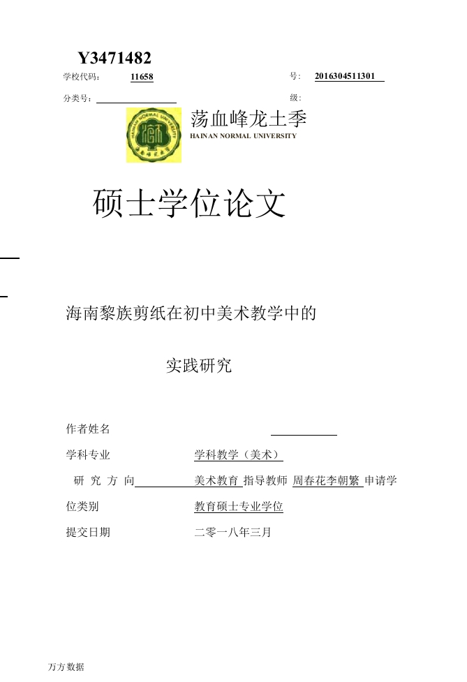 Y3471482学校代码:11658号:2016304511301分类号:级荡血峰龙土季硕士学位论文海南黎族剪纸在初中美术教学中的实践研究作者姓名学科专业学科教学(美术)研究方向美术教育指导教师周春花李朝繁申请学位类别教育硕士专业学位提交日期二零一八年三月万方数据Y3471482学校代码:11658学号:2016304511301分类号:密级:无硕士学位论文海南黎族剪纸在初中美术教学中的实践研究作者姓名任天然学科专业学科教学(美术)研究方向美术教育指导教师周春花李朝繁申请学位类别教育硕士专业学位提交日期二零一八年三月The Practical Research on Hainanese Li万方数据Nationality's Paper-Cutting in the Middle School ArtTeachingA Dissertation Submitted for the Degree of MasterCandidate:Ren TianranSupervisor:Prof.Zhou ChunhuaLi ChaofanHainan Normal UniversityHaikou,China万方数据