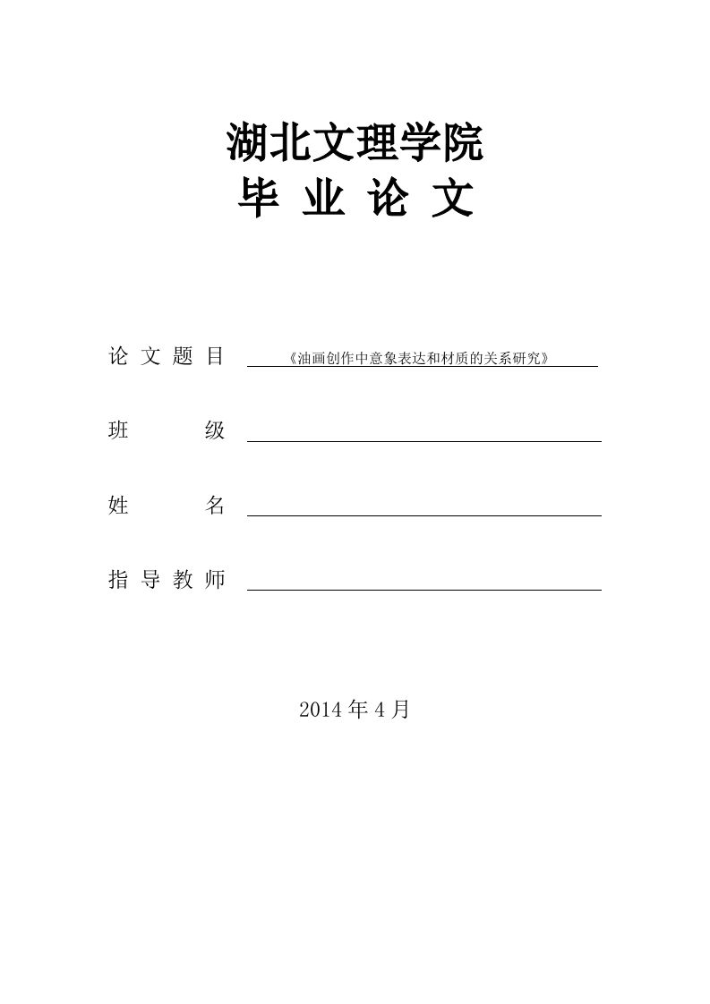 湖北文理学院毕业论文论文题目《油画创作中意象表达和材质的关系研究》班级姓名指导教师2014年4月中文摘要油画的发展已经在我们的社会文化生活中占据了一定重要的作用,意象油画的发生与演变是世界艺术史基因的一次突变。它是中国传统哲学、美学精神通过油画这一艺术表现语言,创造再现的表现。它不单是主观的精神感受,同时包含了对物象的表现。意象油画鲜明的地表达了意象和油画东西交融的特点,是中华民族透析自然意象的思维方式和叙述经验投射转换到油画语言的审美结构中而形成的国际文化身份。在创作观念上,追求“身与事接而境生,境与身接而情生”的审美品格。在创作过程中,提炼对审美客体的直觉感悟,达到“以意构境、以意造型、以意生色”天人合一的状态。因此在油画的创作中油画的材质是有一定的重要意义的。本篇论文的主要内容就是针对意象油画的分析,以及意象油画的创作灵感进行剖析,从而得到意象油画和油画的材质之间有怎么样的关系。一方面就是意象油画的创作灵感都是来自于生活:另一方面就是意象油画的油画作品和普通油画的油画作品有什么样的区别,最后就是意象油画作品对于材质要求的关系。因此意象油画的创作作品不仅仅只有灵感的来源还需要有合适的材质与其相互配合。关键词:油画创作油画材质意向表达AbstractThe development of oil painting has occupied a certain important role in oursocial cultural life,occurrence and development of image oil painting is amutation of the world art history.It is the aesthetic spirit of traditionalphilosophy,Chinese through painting as an artistic language,createperformance.It is not only a subjective mental experience,also contains theimage performance.Image oil painting vivid expression of oil painting imageand characteristics of the blending of East and West,is the Chinese nationdialysis natural image mode of thinking and narrative experience projectionconversion to the aesthetic structure of the language of painting and theformation of international cultural identity.In the creative concept,the pursuit of"body and things connected habitat health,environment and physical contactand affection"aesthetic character.In the creation process,refining the intuitionof aesthetic object,to the "structure throughout Italy,modelling from meaningto Italy chromophore,"harmony between man and nature of the state.Therefore,oil in the oil painting creation material is has the importantsignificance.The main contents of this paper is to analyze the oil paintingimage analysis,and image oil painting creation inspiration,so as to get a kindof relationship between image oil painting and oil painting materials.On theone hand is the imagery oil painting creation inspiration comes from life;on theother hand is the image oil paintings and ordinary painting paintings what kindof difference,finally is the image oil painting works on the relationship betweenthe material requirements.Therefore the source of imagery oil painting worksnot only inspired also need to have the suitable material and cooperate witheach other.Keywords:Expression of oil painting oil painting material intention