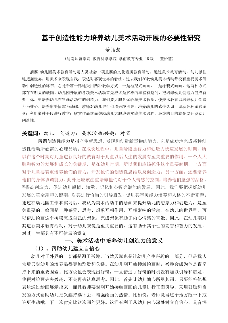 基于创造性能力培养幼儿美术活动开展的必要性研究董怡慧(渭南师范学院教育科学学院学前教育专业15级董怡慧)摘要:幼儿园美术教育活动是人类社会一项重要的文化素质教育活动。通过美术教育活动,幼儿感性地把握世界,用美术来表现自我,表达对客观世界的看法。过去我们在教幼儿美术活动都没有重视美术活动中创造性的环节,总是千篇一律地采用两种教学方式:一是框架式画画,二是涂鸦式画画。这两种方式都存在明显的缺陷。幼儿园开展的各项美术活动首先应该是多样的丰富有趣的,把培养幼儿创造力当成首要目标。要培养幼儿在绘画活动中的创造力,我们要大胆尝试改革美术教学,使美术教育以培养幼儿创造力为核心,培养审美情趣为基础,教师对幼儿进行创造兴趣引导:培养幼儿的感性认识:调动各种感官感受:利用多种手段进行教学:欣赏作品继而鼓励幼儿大胆地去实践美术课程。最终的目的就是要开发幼儿创造性。关键词:幼儿;创造力;美术活动;兴趣;对策所谓创造性能力是指产生新思想,发现和创造新事物的能力,它是成功地完成某种创造性活动所必需的心理品质。在成长过程中,儿童阶段是智力和创造力快速发展的时期,所以在这个时期对儿童进行良好的教育对于儿童以后人生的发展有至关重要的作用。一个人大脑和智力的发展和成长的关键期,是在幼儿时期,所以我们应该抓住这个重要时期,一方面对于儿童要着重培养他们的智力,开发他们的创造性思维以及创造力,另一方面,还要培养他们的身体协调能力,此外还应该注重培养他们对于个人情感的控制,培养他们坚强的品格。山提高创造力,促进幼儿感情、知觉、记忆和心智等潜能的发展。因此,我们要把握好幼儿发展的黄金期和关键期,对其进行恰当的引导启发,促进其审美能力培养和人格的不断完善。通过在幼儿园工作和实习后,我认为美术活动中的绘画来提升幼儿的想象力和创造力,是至关重要的。绘画是一种感受、思考、想象互相作用,互相影响的活动。在幼儿的世界里,可以借助绘画这个桥梁完成自己的想象,完成想象有助于内心情感的宣泄。因此,在幼儿期对其进行美术教育活动,对于幼儿来说是至关重要的,这有助于其个性的完善和智力的发展,对其一生都具有不可估量的意义。一、美术活动中培养幼儿创造力的意义(1)、帮助幼儿建立自信心幼儿对于外界的一切都是源于兴趣。当然天赋也是让幼儿产生兴趣的一部分,但是我认为后天对幼儿的培养显得更加珍贵和关键。在幼儿刚开始接触绘画时,兴趣会成为他是否坚持下来的重要因素。比方说他会表现出好奇,一旦错过了好奇的时机没有加以引导和启发,他便对绘画失去兴趣,不会再去认真思考。因此,首先让幼儿随心所尽其画,只要能将他想表达通过绘画展示出来,而且教师要对刚开始接触画画的儿童进行正面引导,采用鼓励和启发的方式帮助幼儿把兴趣持续下去,增强绘画的热情。比如说,老师觉得这个地方改一下或许更生动哦,下一次肯定比这次画的更好。这样有利于从幼儿内心深处树立自信心,具有深远且持久的影响。自信心是一个人对自我的认可,对自身力量和价值的正确感知。拥有自信心,对幼儿思想感情和行为表现都有促进和调节的作用。幼儿在学习美术过程当中表现出了自己的情感色彩,比如幼儿的视觉系统发育成熟之后他们就会对一些色彩和形状有所偏爱,碰到自己喜欢的颜色和色彩就会比较高兴,碰到自己不喜欢的就会有小情绪,这种情感上的倾向情况在欣赏美术作品过程当中也会有所体现,幼儿看到自己喜欢的美术作品就会感到非常高兴,而且注意力也会比较集中,非常享受美术作品给自己带来的愉悦感。这种情感上的倾向的表达方式和成年人有不一样的地方,幼儿除了在语言上有所表达之外,在行动上也会有所表现。2、促进幼儿感知觉的发展幼儿了解事物、了解世界的的手段,往往是通过最真实直接感知觉比方说摸、闻、听、嗅等。没有一颗去发现的心便没有好的作品,往往优秀的儿童美术作品都是来自于对生活的观察。所以在这种情况下一定要培养幼儿的观察能力,多带幼儿到外界环境当中去体验环境,感受环境,并且教给幼儿一些观察的方法。通过实地的感受可以提高幼儿的观察能力,幼儿观察能力的提升有助于培养幼儿的联想能力以及思维活跃度,提升幼儿的想象力,开发幼儿的大脑和智力水平。同时通过对环境的观察还可以丰富幼儿的眼界,对生活有更多的了解,此外,还可以提高幼儿的视觉敏感性帮,助幼儿对于生活中的色彩形状以及光线等等进行一定的判断,幼儿在美术体验过程中的审美感知主要是来自于视觉神经的感觉,他和我们普通所说的日常感受不太一样,它能够表现出事物的审美特征[2]。审美感知还是主体的一种非常美妙的心理感受,是对现实生活中事物的一种心理表现,通过现实当中实际存在的事物发现其中的规律和特征,从而找到其中的美术学形象。值得一提的是,审美感知并不只有专业人士才具有,普通人只要心智正常都有审美感知,在美术活动中,幼儿敏锐的感知可以帮助他们判断哪些东西具有审美形象,哪些东西没有,从而决定自己对哪些东西表现出情感倾向,他们有自己的审美原则,并深入到每一次艺术美术欣赏和创作中,具体表现为灵魂的有机体。3促进幼儿比较能力发展要提高