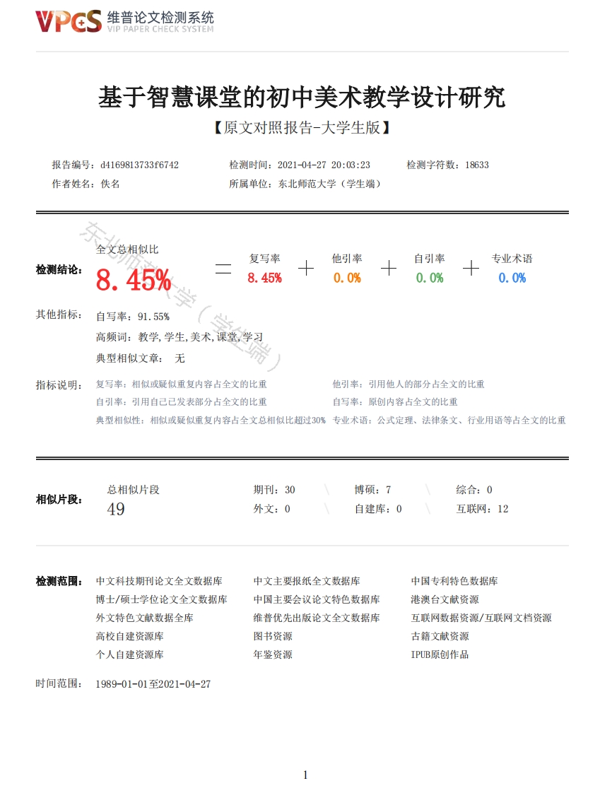 维普论文检测系统VIP PAPER CHECK SYSTEM基于智慧课堂的初中美术教学设计研究【原文对照报告-大学生版】报告编号:d4169813733f6742检测时间:2021-04-2720:03:23检测字符数:18633作者姓名:佚名所属单位:东北师范大学(学生端)全文总相似比复写率他引率自引率专业术语检测结论:8.45%8.45%0.0%0.0%0.0%其他指标:自写率:91.55%高频词:教学,学生,美术,课堂,学习典型相似文章:无指标说明:复写率:相似或疑似重复内容占全文的比重他引率:引用他人的部分占全文的比重自引率:引用自己已发表部分占全文的比重自写率:原创内容占全文的比重典型相似性:相似或疑似重复内容占全文总相似比超过30%专业术语:公式定理、法律条文、行业用语等占全文的比重总相似片段期刊:30博硕:7综合:0相似片段:49外文:0自建库:0互联网:12检测范围:中文科技期刊论文全文数据库中文主要报纸全文数据库中国专利特色数据库博士/硕士学位论文全文数据库中国主要会议论文特色数据库港澳台文献资源外文特色文献数据全库维普优先出版论文全文数据库互联网数据资源/互联网文档资源高校自建资源库图书资源古籍文献资源个人自建资源库年鉴资源IPUB原创作品时间范围:1989-01-01至2021-04-27维普论文检测系统VIP PAPER CHECK SYSTEM原文对照颜色标注说明:■自写片段■复写片段(相似或疑似重复)口引用片段(引用)■专业术语(公式定理、法律条文、行业用语等)学校代码:10200学号:2017012053学学生端)本科毕业论文基于智慧课堂的初中美术教学设计研究Research on junior high school art teaching design based on Smart Classroom学生姓名:王梦琳指导教师:马丹所在学院:美术学院所学专业:美术学(师范)东北师范大学2021年4月独创性声明本人郑重声明:所提交的毕业论文是本人在导师指导下独立进行研究工作所取得的成果。据我所知,除了特别加以标注和致谢的地方外,论文中不包含其他人已经发表或撰写过的研究成果。对本人的研究作出重要贡献的个人和集体,均已在文中做了明确的说明。本声明的法律结果由本人承担。论文作者签名:日期:目录摘要5Abstract61.智慧课堂与初中美术教育教学相关理论概述71.1新媒体的概述71.1.1新媒体教学71.1.2智慧课堂的概念71.1.3智慧课堂的特点71.1.4智慧课堂与美术教育之间的联系71.2初中美术教育教学的学科特点和运行机制82维普论文检测系统VIP PAPER CHECK SYSTEM2.初中美术引入智慧课堂的价值92.1初中美术引入的可行性分析92.1.1从传统课堂到智慧课堂92.1.2智慧课堂与美术审美上的互动性92.1.3美术教学融入智慧课堂的有效性92.1.4智慧课堂在美术教学中的多元化92.2智慧课堂在初中美术教学中的应用价值102.2.1智慧课堂应用于初中美术教学对学生的价值102.2.2智慧课堂应用于初中美术教学对教师的价值103.智慧课堂应用于初中美术的前期分析113.1智慧课堂应用于初中美术的课堂内容113.1.1初中美术教育教学构成因素113.1.2融入智慧课堂的美术教学类型113.1.3智慧课堂下的教学基础条件整合113.1.4新媒体技术下美术教育的新工具应用113.2学习者特征分析114.智慧课堂应用于初中美术的教学设计124.1智慧课堂应用于初中美术的有效教学策略124.1.1课前导入一一激发学生学习兴趣124.1.2预习工作一一建构教学资源共享124.1.3人机互动一一促进教育管理便利124.1.4分组研讨一一提高学生学习成效124.1.5信息反馈一一做线上学习档案袋124.2智慧课堂教学模式在初中美术的运用措施分析134.2.1教学环境层面的运用措施134.2.2教师维度的运用措施134.2.3学生维度的运用措施134.3智慧课堂教学模式在初中美术中的实现路径134.3.1课前:多样化的智慧学习空间提供教学开展的基础134.3.2课中:教学互动形式多样,学习资源海量,强化学生主体地位134.3.3课后:整合学生学习成果,形成过程性学习档案袋134.3.4线上资源作课堂教学内容补充134.4《我的徽章设计与制作》智慧课堂课程案例134.4.1教材教法分析134.4.2教学目标分解154.4.3教学资源整合154.4.4教学过程设计154.4.5学习评价设计154.5智慧课堂应用于初中美术的教学评价15结语17参考文献18摘要当今时代迅速发展,出现了计算机、网络、多媒体等许多新生事物。“信息大轰炸”改变了人们的生活方式,不仅引发了教育界的思想变革,还形成了远程教育、慕课、移动学习等新型教学模式。现代信息技术的飞速发展,计算机网络以及新媒体手段的广泛应用为现代教学提供了极其丰富的信息资源,时至今日,以信息化带动现代化,通过技术支持促进教育发展逐渐成为世界各国发展教育的主流。在当今信息科技大革命的环境下,衍生出许多新兴教学模式形式,其中便有智慧课堂教学模式。2020是命运多3