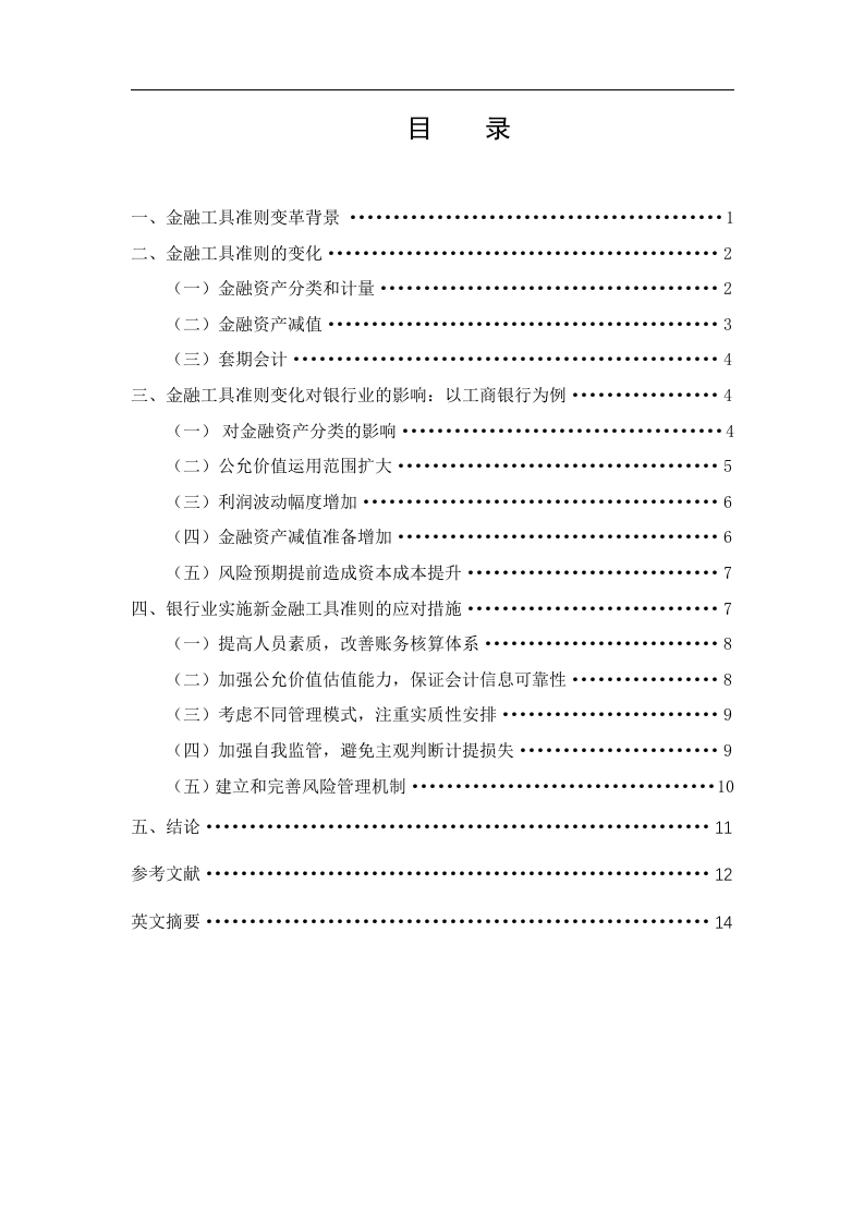 目录一、金融工具准则变革背景·二、金融工具准则的变化(一)金融资产分类和计量··(二)金融资产减值(三)套期会计…三、金融工具准则变化对银行业的影响:以工商银行为例··4(一)对金融资产分类的影响·(二)公允价值运用范围扩大·(三)利润波动幅度增加…(四)金融资产减值准备增加…6(五)风险预期提前造成资本成本提升·7四、银行业实施新金融工具准则的应对措施·7(一)提高人员素质,改善账务核算体系·…8(二)加强公允价值估值能力,保证会计信息可靠性·8(三)考虑不同管理模式,注重实质性安排…9(四)加强自我监管,避免主观判断计提损失·9(五)建立和完普风险管理机制…10五、结论…11参考文献英文摘要…金融工具准则变化对银行业的影响研究以工商银行为例【内容摘要】2017年颁布的新金融工具准则与旧准则相比,发生了实质性的变化,给银行业带来了较为深广的影响。本文经调查相关关于工商银行的案例,对比分析了金融工具准则的变化差异以及对银行业的影响,从而提出了相对应的措施来应对银行方面表示要更新改革金融工具准则。【关键词】金融工具准则:工商银行:金融资产分类:预期损失模型一、金融工具准则变革的背景由于我国与各国的交流日益密切,随之而来的国际化的经济和金融活动需要规范的会计准则,会计准则包含的内容相当之多,其中对金融交易的规范相关的会计准则至关重要。在长久的金融活动过程中,发现在金融活动中很容易会遇到风险,这些问题需要得到有效的控制,但是会计准则不足以精准的计算金融工具,因此出现了金融工具准则这一手段。让准则备受关注的原因,是来自2008年金融危机的冲击。金融危机爆发,使诸多的问题暴露出来,让社会各界对金融市场产生了反思,使人们对修改金融工具准则的愿望高涨。金融工具原有准则在实施过程中具有强烈的主观性、复杂性和顺周期性,影响着金融机构处理的准确性和应对风险的客观性。在此基础上,经过六年来对原标准缺陷的共同讨论,相关标准制定者在各方监督下,完善了金融工具分类、确认和计量的会计准则,并以《国际财务报告准则》为依据来衡量社会各行业对金融资产解决方式的标准。在此背景下,为使我国跟上脚步,并真实解决我国金融资产会计处置相关方面所存在的问题,依据实际情况,在2017年,新的金融工具分类、确认和计量标准被财务部修订并发布,这个通知在2018年1月1日起正式实行准则,这标志着金融行业将迎来新的困难和挑战。新准则对金融工具分类的改变,金融工具的计量方式的调整,对减值模型的变更,都从本质上为金融活动的过程带来了变化。在这其中不仅仅对金融资产会1计处理本身产生影响,还对银行经营中关于风险、管理等方面的变革起到关键性作用。二、金融工具准则的变化金融工具准则的变化内容包括分类与计量、计提减值准备和套期会计等方面。在这些变化中,关于分类、计量与计提减值准备的变化对金融资产有很大影响,具体情况如下。(一)金融资产分类和计量旧的金融工具准测是于2006年正式出台,旧准则分类相对来说比较复杂,定位不够清晰,在分类与计量过程中,会计主体容易找到空隙,根据自身意愿进行定义,从而对其进行操控。因此,新准则中在此方面发生了相应的改动。新准则中,金融资产被分为三部分,依次是公允价值计量、摊余成本计量和公允价值计量这三大类。从上述三块分类当中可以查看出,相较于旧的金融工具准则而言,以公允价值计量这类的金融资产在名称上没有改变,但在实质上,这类金融资产包含的与之前并不完全一样。旧的金融工具准则中,交易性金融资产是被纳入其中的,而在新的金融工具准则中,却将该项替换成了抛去摊余成本的金融资产。图1:新旧准则分类结果对比以摊余成本计量的持有至到期投资金融资产相互重相贷款和应收款项以公允价值计量且分互原有准新准则互下金融其变动计入其他综则下金相重分以公允价值计量且融资产资产分合收益的金融资产分类类互类其变动计入当期损类益的金融资产以公允价值计量且分其变动计入当期损可供出售金融资产益的金融资产旧准则和新准则的分类标准从按主体分类到按收取合同现金流量的标准分