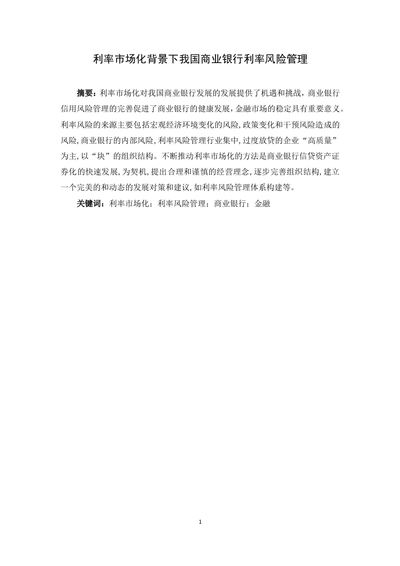 利率市场化背景下我国商业银行利率风险管理摘要:利率市场化对我国商业银行发展的发展提供了机遇和挑战,商业银行信用风险管理的完善促进了商业银行的健康发展,金融市场的稳定具有重要意义。利率风险的来源主要包括宏观经济环境变化的风险,政策变化和干预风险造成的风险,商业银行的内部风险,利率风险管理行业集中,过度放贷的企业“高质量”为主,以“块”的组织结构。不断推动利率市场化的方法是商业银行信贷资产证券化的快速发展,为契机,提出合理和谨慎的经营理念,逐步完善组织结构,建立一个完美的和动态的发展对策和建议,如利率风险管理体系构建等。关键词:利率市场化:利率风险管理:商业银行:金融目录1引言.31.1研究背景和意义.31.2国内外文献综述.31.2.1有关利率市场化方面的研究31.2.2有关利率风险管理方面的研究1.3研究内容与方法…1.3.1主要研究内容…61.3.2主要研究方法…62利率市场化及利率风险管理理论剖析2.1利率市场化概述.62.2利率风险管理策略.72.3国内外的利率市场化进程.…2.3.1国际利率市场化进程.72.3.2我国利率市场化进程…3美国利率市场化及利率风险管理的考察与启示.…3.1美国利率市场化进程考察..93.2美国利率市场化对银行业的影响分析93.2.1利率市场化进程中的经济环境变化93.2.2存款保险制度的完善为利率市场化提供了条件103.2.3促进了各种金融创新的兴起.…103.3国外利率风险管理实践对我国的启示.103.3.1大多数国家都采取了“存款保险”先行的策略…103.3.2大多数国家(地区)的利率市场化都遵循了“循序渐进”的原则.…103.3.3发展金融市场的广度和深度有利于利率市场化改革…113.3.4利率市场化进程需要加强金融监管.114利率市场化背景下我国商业银行利率风险现状分析,..........................................114.1我国商业银行利率风险的现状分析…114.1.1主要面临的风险种类…114.1.2管理利率风险的主要手段.124.2我国商业银行利率风险管理存在的不足..124.2.1利率风险防范方法和手段单一.124.2.2主动式的利率风险管理工具相对欠缺.134.2.3金融市场深度不够.…135利率市场化背景下我国商业银行利率风险防范措施…135.1完善利率风险管理体系…5.2完善商业银行利率预测机制,科学准确预测市场利率.155.3注重商业银行利率风险管理人才队伍的培养15结束语…16参考文献17引言1.1研究背景和意义我们经常会提及“金融自由化”,而利率市场化就是金融自由化的一个重要组成部分,推行利率市场化的必然结果就是利率的频繁波动。虽然利率风险只出现了短短的几十年,但是期间它对金融机构,尤其是存款类金融机构,产生了极大冲击。二十世纪八十年代利率风险造成了美国大批储蓄机构的倒闭。随着利率市场化的推行,存贷利差会逐渐缩小,我国商业银行若是不重视利率风险的管理,便很可能重蹈美国储蓄机构的覆辙。截止2015年,我国将加强对基准利率体系和相关机制的建设,并通过放开替代性金融产品价格等具体措施来推动利率市场化改革。随着国务院颁布的《存款保险条例》于2015年5月1日起正式实施,标志着我国目前已进入利率市场化的关键阶段。但是长期以来,在央行利率管束之下,我国商业银行普遍存在对利率风险管理重视程度不高的现象。因此在改革的大背景下,商业银行对于利率风险管理能力的提升己经变得刻不容缓。利率市场化的积极影响包括:银行能够更有效地吸引闲置资金、实体经济将得到促进和发展等等,但同时,由于利率波动变大,导致金融机构的资产负债结构不够稳定,从而使其经营压力和风险大大增加。众所周知,商业银行作为我国金融行业的排头兵,在我国经济发展中起着至关重要的作用。但是多种金融资产及金额负债为经营主体的商业银行长期处于利率受央行管束的状态,管理水平比较滞后,随着市场化改革步伐不断前进,利率波动日益频繁,加强对利率风险的管理是我国商业银行今后将要面对的课题。虽然我国逐步加强了对利率风险的监管,但是与西方发达国家的管理模式相比仍显不足。当今国际及国内的经济形式不容乐观,深度剖析利率风险对我国商业银行所造成的影响,同时科学地加以防范,并且逐步完善管理模式,具有非常重要的理论及现实意义。1.2国内外文献综述1.2.1有关利率市场化方面的研究国外有关利率市场化方面的研究主要有:从放开利率管制的视角研究利率市场化的必要性。亚当斯密“看不见的手”这一理论打破了政府监管利率这一局面,其针对性地提出政府过度干预市场利率是违背市场规律的,应完全交由市场,这是利率市