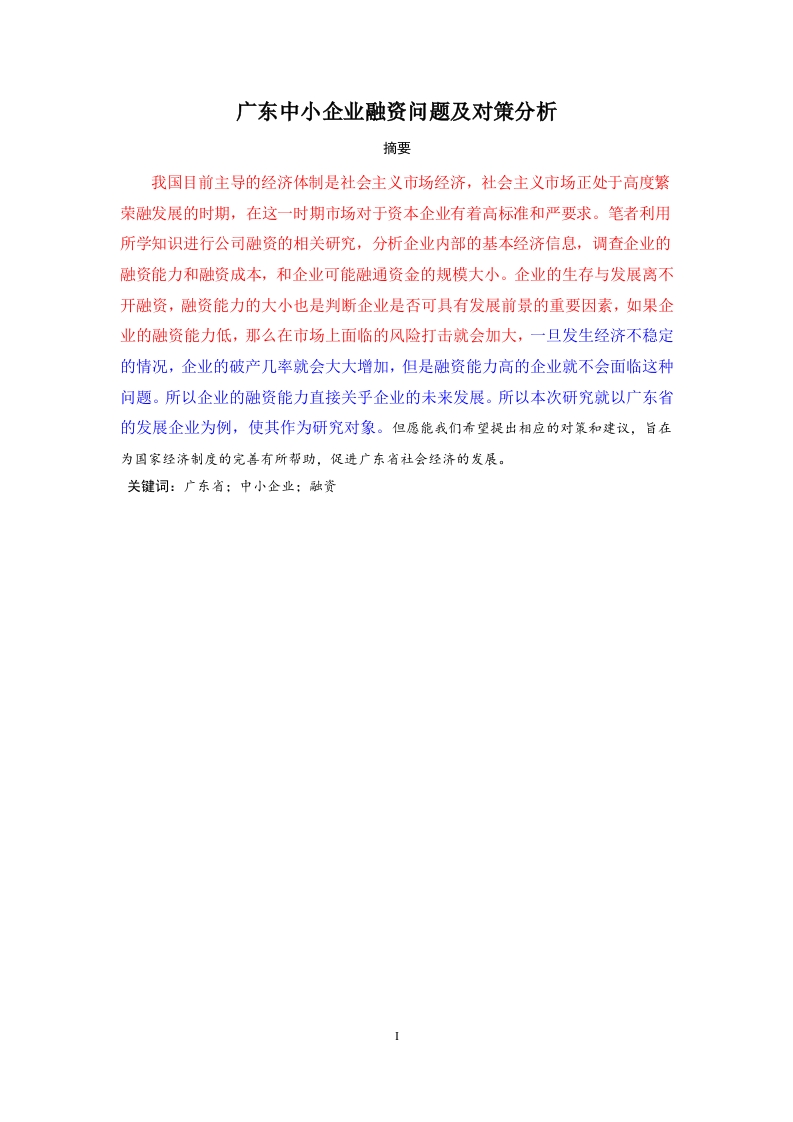 广东中小企业融资问题及对策分析摘要我国目前主导的经济体制是社会主义市场经济,社会主义市场正处于高度繁荣融发展的时期,在这一时期市场对于资本企业有着高标准和严要求。笔者利用所学知识进行公司融资的相关研究,分析企业内部的基本经济信息,调查企业的融资能力和融资成本,和企业可能融通资金的规模大小。企业的生存与发展离不开融资,融资能力的大小也是判断企业是否可具有发展前景的重要因素,如果企业的融资能力低,那么在市场上面临的风险打击就会加大,一旦发生经济不稳定的情况,企业的破产几率就会大大增加,但是融资能力高的企业就不会面临这种问题。所以企业的融资能力直接关乎企业的未来发展。所以本次研究就以广东省的发展企业为例,使其作为研究对象。但愿能我们希望提出相应的对策和建议,旨在为国家经济制度的完善有所帮助,促进广东省社会经济的发展。关键词:广东省:中小企业:融资Abstract:the market economy of our country has got a good development space,and itseconomic income value has also been promoted and improved.promote the country'seconomic development and progress,while showing a positive growth force.Westerndeveloped countries for small and medium-sized enterprise development on the socialand economic system to bring a significant impact in the actual research anddevelopment process also shows full attention.For now,the financing environmentfaced by SMEs in China is more and more serious,and it brings some obstacles to thedevelopment of SMEs in China.This is mainly because the development of small andmedium-sized enterprises in the development process And the imbalance of thefinancing structure of enterprises.Therefore,with the help of this research,the currentsituation of SME financing in Guangdong Province of China is taken as the mainbody of the research.It is hoped that through analyzing the problems of SMEfinancing in Guangdong Province,Countermeasures and suggestions,in order toachieve the national economic system to improve the implementation and promote therapid development of China's social economy.Key words:Guangdong Province,small and medium-sized enterprises,financingsituation目录1.2国内外研究现状..1.2.1国外研究现状...1.2.2国内研究现状..2332中小企业融资相关概述32.1中小企业的含义、作用..32.1.1中小企业的含义...2.1.2中小企业的作用..2.2中小企业融资业务内容52.3中小企业融资特点..3广东中小企业融资现状..·3.1广东中小企业的发展概况...63.1.1企业数量逐年增加....3.1.2就业人数众多..73.1.3企业发展不平衡...73.2广东中小企业融资现状....3.2.1融资渠道以银行借贷为主.·83.2.2融资信用担保出现多种形式..910114.1企业自身问题...114.1.1企业实力不强,融资能力弱.…·11