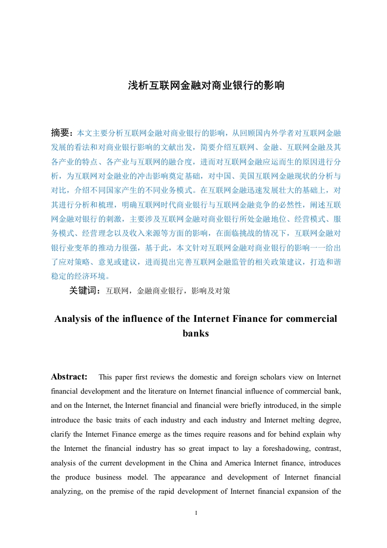 浅析互联网金融对商业银行的影响摘要:本文主要分析互联网金融对商业银行的影响,从回顾国内外学者对互联网金融发展的看法和对商业银行影响的文献出发,简要介绍互联网、金融、互联网金融及其各产业的特点、各产业与互联网的融合度,进而对互联网金融应运而生的原因进行分析,为互联网对金融业的冲击影响奠定基础,对中国、美国互联网金融现状的分析与对比,介绍不同国家产生的不同业务模式。在互联网金融迅速发展壮大的基础上,对其进行分析和梳理,明确互联网时代商业银行与互联网金融竞争的必然性,阐述互联网金融对银行的刺激,主要涉及互联网金融对商业银行所处金融地位、经营模式、服务模式、经营理念以及收入来源等方面的影响,在面临挑战的情况下,互联网金融对银行业变革的推动力很强,基于此,本文针对互联网金融对商业银行的影响一一给出了应对策略、意见或建议,进而提出完善互联网金融监管的相关政策建议,打造和谐稳定的经济环境。关键词:互联网,金融商业银行,影响及对策Analysis of the influence of the Internet Finance for commercialbanksAbstract:This paper first reviews the domestic and foreign scholars view on Internetfinancial development and the literature on Internet financial influence of commercial bank,and on the Internet,the Internet financial and financial were briefly introduced,in the simpleintroduce the basic traits of each industry and each industry and Internet melting degree,clarify the Internet Finance emerge as the times require reasons and for behind explain whythe Internet the financial industry has so great impact to lay a foreshadowing,contrast,analysis of the current development in the China and America Internet finance,introducesthe produce business model.The appearance and development of Internet financialanalyzing,on the premise of the rapid development of Internet financial expansion of thecommercial bank,points out that in the Internet age and the Internet financial company'scompetition is inevitable,to reveal the impact of Internet finance to banks,mainly involvingthe Internet financial impact on commercial banks in which the financial status,businessphilosophy,management mode the service mode,and the source of income,in thesechallenges exist in the environment,the Internet financial boost to the banking reform isvery strong,in view of this,this article in view of the Internet financial impact oncommercial banks one one gives some strategies or constructive comments,and then putforward to perfect the related policy of Internet financial supervision and management,tocreate a harmonious and stable economic environment.The level of social and economicdevelopment is the basis for the development of sports industry and the media,the mediaindustry development connotation of sports also to build the development of emergingindustries.The upcoming 2008 Beijing Olympic Games to the development of the sportsmedia industry in China is a rare opportunity,by reviewing the development of the sportsmedia industry,and the provinces of eastern China (city)for dynamic analysis andcomprehensive evaluation of the level of social and economic development of the socialstructure,economic benefit,the quality of life of the population quality,four categoriesfactors,provide a basis,experience and thinking of countermeasures can be used as areference for development of sports of our country development of the media industry.Key words:The Internet,commercial bank,influence and Countermeasures目录一、绪论二、文献综述(一)因外相关文件综述(二)因内相关文件综述…2三、互联网金融给商业银行的冲击(一)互联网金融对商业银行金融地位的冲击…3(二)互联网金融对商业银行经营理念的冲击一“鲶鱼效应”(三)互联网金融对商业银行服务模式的冲击4四、商业银行对策(一)商业银行应转变经营理念…5(二)据金大数据,进军互联网金融.5参考文献
