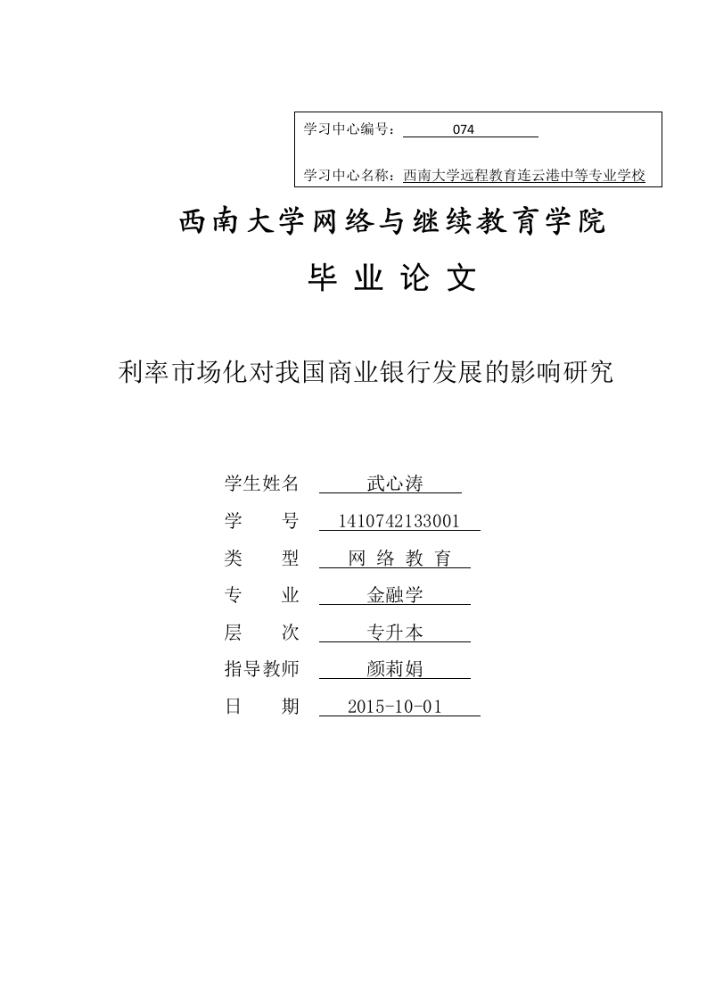 学习中心编号:074学习中心名称:西南大学远程教育连云港中等专业学校西南大学网络与继续教育学院毕业论文利率市场化对我国商业银行发展的影响研究学生姓名武心涛学号1410742133001类型网络教育专业金融学层次专升本指导教师颜莉娟日期2015-10-01目录一、绪论二、利率市场化的基本理论..3三、我国利率市场化改革的必要性(一)从国际实践的角度来看....5(二)从加入T0的角度看.....(三)从外汇管理的角度看...6(四)从中小企业发展的角度看.·6四、利率市场化对商业银行的影响.·910五、商业银行对利率市场化的应对策略..10(一)转型综合服务商业模式,调整收入结构.…10(二)加强金融创新,开拓新的收入渠道..11(三)提高利率定价及风险管理能力。12六、结论…141516利率市场化对我国商业银行发展的影响研究摘要为适应社会主义市场经济体制改革要求,保证央行货币政策的有效性,利率市场化将是我国金融体系改革的方向。加速我国的利率市场化改革的进程中,人们常常将注意力集中在利率改革的重大意义而忽视了改革所可能带来的各种各样风险。客观地来分析,我国推进利率市场化改革的风险和阻碍仍是很大的。利率市场化改革的作用发挥程度是以完整健全的市场机制为前提,因此在利率市场化改革的同时,我们应注意相关配套措施的推进。关键词:利率市场化:商业银行:影响:对策1