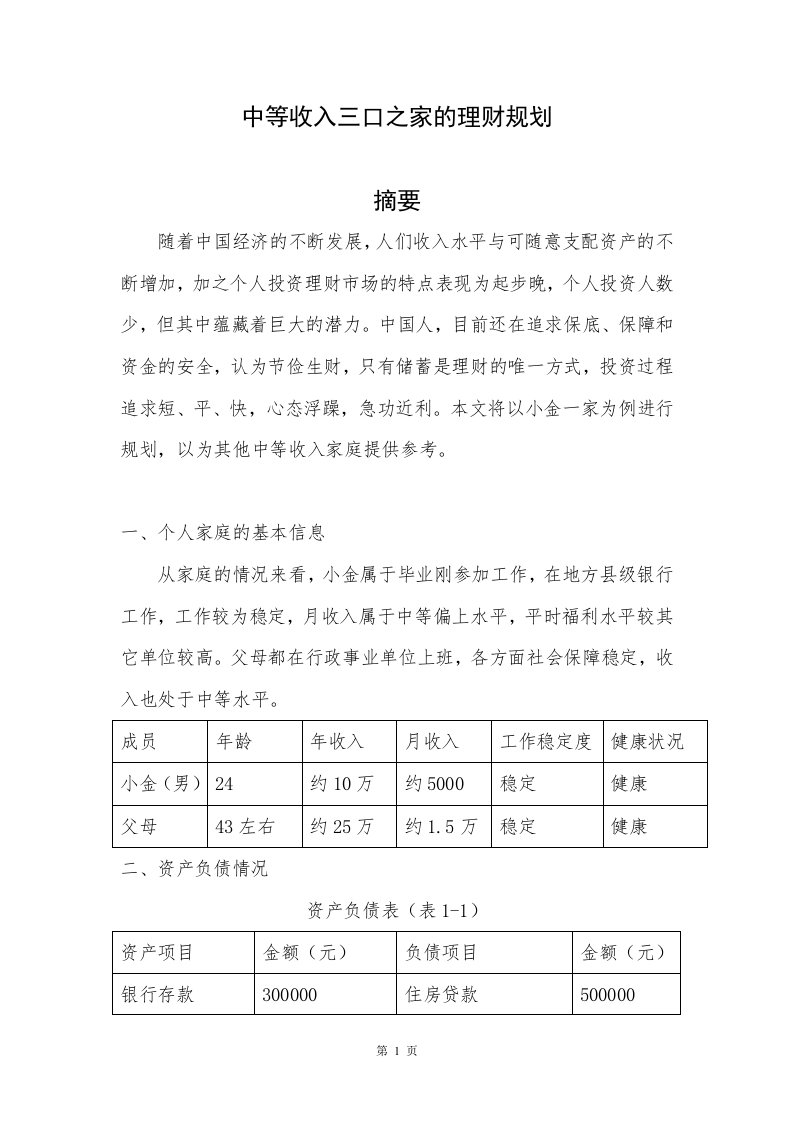 中等收入三口之家的理财规划摘要随着中国经济的不断发展,人们收入水平与可随意支配资产的不断增加,加之个人投资理财市场的特点表现为起步晚,个人投资人数少,但其中蕴藏着巨大的潜力。中国人,目前还在追求保底、保障和资金的安全,认为节俭生财,只有储蓄是理财的唯一方式,投资过程追求短、平、快,心态浮躁,急功近利。本文将以小金一家为例进行规划,以为其他中等收入家庭提供参考。一、个人家庭的基本信息从家庭的情况来看,小金属于毕业刚参加工作,在地方县级银行工作,工作较为稳定,月收入属于中等偏上水平,平时福利水平较其它单位较高。父母都在行政事业单位上班,各方面社会保障稳定,收入也处于中等水平。成员年龄年收入月收入工作稳定度健康状况小金(男)24约10万约5000稳定健康父母43左右约25万约1.5万稳定健康二、资产负债情况资产负债表(表1-1)资产项目金额(元)负债项目金额(元)银行存款300000住房贷款500000第1页保险100001房产1200000汽车100000负债总计:500000净资产:1110000资产总计:1610000负债与净资产总计:1610000从资产负债表中可以看出,不动产中的房产占比比较大,占资产的74.5%,房产是具备升值潜力和保值的,所以房产是资产里最具投资性、最有上升潜力的金融性资产,自用住房属于固定资产,抗风险能力极强,但是流动性极差。金融资产只占总资产的18.6%,并且全部为银行存款,虽然安全性较高,但收益偏低。家庭负担较大数额为住房贷款,负债压力较大。现在的家庭状况偏重于安全性,比较保守。三、现金流量情况现金流量表(表2-1)收入金额(元)占比支出金额占比(元)经常性收入:350500经常性支出:120000工资:35000099.9%基本开支:7000058.4%分红:00%归还房屋贷款:5000041.6%利息:5000.1%收入总计350500100%支出总计120000100%结余230500第2页从现金流量表中可以看出,现在主要收入是以工资为主,现在的支出主要为基本开支和房贷,但结余一年有23万左右,属于家庭中等水平。目前无任何投资风险管理规划,可以进行一些稳定的理财策略。四、财务分析指标比率项目数值状况理想标准基本评价资产负债率0.31良0-0.5负债比例较低,偿债能力很强负债收入比0.14合格0.4收入与负债配比不均衡率流动资产保2.5优3左右支付能力较强,但没用充障率分使流动资产得到有效增值获得收益自由储蓄比0.65良0.6左右现金流基本合理,可用于率投资增加资产规模净资产投资0.27良0.2-0.5投资规模较小,有一定的比率投资空间从以上的各项指标的分析可以看出,家庭的资产质量较好,收入主要来自工资,理财性收入很少,需要理财投资提高收益能力。净资产规模达到111万元,加之每年收入结余23万元,收入状况较为不错,负债比率较低,有很充足的负债空间,如能进行合理的支出规划和投资规划,在未来的中长期内,可以不断的增加投资性收益,实现第3页