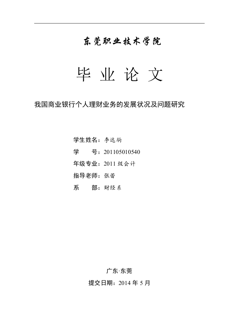 东莞职业技术学院毕业论文我国商业银行个人理财业务的发展状况及问题研究学生姓名:李达驹学号:201105010540年级专业:2011级会计指导老师:张蕾系部:财经系广东·东莞提交日期:2014年5月目录前言我国商业银行个人理财业务的发展现状.2(一)我国商业银行业务的发展历程及其动因…2(二)我国商业银行理财产品运作模式的演进.2二我国商业银行个人理财业务存在问题(一)产品结构的问题(二)风险控制和信用问题(三)从业人员存在的问题三结论与建议策略5(一)产品结构分析…5人员管理.(四)第三方支付平台及对银行个人理财的建议.8结论参考文献致谢9东莞职业技术学院财经系2014届毕业论文我国商业银行个人理财业务的发展状况及问题研究作者:李达驹指导老师:张蕾(东莞职业技术学院2011级财经系,东莞,523808)摘要:随着中国金融市场的开放,个人金融服务己经吸引了众多投资者的关注,并吸引大量外资银行参与市场竞争。在此背景下,探索商业银行个人理财业务的发展战略,可以有效地提高个人金融服务水平和市场竞争力,从而实现自身金融品牌的建立和利润的增长。本文首先介绍了我国商业银行的发展演变,目前对商业银行的发展,导致个人金融业务,在此基础上,个人理财业务在国内外的发展情况进行了介绍,并提出了存在的问题和未来的完美的正确的建议。因此,本文从三个方面介绍了发展的概念,中国的商业银行个人金融服务产品的特点,然后关注、分析、探讨如何解决这些问题,并探讨了个人金融业务的未来发展方向,对促进中国商业银行的市场发展有一定的参考意义。关键词:商业银行:个人理财:问题建议前言在各国商业银行金融创新浪潮中,个人理财业务的发展尤为迅速,引起了各国银行的普遍关注。个人理财业务的发展有助于商业银行利用现有的资源和客户优势,扩大银行创新和发展的空间:可以增加收入来源的商业银行的中间业务,提高银行的盈利能力的整体水平:与传统的资产负债业务更加安全,风险相对较低,提高商业银行的资产和负债结构、有效节约资金筹措成本、更好的自我资本比例限制:同时,促进个人金融商品的设计、银行的销售、传统银行的产品的普及,全面发展银行的业务。因此,各国商业银行都在积极发展个人理财业务,以适应未来金融市场的发展方向,赢得市场利润空间。商业银行个人理财业务在中国的资产管理的发展和提高居民收入的需要,通过提供商业银行的金融服务,为了避免预测经济风险,对未来对财务状况的不安、以及经济的健全成长为下一代的良好基础。一般来说,银行个人资产管理业务有助于改善我国商业银行的服务改善功能的重要突破,商业银行和金融交易所的收益结构。个人金融业务的进一步发展将成为扩大金融服务和增加他们的营业收入对中