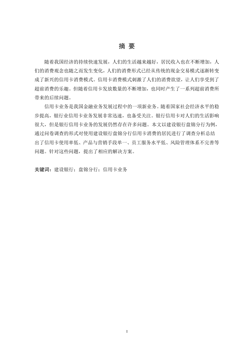 摘要随着我国经济的持续快速发展,人们的生活越来越好,居民收入也在不断增加,人们的消费观念也随之而发生变化,人们的消费形式已经从传统的现金交易模式逐渐转变成了新兴的信用卡消费模式。信用卡消费模式刺激了人们的消费欲望,让人们享受到了超前消费的乐趣。但随着信用卡发放数量的不断增加,也同时产生了一系列超前消费所带来的后续问题。信用卡业务是我国金融业务发展过程中的一项新业务。随着国家社会经济水平的稳步提高,银行业信用卡业务发展非常迅速,也备受关注。银行信用卡对人们的生活影响很大,但是银行信用卡业务的发展仍然存在许多问题。本文以建设银行盘锦分行为例,通过问卷调查的形式对使用建设银行盘锦分行信用卡消费的居民进行了调查分析总结出了信用卡使用率低、产品与营销手段单一、员工服务水平低、风险管理体系不完善等问题。针对这些问题,提出了相应的解决方案。关键词:建设银行:盘锦分行;信用卡业务AbstractWith the sustained and rapid development of China's economy,people's life isgetting better and better,the income of residents is also increasing,people'sconsumption concept is also changing,people's consumption form has graduallychanged from the traditional cash transaction mode to the new credit cardconsumption mode.The consumption mode of credit card stimulates people'sconsumption desire and makes people enjoy the pleasure of consumption ahead oftime.However,with the increasing number of credit cards issued,there are also aseries of follow-up problems caused by advanced consumption.Credit card business is a new business in the development of financial businessin China.With the steady improvement of the national social and economic level,thecredit card business of the banking industry develops very quickly and has attractedmuch attention.Bank credit card has a great influence on people's life,but there arestill many problems in the development of bank credit card business.Taking Panjinbranch of China Construction Bank as an example,this paper investigates andanalyzes the residents who use the credit card of Panjin branch of China ConstructionBank in the form of questionnaire,and sums up some problems,such as lowutilization rate of credit card,single product and marketing means,low service levelof employees,imperfect risk management system,etc.In view of these problems,thecorresponding solutions are put forward.Key words:Bank for Economic Construction;Panjin Branch;Credit Card Busin目录Abstract绪论1信用卡业务概述21.1信用卡业务概念21.2信用卡业务种类1.3信用卡业务的必要性22建设银行盘锦分行信用卡业务现状调查2.1调查问卷设计及过程42.2调查情况…42.3样本特征42.4调查数据分析53建设银行盘锦分行信用卡业务存在的问题3.1信用卡使用率低…83.2产品与营销手段单3.3员工服务水平较低3.4信用卡业务风险管理体系不健全104建设银行盘锦分行信用卡业务存在的问题对策124.1提高发放过程中的监管124.2增加产品种类及营销体制134.3提高员工服务水平与质量134.4完善风险管理体系14致谢.18参考文献19附录.20