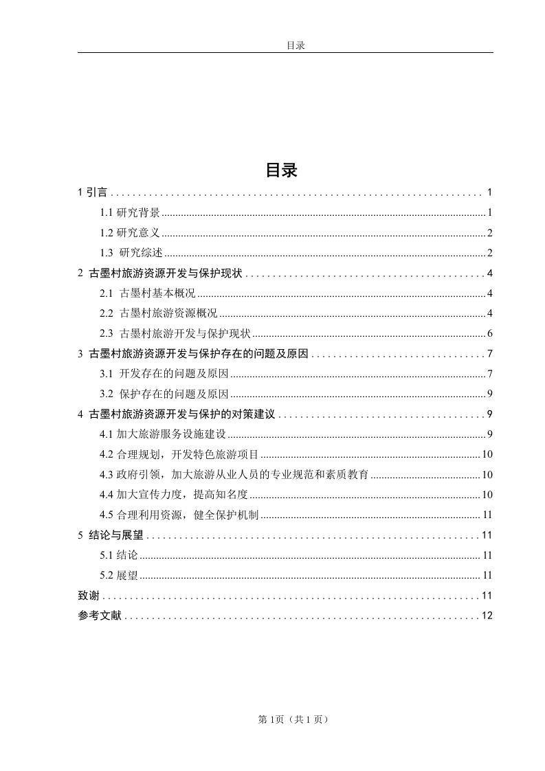 目录目录11.1研究背景21.3研究综述2古墨村旅游资源开发与保护现状2.1古墨村基本概况.2.2古墨村旅游资源概况..2.3古墨村旅游开发与保护现状3古墨村旅游资源开发与保护存在的问题及原因73.1开发存在的问题及原因3.2保护存在的问题及原因94古墨村旅游资源开发与保护的对策建议4.1加大旅游服务设施建设.94.2合理规划,开发特色旅游项目4.3政府引领,加大旅游从业人员的专业规范和素质教育.104.4加大宣传力度,提高知名度4.5合理利用资源,健全保护机制5.1结论5.2展望第1页(共1页)1引言摘要:传统村落所拥有的不可再生旅游资源,包括自然资源和文化资源等等。目前随着社会经济的快速发展,许多传统村落也在逐渐没落,因此重视和开发传统村落的旅游资源也显得更为重要。古墨村作为保存较为完好的传统村落,自然资源丰富,生态环境良好,文化内涵深厚,其在国家政策的扶持推动下,得到了较快的发展。但是,该村在进行旅游资源开发与保护中,存在着很多问题。本文拟通过对古墨村旅游资源进行实地调研,分析其旅游资源开发与保护存在的问题及原因,由此建议该村应该从加大旅游服务设施建设、合理规划、合理利用旅游资源、提高从业人员专业素质、加大旅游宣传等几个方面做出努力,从而使得古墨村的旅游资源得到有效开发与保护。关键词:古墨村:旅游资源:开发与保护Abstract:Traditional villages have good advantages of natural resources and culturalresources,and are non-renewable tourism resources.With the rapid development ofurbanization and the disappearance of traditional villages,it is very important for thedevelopment and protection of tourism.The traditional Gumo village is a traditional village,well preserved,rich in natural resources,environmentally sound and cultural without anaccount number?However,many challenges remain in the development and protection ofTurkish resources.The purpose of this document is to analyze the development andmaintenance of tourism resources in Gumo village by studying the development andmaintenance of tourism resources in Gumo village.Land.Therefore,it is suggested that thevillage should strive to improve the construction,rational planning,rational use of tourismresources,professional specialization and promotion of tourism,so as to effectively developand protect the tourism resources of Gumo village.Keywords:Gumo Village tourism resources;development and protection1引言1.1研究背景传统村落是我国历史和文化的载体之一,是极其珍贵并不可再生的旅游资源。发展乡村旅游是“脱贫致富”的一个重要渠道。传统村落所拥有的不可再生旅游资源,包括自然资源和文化资源等等,这可能为当地脱贫致富做出巨大的贡献。十九大提出了乡村振兴的战略也要求我们应该重视和开发传统村落的旅游资源,通过旅游发展来推动传统村落的经济发展。传统村落作为中华文明的重要代表之一,其旅游的开发与保护成为了实施乡村振兴战略的一个重要抓手、途径。事实上,乡村振兴战略的实施第1页(共13页)