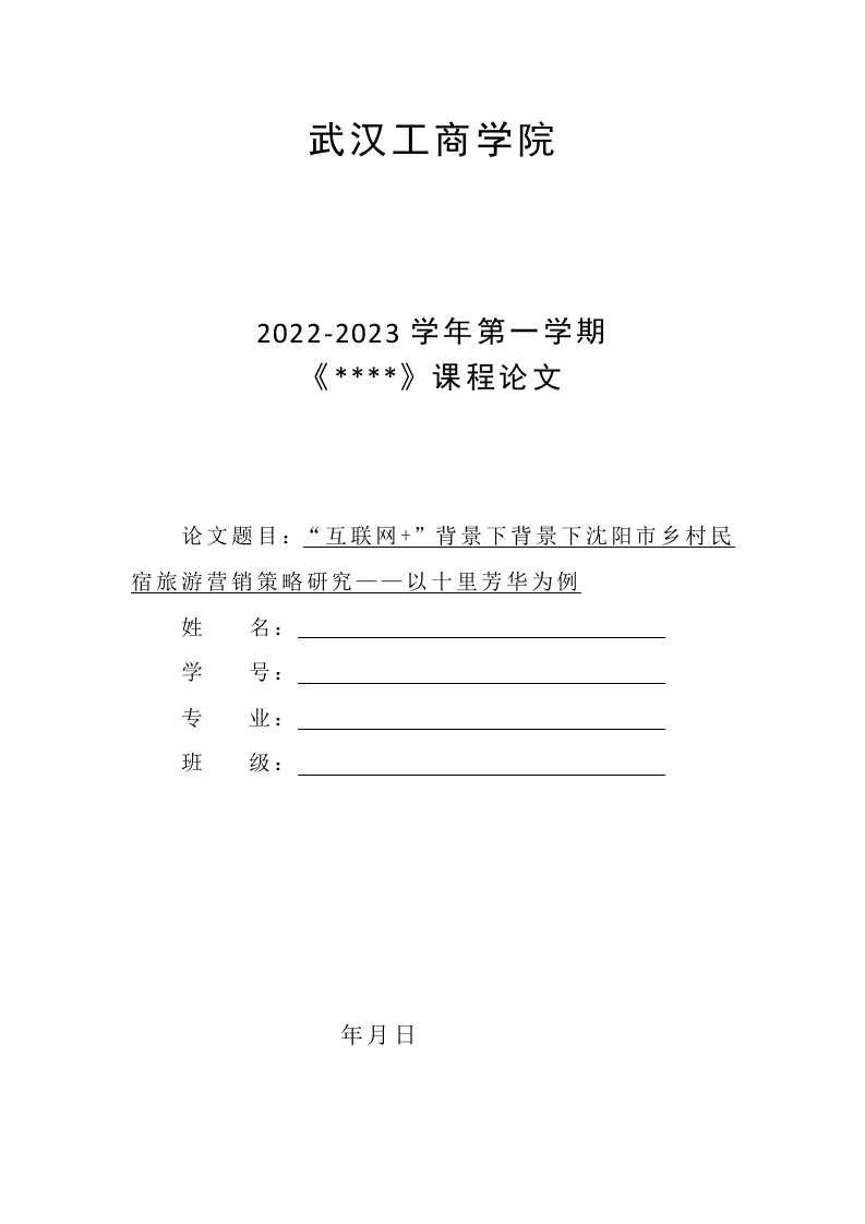 武汉工商学院2022-2023学年第一学期《****》课程论文论文题目:“互联网+”背景下背景下沈阳市乡村民宿旅游营销策略研究一一以十里芳华为例姓名:学号:专业:班级:年月日目录摘要2关键词:二、基本理论…(一)研究内容的相关概念.…三、乡村民宿旅游现状分析…(一)国内外研究现状…(二)沈阳市乡村民宿发展现状四、沈阳市乡村民宿目前面临的问题6(一)产业规模过小,存在产业集中化问题6(二)民宿宣传内容失真,缺乏优势6(三)基础建设不足,文化理念单一…五、沈阳市乡村民宿营销策略优化…8(一)把握市场导向,凸显地方区位优势(二)增强宣传力度,开发特色化营销策略…8(三)结合地方特色,促进民宿产品多元化发展.9六、结论….10参考文献…12“互联网+”背景下背景下沈阳市乡村民宿旅游营销策略研究一以十里芳华为例摘要本文运用“互联网+”及旅游营销策略、乡村旅游产业等相关理论对如何提高沈阳市乡村民宿旅游营销策略进行探究、讨论:乡村民宿旅游是乡村旅游业发展的重点产业,对提高乡村经济市场有重要带头作用,民宿旅游是乡村民宿旅游的重要项目,民宿游具有独特的生态化,既可以满足人们贴近大自然的渴望,又会给当地的经济带来可观的收益,有助于乡村实施振兴发展的战略,借助互联网手段对自然绿色的乡村民宿旅游进行宣传,增加曝光量,吸引游客。通过对十里芳华民宿的具体分析,进一步对沈阳市的乡村民宿旅游现状及营销策略中存在的问题进行探索并制定出有效的应对对策,加速沈阳市乡村民宿旅游的持续发展。关键词:民宿:营销策略:互联网一、引言党的十九大报告中提出,我国应坚持农业农村优先发展,满足产业兴旺、生态宜居、乡风文明、治理有效、生活富裕的总要求,加速推进农业农村现代化[1]。在基于乡村振兴的战略目标下,我国加速乡村发展:作为振兴农村经济的重要组成部分的旅游业发展迅速,乡村旅游这种新兴形式受到了人们的青睐。《中华人民共和国国民经济和社会发展第十四个五年规划和2035年远景目标纲要》明确提出,要推动文化和旅游业融合发展,坚持以文塑旅、以旅彰文,打造独具魅力的中华文化旅游体验。同时着眼于我国经济持续发展、居民收入逐渐增长的趋势,人们对于生活高质量的追求也越来越强烈,乡村旅游能够很好的满足人们对于放松休闲、贴近大自然的需求。目前乡村旅游的重点项目就是乡村民宿,乡村民宿产业的建设已然变成了旅游活动开展的新动力。互联网的发展对于我国经济的建设和发展有重要的作用,许多行业通过运用互联网技术加速了自身品牌的宣传,扩大了宣传渠道:乡村旅游业应与时俱进,依托“互联网+”的技术发掘当地的旅游特色文化,形成独特的品牌。推动产业创新发展,扩大宣传渠道,努力提高乡村民宿产业的升级,带动农村经济的发展。同时,生态环境和资源是发展乡村民宿旅游的重要因素,应在保护当地自然生态资源的条件下进行合理的建设及开发,有利于提高竞争力,也能够实现乡村民宿旅游的可持续发展。二、基本理论SW0T分析法为掌握全面的第一手资料,笔者对辽宁省沈阳市乡村民宿有关资料进行收集、整理,具体以十里芳华为代表,对其进行主要内部优势,劣势,外部机会和威胁全面、系统的分析,为后续的沈阳市乡村民宿营销策略的制定提供依据[7]。在对乡村民宿旅游营销策略的基本理论和发展现状进行分析的基础上,以十里芳华民宿为案例,总结乡村民宿旅游产品互联网营销策略的经验,发现沈阳市乡村民宿产业营销中的问题,提出针对沈阳市乡村民宿旅游产品网络营销的营销策略。(一)研究内容的相关概念民宿近年来热度大涨,民宿起源于欧洲,国内没有清晰的定义,民宿的普遍