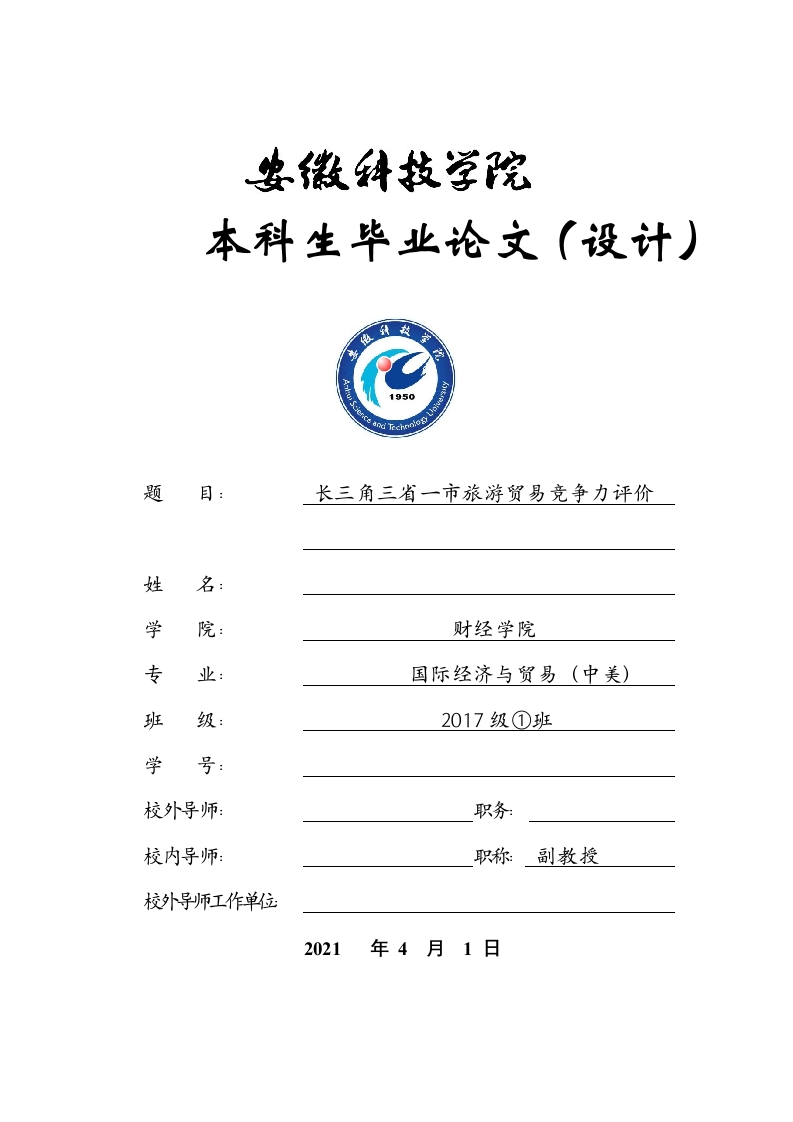 本科生毕业论文(设计)1950题目:长三角三省一市旅游贸易竞争力评价姓名:学财经学院专国际经济与贸易(中美)班级:2017级①班学号:校外导师:职务校内导师校外导师工作单位2021年4月1日目录摘要Abstract…1引言31.1研究背景.…1.2研究目的和意义32长三角三省一市旅游贸易发展现状分析.…2.1长三角地区旅游贸易发展的总体分析.52.1.1长三角地区旅游贸易发展差异(以旅游资源品质为例)2.1.2长三角地区旅游资源总体优势62.2长三角地区各自旅游贸易发展的现状2.2.1浙江省旅游贸易发展现状..72.2.2江苏省旅游贸易发展现状72.2.3安徽省旅游贸易发展现状,82.2.4上海市旅游贸易发展现状.83长三角三省一市旅游贸易竞争力评价3.1评价方法与模型选择.103.2评价指标体系设计.…3.3结果分析3.3.1信度检验.133.3.2效度检验.…3.3.3提取公因子…3.3.4因子命名4长三角三省一市旅游贸易存在的问题4.1产品结构的单一性与旅游服务市场需求多样性之间的矛盾194.2传统的宣传渠道与游客感知的矛盾.4.3旅游产业的快速发展与旅游人才紧缺之间的矛盾195对提高长三角三省一市旅游贸易竞争力建议.215.1优化旅游产品供给结构,发展特色旅游........25.2提高创新意识,加大营销力度..cm .......e.215.3加快完善人才管理机制.22谢辞23参考文献24