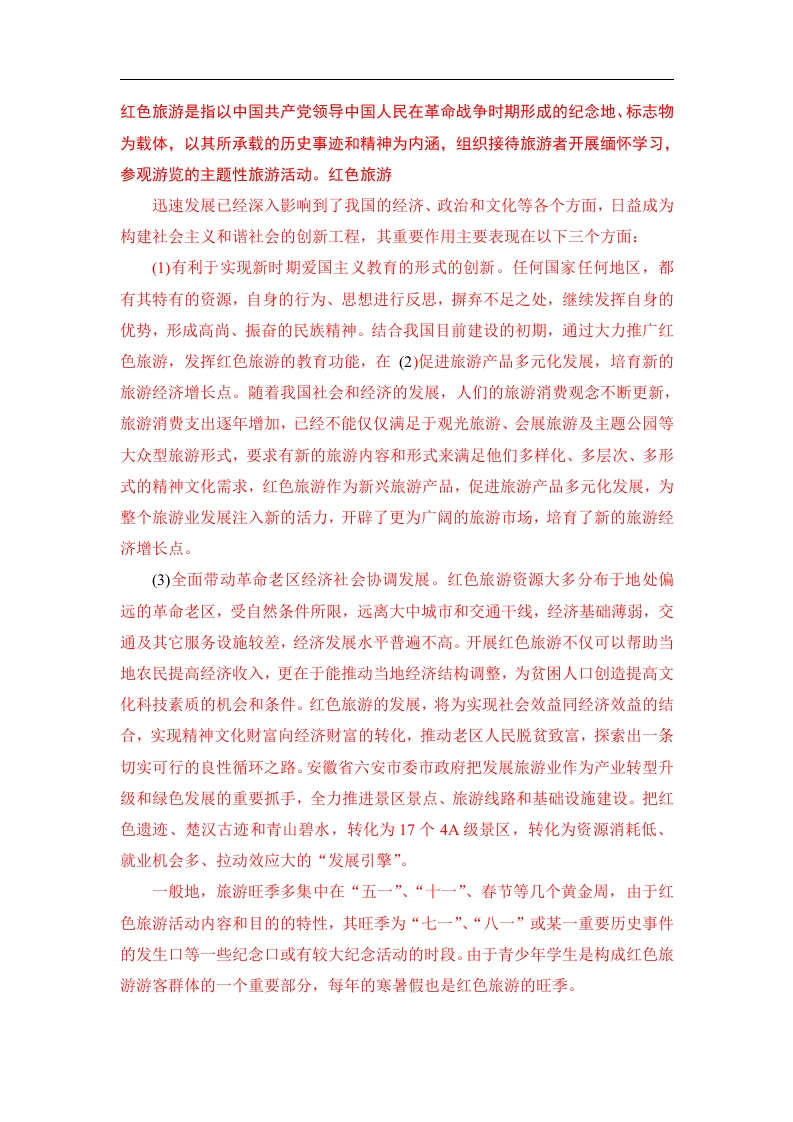 红色旅游是指以中国共产党领导中国人民在革命战争时期形成的纪念地、标志物为载体,以其所承载的历史事迹和精神为内涵,组织接待旅游者开展缅怀学习,参观游览的主题性旅游活动。红色旅游迅速发展已经深入影响到了我国的经济、政治和文化等各个方面,日益成为构建社会主义和谐社会的创新工程,其重要作用主要表现在以下三个方面:()有利于实现新时期爱国主义教育的形式的创新。任何国家任何地区,都有其特有的资源,自身的行为、思想进行反思,摒弃不足之处,继续发挥自身的优势,形成高尚、振奋的民族精神。结合我国目前建设的初期,通过大力推广红色旅游,发挥红色旅游的教育功能,在(2)促进旅游产品多元化发展,培育新的旅游经济增长点。随着我国社会和经济的发展,人们的旅游消费观念不断更新,旅游消费支出逐年增加,已经不能仅仅满足于观光旅游、会展旅游及主题公园等大众型旅游形式,要求有新的旅游内容和形式来满足他们多样化、多层次、多形式的精神文化需求,红色旅游作为新兴旅游产品,促进旅游产品多元化发展,为整个旅游业发展注入新的活力,开辟了更为广阔的旅游市场,培育了新的旅游经济增长点。(3)全面带动革命老区经济社会协调发展。红色旅游资源大多分布于地处偏远的革命老区,受自然条件所限,远离大中城市和交通干线,经济基础薄弱,交通及其它服务设施较差,经济发展水平普遍不高。开展红色旅游不仅可以帮助当地农民提高经济收入,更在于能推动当地经济结构调整,为贫困人口创造提高文化科技素质的机会和条件。红色旅游的发展,将为实现社会效益同经济效益的结合,实现精神文化财富向经济财富的转化,推动老区人民脱贫致富,探索出一条切实可行的良性循环之路。安徽省六安市委市政府把发展旅游业作为产业转型升级和绿色发展的重要抓手,全力推进景区景点、旅游线路和基础设施建设。把红色遗迹、楚汉古迹和青山碧水,转化为17个4A级景区,转化为资源消耗低、就业机会多、拉动效应大的“发展引擎”。一般地,旅游旺季多集中在“五一”、“十一”、春节等几个黄金周,由于红色旅游活动内容和目的的特性,其旺季为“七一”、“八一”或某一重要历史事件的发生口等一些纪念口或有较大纪念活动的时段。由于青少年学生是构成红色旅游游客群体的一个重要部分,每年的寒暑假也是红色旅游的旺季。从景区性质来看,红色旅游目的地多数是爱国主义和革命传统教育的基地;从客源市场看,红色旅游的主体多数是党政机关干部、军人、学生等;从旅游形式看,多数是团体公共活动,这就在客观上为公费旅游提供了市场。根据对福建上杭古田的游客调查显示,2016年游客中有70%是公费的国家干部,这说明公费旅游在红色旅游中占有很高的比例,正因如此,游客的消费水平相对较高。如古田会议会址2016年游客人均日消费高达1526元,即使在人均日消费较低的1997年也有246.73元,明显高于自费游客的平均消费水平。这是红色旅游最为突出的特征,教育是红色旅游发展的根本目的。游客在参观革命遗址遗迹、伟人故居和革命遗留物品,瞻仰革命烈士墓地,聆听革命英雄事迹和体验革命精神的时候能够得到心灵的洗礼和精神的充实,从而在娱乐中得到了深刻的教育。而爱国主义教育、历史文化教育、品德教育、思想文化教育是一个国家永恒的主题,红色旅游采用“寓教于乐,寓教于游”的方式既迎合了国家的需求,也迎合了时代发展的趋势,迎合了当代人的需求。我国是一个具有光辉革命历史和优良传统的国家,“五四”运动以来的90年革命历程中,中国共产党带领人民先后进行了新民主主义革命、社会主义革命和社会主义建设,留下了极其丰富的革命史迹,它们是全国人民的宝贵历史财富。迄今为止,国务院公布的五批全国重点文物保护单位中,革命遗址和纪念物达127处之多。游客脑海中对旅游目的地的信息,使得游客接受并且能够产生前往的欲望。1929年12月28日至29日,中共第九次代表大会在此召开,也就是历史上著名的古田会议。上杭古田革命老区不仅是“二十年红旗不倒的地方”、红军的家乡也是毛泽东思想形成的重要发祥地,同时这里还孕育了为共和国建立和发展做出巨大贡献的党和国家领导人如张鼎压、邓子恢、陈巫显、杨成武、刘亚楼等。革命战争时期革命先辈们为了国家独立、民族解放,在闽西龙岩地区进行的伟大革命实践赋予了上杭县古田地区十分丰富的红色旅游资源,造就了一系列全国知名的景点,包括古田会议会址、毛泽东纪念园、古田会议纪念馆以及《星星之火可以燎原》的撰写地点协成店等景区,古田会议会址景区不仅是核心景区,同时还是福建省十大旅游品牌之一、福建省红色旅游龙头景区、福建省首个5A级红色旅游景区也是全国十二个重点红色旅游景区的重要组成部分,2014年10月31日,中共中央总书记、国家主席、中央军委主席习近平在福建省上杭县古田镇召开全军政治工作会议,并发表重要讲话。“新古田会议”的胜利召开具有里程碑式的意义,这更进一步夯实其“红色圣地”的历史地位!古田会议会址是一座清朝宗祠建筑,建筑面积826平方米,始建于1848年,称廖氏宗祠,又名“万源祠”。它座东朝西,背靠参天古木林。在这片茂密树林掩映下的“古田会议永放光芒”八个红色大字熠熠生
