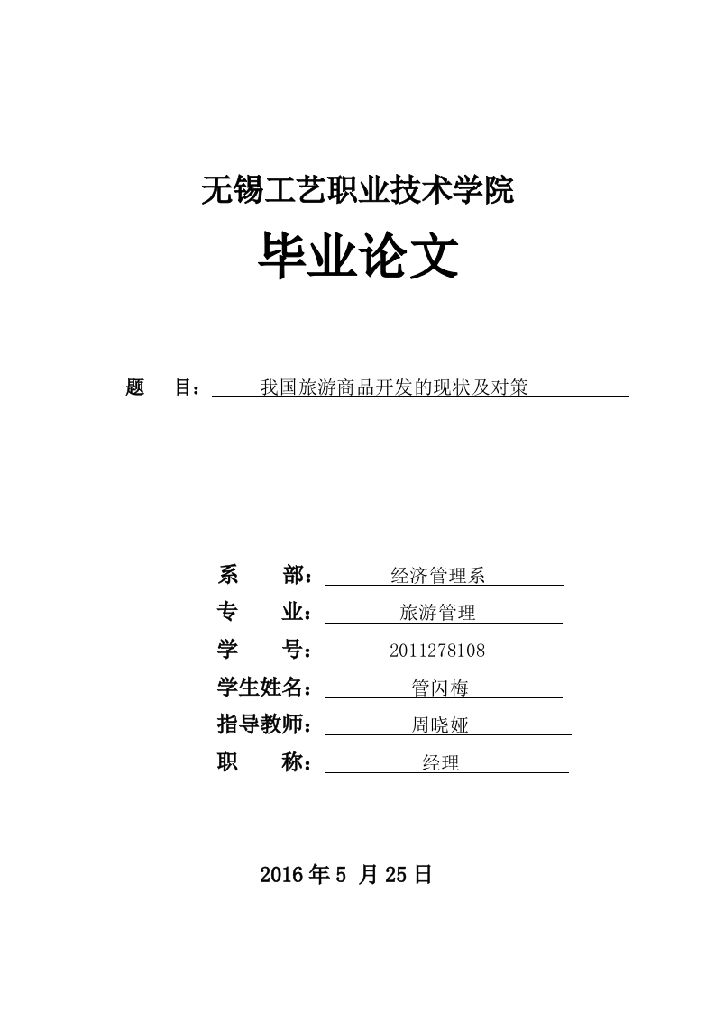 无锡工艺职业技术学院毕业论文题目:我国旅游商品开发的现状及对策系部:经济管理系专业:旅游管理学2011278108学生姓名:管闪梅指导教师:周晓娅职经理2016年5月25日无锡工艺职业技术学院毕业论文摘要(三号、黑体,居中,空两格)在我国,旅游业起步晚,但发展的速度很快。近年来,随着我国人民生活水平的逐步提高,旅游支出在人们消费总支出中所占的比例也越来越大旅游业的竞争也越来越激烈。随着我国加入T0和国外旅游企业的加入,我国旅游产品质量的参差不齐,严重影响到我国旅游业本身的发展。与国外旅游业相比较,我国旅游业的发展还处于起始阶段。所以开发设计出的旅游商品与旅游者的需求吻合程度低。这方面还有待于去发掘去完善,才有利于提高中国旅游商品的市场竞争力,进一步开拓国内外旅游市场,进一步推动我国旅游产业的全面发展。本文对旅游商品的定义、属性进行了初步探讨,分析了我国在旅游商品矛发中存在的问题,并从体制改善、设计生产加工、产品结构和消费结构调整、创建旅游商品生产、信息与交易平台、扩大分销渠道等途径提出了对幕措施,对旅游商品的发展具有理论和实践意义。关键词:旅游商品:问题:对策无锡工艺职业技术学院毕业论文目录(三号黑体居中,空两格)摘要I目..........II1·2.1开发旅游商品的优势在于·2.2开发旅游商品的弱势主要表现在2·3我国旅游商品开发现状存在的问题33.1机制问题・3.2投资结构问题34·4.1解决旅游商品设计、生产、销售的机制问题.…4·4.3分析客源市场,设计销售对路的旅游商品.·5·4.4提高认识,确定旅游商品的地位·4.5加强政府主导作用,为旅游商品生产销售搭建交易平台.5·4.6重视旅游商品相关人才的培养6参考文献.8致9