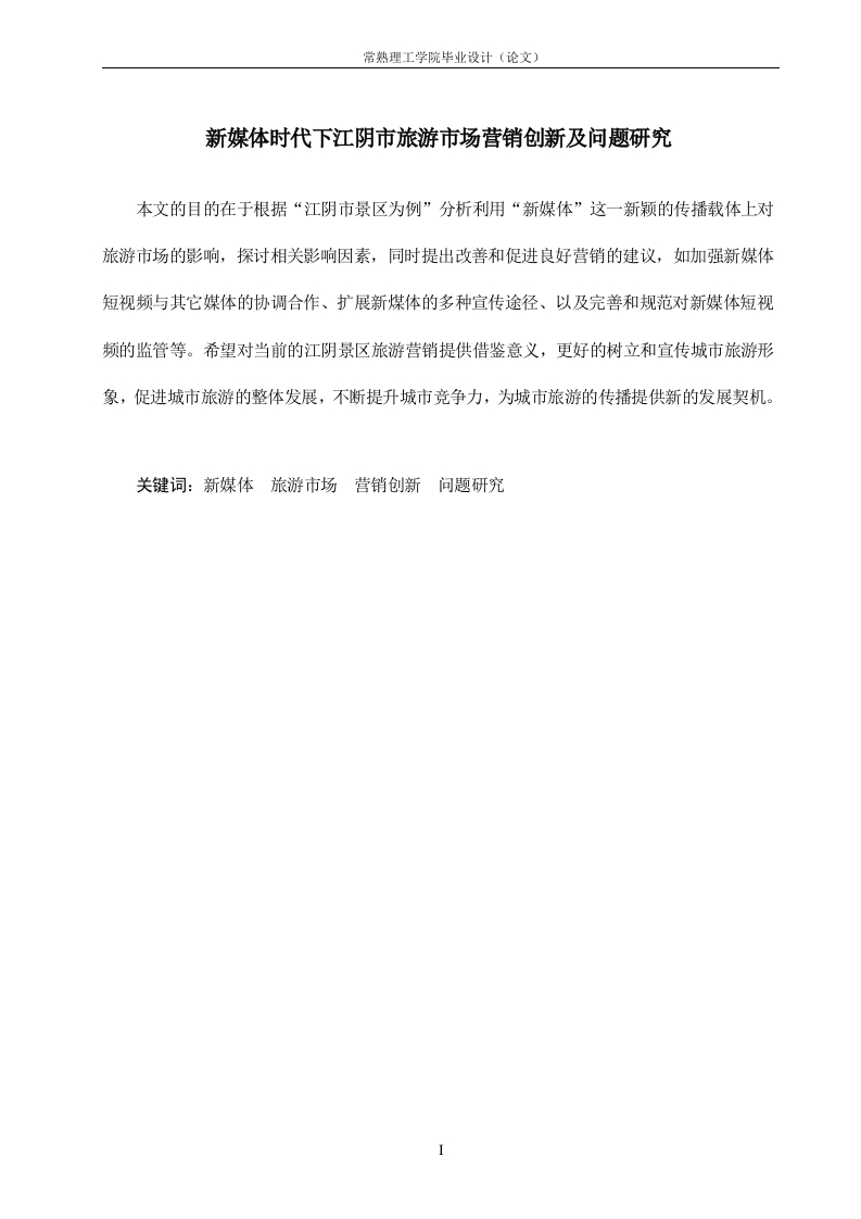 常熟理工学院毕业设计〔论文)新媒体时代下江阴市旅游市场营销创新及问题研究本文的目的在于根据“江阴市景区为例”分析利用“新媒体”这一新颖的传播载体上对旅游市场的影响,探讨相关影响因素,同时提出改善和促进良好营销的建议,如加强新媒体短视频与其它媒体的协调合作、扩展新煤体的多种宣传途径、以及完善和规范对新媒体短视频的监管等。希望对当前的江阴景区旅游营销提供借鉴意义,更好的树立和宣传城市旅游形象,促进城市旅游的整体发展,不断提升城市竞争力,为城市旅游的传播提供新的发展契机。关键词:新媒体旅游市场营销创新问题研究常熟理工学院毕业设计(论文)Research on the innovation and problems of Jiangyin tourism marketing in thenew media eraThe purpose of this paper is to analyze the influence of the new media on the tourism marketby using the new media as an example,and to make suggestions on the optimization anddevelopment of the marketing of the scenic spots,such as strengthening the coordination andcooperation between the new media and other media,expanding the various ways of publicity of thenew coal,and perfecting and standardizing the new media Supervision of short video,etc.It ishoped that it can provide reference for the current Jiangyin scenic spot tourism marketing,betterestablish and promote the image of urban tourism,promote the overall development of urbantourism,continuously improve the competitiveness of the city,and provide new opportunities for thespread of urban tourism.Key Words:new media Tourism market Marketing Innovation Problem research常熟理工学院毕业设计(论文)目录1绪论…11.1.1传统媒体对江阴市的宣传1.1.2互联网引发了旅游营销的变革....1.1.3江阴市景区旅游可持续发展的现实需求21.2研究目的及意义1.3.研究内容及方法31.3.1.研究内容31.3.2.研究方法...31.4创新点…2.概念界定与理论基础2.1概念界定2.1.1新媒体52.1.2新媒体营销52.1.3旅游新媒体营销.…62.2相关理论基础82.2.1旅游市场营销理论......2.2.2整合营销理论..92.2.3城市旅游营销......993.江阴市景区旅游市场及其营销绩效实证分析3.1江阴市新媒体营销概况3.2江阴市旅游市场新媒体营销现状3.2.1传统媒体营销....113.2.2新媒体营销113.3江阴市旅游新媒体优势分析.121