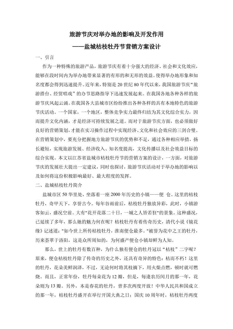 旅游节庆对举办地的影响及开发作用盐城枯枝牡丹节营销方案设计一、引言作为一种特殊的旅游产品,旅游节庆有着十分强大的经济、社会和文化效应,能够在段时间内为举办地带来显著的有形的和无形的效益。使得举办地形象和知名度都会得到迅速提升。近年来,特别是20世纪80年代以来,我国旅游节庆“旅游搭台、经贸唱戏”的办节思路指导下迅速发展起来。在我国各地各种各样的旅游节庆风起云涌。在我国各大县城市区纷纷推出各种各样的具有本地特色的旅游节庆活动。一个国家,一个地区,整体竞争实力最终归结为其文化综合实力,因而提升文化内涵,才是经济可持续发展之道。而对于旅游节庆方面,也必须做好良好的营销策划,才能在实习操作过程中实现经济、文化和社会效应的三剑合璧。在营销策划中,要充分把握地方旅游节庆的优势和不足,通过各种相应举措,扬长避短,实现旅游发展、经济收入、知名度提高,文化传播以及社会效益目标的综合实现。本文以江苏省盐城市枯枝牡丹节的营销方案的设计,一方面,对旅游节庆的发展壮大提出一定建议,同时也探讨,旅游节庆活动对于举办地的影响以及如何将这份积极影响最好、最大程度的发挥。二、盐城枯枝牡丹简介盐城市区50华里处,坐落着一座2000年历史的小镇一一便仓。这里的枯枝牡丹,奇甲天下,享誉古今。每年谷雨前后,枯枝牡丹独放异彩,此时,小镇游客如云,盛况空前。大有"花开花落二十日,一城之人皆若狂"的景象。这种盛况,已延续了多年,那么她的魅力何在呢?枯枝牡丹有着传奇历史,清代小说《镜花缘》记述道:"如今世上所传枯枝牡丹,淮南便仓最多。"被誉为花中之王的牡丹,历来荟萃于洛阳,这是众所周知的,为何盛产便仓小镇却鲜为人知。那么,世上的牡丹有数百种,为什么独有便仓的牡丹冠以“枯枝”二字呢?原来,便仓枯枝牡丹除了传奇的历史之外,还具有奇异的特色:枯而不朽!这里的牡丹,花朵美鲜润泽,不过,无论何时将其枝摘下,用火柴点燃,顿时就可燃烧。而且,正常年份,牡丹每朵花为12瓣,但是,每逢农历闰月的那一年,花朵则为13瓣。另外,本是春花的牡丹,曾多次两度开放!中华人民共和国成立的那一年,枯枝牡丹盛开在举行开国大典之日:国庆10周年时,枯枝牡丹两度开花:1972年,联合国恢复我国的合法席位时,枯枝牡丹又在隆冬开放:1987年,中共十三大之后,园内和园外散植的单瓣红白牡丹,再次开出若干无叶之花。虽然是巧合,却给枯枝牡丹增添了一种神秘的色彩!便仓枯枝牡丹承载着厚重的历史和人文底蕴,据历史记载,这里的枯枝牡丹原于洛阳,北宋末年,苏州枫桥人卞济之,曾任陕西参政公,为官清廉。宋亡后,隐退江南,为避战乱,又举家迁至东溟(今盐城便仓),并携洛阳红、白两株牡丹植于园内,取其红者,以示报国忠心,取其白者,以示为官清正。卞氏后裔卞元恒随张士诚起义,成为吴王的部将。朱元璋打败张士诚后,元亨隐退家乡。朱元璋闻卞元亨的才名,多次征召,卞元亨隐居不出。朱元璋一怒之下,将他发配辽东边境。这一走就是十年,牡丹十年未开,十年后元亨得赦归来,牡丹再次开放。他百感交集,写下了《戎归》一首:丈夫志远遍天涯,一跨辽东忽到家,荒径尚存苍翠柏,故园尤有牡丹花。文章自古浑如梦,勇略于今谁共夸?回首风烟成往事,乐夫天命何复嗟!同时,有感于爱妾10年相守之情,又题咏牡丹两首:牡丹本是亲手栽,十度春风九不开,多少繁华零落尽,一枝犹待主人来。草唐松菊晚调残,独有西园旧牡丹,自是枯枝存劲节,依依唯念故人还。因奇、特、怪、灵而著称于世。此花鲜枝可燃,它处难开、应历法增减、能感应世事时事的特点,加之唐代女皇武则天下令放火炙烤牡丹的传说和清代名著《镜亭》内满园花开,姹紫嫣红,犹如胭脂凝成,美艳润泽,芬芳馥郁:衬托着花朵的叶片,繁茂厚实,青翠欲滴,主干却似饱经风霜、憔悴欲朽的记载,使她更加不同凡响。1943年,日军侵犯便仓,枯枝牡丹园成为一片瓦砾。当地群众冒着日军轰炸的硝烟,将花根小心挖出,藏进麻袋,栽在自家菜园中,才使枯枝牡丹免于灭顶之灾。解放后,当地政府先后4次重修和改建枯枝牡丹园,现已建成苏州园林式花园,牡丹品种近百个。原国防部长张爱萍为该园题写了“枯枝牡丹园”的横额和“海水三千丈,牡丹千百年”的楹联。目前枯枝牡丹园已成为苏北对外开放的又一个旅游景点,正在吸引着越来越多的游人墨客前往观赏。来自历史和文化的传奇,将这份本来便雍容华贵的牡丹花渲染的更加富有颜色和传奇性,吸引着国内外游客纷纷不远万里而来,只为一睹芳容。三、盐城牡丹文化节的发展概况与发展意义(一)发展概况每年谷雨时节,便是盐城枯枝牡丹盛开的时节。很久以来一直有个谷雨时节,盐城枯枝牡丹动天下的传闻。每年4月20日,四面八方的游客不约而同的来到这个枯枝牡丹的故乡,沉浸在花的海洋里,聆听着属于这一朵朵雍容华贵的牡丹之后一个个动人的传奇故事,总是能让人流连忘返。随着近年来,各地旅游节庆活动的推广和发展,盐城枯枝牡丹也开始向着节庆化发展着。真正提出盐城枯枝牡丹文化节应该是在2011年的谷雨时节。在年年谷雨牡丹花相似,迎来岁岁踏春惜花人不同的时节里,盐城政府打着“以花为媒,旅游搭台、经贸唱戏的”的理念开展了枯枝牡丹文化节。以下作为一个对于盐城枯枝文化节描述的