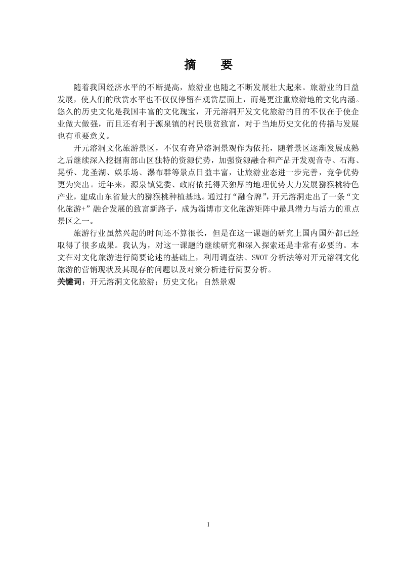 摘要随着我国经济水平的不断提高,旅游业也随之不断发展壮大起来。旅游业的日益发展,使人们的欣赏水平也不仅仅停留在观赏层面上,而是更注重旅游地的文化内涵。悠久的历史文化是我国丰富的文化瑰宝,开元溶洞开发文化旅游的目的不仅在于使企业做大做强,而且还有利于源泉镇的村民脱贫致富,对于当地历史文化的传播与发展也有重要意义。开元溶洞文化旅游景区,不仅有奇异溶洞景观作为依托,随着景区逐渐发展成熟之后继续深入挖掘南部山区独特的资源优势,加强资源融合和产品开发观音寺、石海、晃桥、龙圣湖、娱乐场、瀑布群等景点日益丰富,让旅游业态进一步完善,竞争优势更为突出。近年来,源泉镇党委、政府依托得天独厚的地理优势大力发展猕猴桃特色产业,建成山东省最大的猕猴桃种植基地。通过打“融合牌”,开元溶洞走出了一条“文化旅游+”融合发展的致富新路子,成为淄博市文化旅游矩阵中最具潜力与活力的重点景区之一。旅游行业虽然兴起的时间还不算很长,但是在这一课题的研究上国内国外都已经取得了很多成果。我认为,对这一课题的继续研究和深入探索还是非常有必要的。本文在对文化旅游进行简要论述的基础上,利用调查法、SWOT分析法等对开元溶洞文化旅游的营销现状及其现存的问题以及对策分析进行简要分析。关键词:开元溶洞文化旅游:历史文化:自然景观IAbstractWith the continuous improvement of China's economic level,the tourism industry hasalso been growing up.With the development of tourism,the level of appreciation is not onlyon the level of appreciation,but also on the connotation of tourist destination.The longhistorical culture is a rich cultural treasure of our country.The aim of developing the culturaltourism of Yuanyong cave is not only to make the enterprises bigger and stronger,but also tohelp the villagers of Yuanyuan town get rid of poverty and become rich,it is also of greatsignificance to the dissemination and development of local history and culture.Kaiyuan Karst Cave culture tourist scenic spot,not only has the strange karst cavelandscape as the backing,as the scenic spot gradually develops after matures continues toexcavate the Southern Mountain area unique resources superiority,strengthen the integrationof resources and Product Development Gwaneumsa,Shihai,Huangqiao,Longsheng Lake,entertainment,waterfalls and other attractions increasingly rich,so that the tourism industryfurther improve,more prominent competitive advantage.In recent years,the source townParty Committee,the government relies on the unique geographical advantage to developKiwi Industry,built the largest kiwifruit planting base in Shandong Province.By playing the"integration card",Kaiyuan Karst Cave has developed a new way of "cultural tourism +and become one of the most potential and dynamic scenic spots in the Zibo Cultural TourismMatrix.Although the rise of the tourism industry is not very long,but in the subject of researchat home and abroad have made a lot of results.In my opinion,it is necessary to continue theresearch and further exploration on this subject.Based on the brief discussion of culturaltourism,this paper makes a brief analysis of the current marketing situation,existingproblems and countermeasures of Kaiyuan Karst Cave cultural tourism by means ofinvestigation and SWOT analysis.Keywords:Kaiyuan Karst Cave culture tourism;Culture of istory;Natural landscape.目录摘Abstract...............1.1开元溶洞文化背景11.2研究的目的与意义1.2.1研究目的..1.3研究方法......1.4研究内容.....第二章文化旅游的概述..2.1文化旅游的概念2.2开元溶洞文化简介2.1.1历史文化32.1.2自然文化.…4第三章开元溶洞文化旅游现状分析553.2开元溶洞文化旅游现状SW0T分析....第四章开元溶洞文化旅游营销建设现有问题分析..….84.1各文化景点间缺乏整体规划.·4.2文化产品较为单一,景点旅游设施不完善84.3景点从业人员专业化程度不够.…84.4旅游景点对外宣传不足,市场开拓乏力...4.5旅游文化主要停留在浅层次,缺乏深度开发9105.1结合地方特色文化推动整体发展....105.2旅游周边设施进一步完善,打造吃住一体105.3开展就业前培训,让介绍人员更专业...115.4拓宽整体文化营销推广渠道,加大宣传力度5.5深化地方品牌文化建设......13