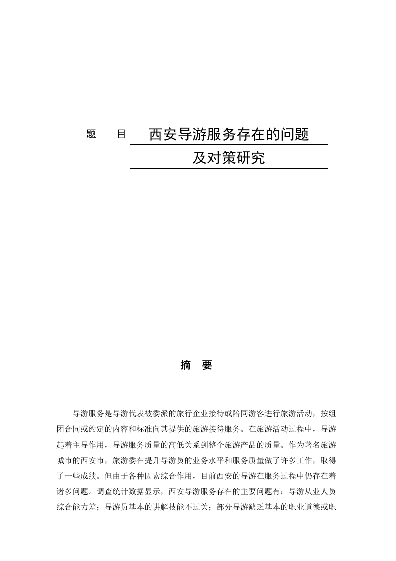 题目西安导游服务存在的问题及对策研究摘要导游服务是导游代表被委派的旅行企业接待或陪同游客进行旅游活动,按组团合同或约定的内容和标准向其提供的旅游接待服务。在旅游活动过程中,导游起着主导作用,导游服务质量的高低关系到整个旅游产品的质量。作为著名旅游城市的西安市,旅游委在提升导游员的业务水平和服务质量做了许多工作,取得了一些成绩。但由于各种因素综合作用,目前西安的导游在服务过程中仍存在着诸多问题。调查统计数据显示,西安导游服务存在的主要问题有:导游从业人员综合能力差:导游员基本的讲解技能不过关;部分导游缺乏基本的职业道德或职业责任感不强:职业认同感较低。问题形成的原因主要是:导游整体素质偏低:导游培训质量不高:导游待遇不高:导游人才流失严重。针对问题,文章提出了完善导游行业管理机制:建立科学的导游培训体系,提高导游培训质量:健全导游激励体系,完善薪酬制度:加强导游职业道德建设,提升导游服务质量的解决对策。希望能够对规范西安导游从业人员的管理,提升导游服务品质提供参考。关键词:导游:服务质量:提升策略ABSTRACTTour guide service is a kind of tour reception service provided by tour guide onbehalf of the appointed travel enterprise to receive or accompany tourists for tourismactivities according to the contents and standards of the group contract or agreement.In the process of tourism activities,tour guide plays a leading role.The quality of tourguide service is related to the quality of the whole tourism product.As a famous touristcity,Xi'an Tourism Committee has done a lot of work and made some achievements inimproving the professional level and service quality of tour guides.However,due tovarious factors,there are still many problems in the service process of Xi'an tour guide.According to the survey statistics,the main problems of guide service in Xi'an are:thecomprehensive ability of guide practitioners is poor;the basic explanation skills ofguide practitioners are not qualified;some guides lack basic professional ethics orsense of professional responsibility is not strong;professional identity is low.The mainreasons for the problems are:the overall quality of tour guides is low;the quality oftour guide training is not high;the treatment of tour guides is not high;the brain drainof tour guides is serious;in view of the problems,this paper puts forward to improvethe management mechanism of tour guide industry;establish a scientific tour guidetraining system to improve the quality of tour guide training;improve the incentivesystem of tour guides,improve the salary system;strengthen the construction of tourguides'professional ethics to improve The solution of tour guide service quality.I hopeit can provide reference for standardizing the management of tour guides in Xi'an andimproving the service quality of tour guides.Keywords:Tour guide;Service quality;Optimization strategy