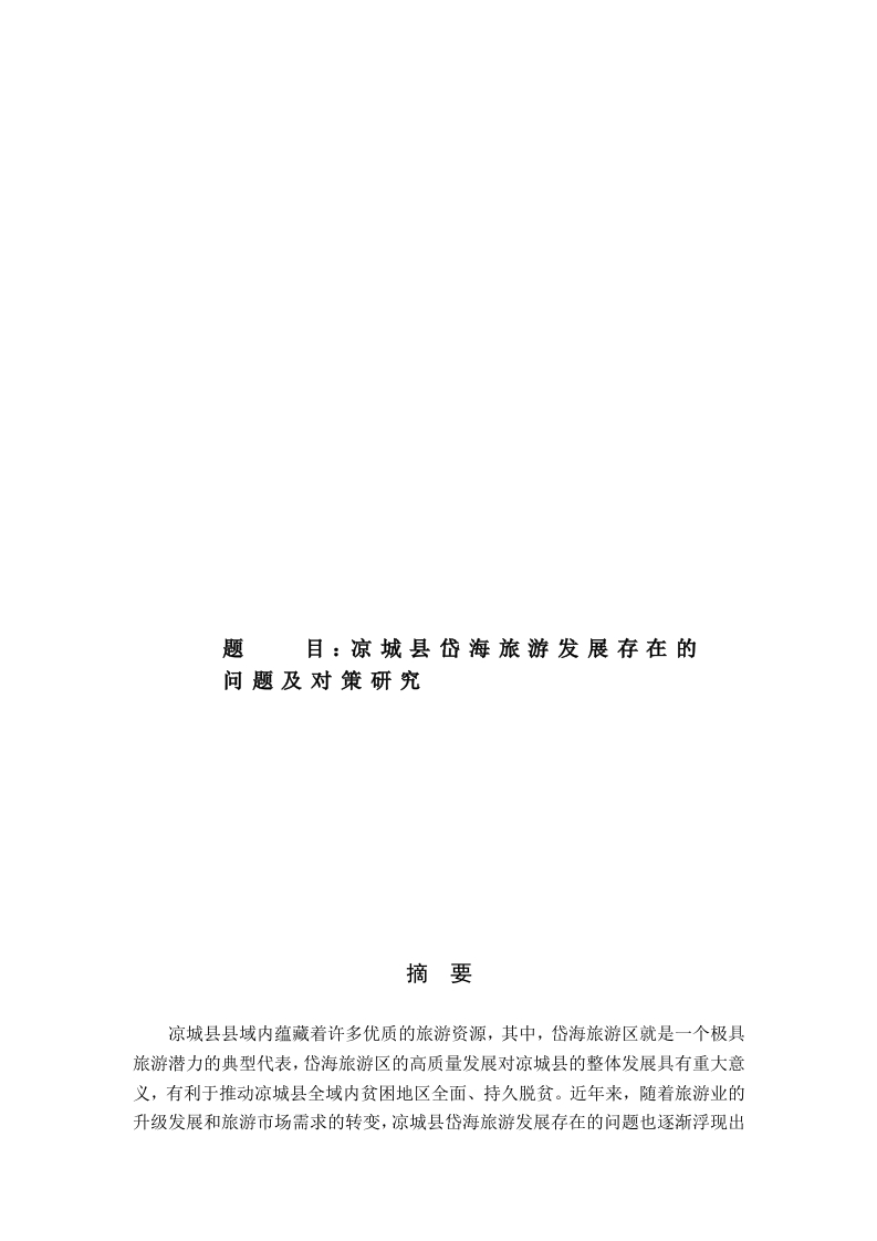 题目:凉城县岱海旅游发展存在的问题及对策研究摘要凉城县县域内蕴藏着许多优质的旅游资源,其中,岱海旅游区就是一个极具旅游潜力的典型代表,岱海旅游区的高质量发展对凉城县的整体发展具有重大意义,有利于推动凉城县全域内贫困地区全面、持久脱贫。近年来,随着旅游业的升级发展和旅游市场需求的转变,凉城县岱海旅游发展存在的问题也逐渐浮现出来:旅游精品项目缺乏:旅游文化内涵认识不足,品牌意识淡薄:旅游管理机构权责不清:从业人员素质较低等。本文主要针对岱海旅游发展现存问题,结合岱海旅游景区的实际情况,提出了岱海旅游发展的若干对策:开发和打造岱海旅游精品项目:大力宣传,强化岱海旅游品牌意识:明确岱海旅游管理机构权责:提升岱海旅游景区从业人员的素质。由此推动岱海旅游区高质量发展,以期促进凉城县岱海旅游景区的全面发展。关键词:凉城县:岱海旅游:发展对策AbstractThere are many high-quality tourism resources in Liangcheng County,among which Daihai tourism area is a typical representative with greattourism potential.If Daihai tourist attraction can be fully developed,it willbring new impetus to the development of Liangcheng County in thefuture.Fully exploiting the tourism potential of Daihai scenic spot canbring considerable economic benefits to Liangcheng County,and thensolve the problem of poverty in Liangcheng County.However,in theprocess of tourism development in Liangcheng County,it is not smoothsailing.At present,Daihai scenic spot faces many thorny problems,suchas the lack of high-quality projects in the scenic spot;the lack ofutilization of the rich cultural connotation contained in the scenic spot;the imperfection of tourism management institutions;the low quality ofemployees.Based on the current development situation of Daihai scenicspot,this study summarizes and summarizes the main existing problemsof the scenic spot,and then puts forward effective solutions to theseproblems:developing and creating the dai hai tourism boutique project;Vigorously promote and strengthen the brand awareness of daihai tourism;Clearing dai hai tourism management agency full responsibility;Improving the quality of employees in the dai hai scenic spot.Thuspushing the high-quality development of Daihai tourism area,in order topromote the all-round development of Daihai tourist attraction in