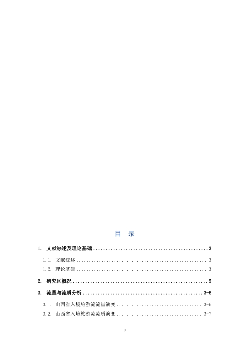 目录31.1.文献综述31.2.理论基础..53.1.山西省入境旅游流流量演变3-63.2.山西省入境旅游流流质演变.·911114.2.影响山西入境旅游质量的因素1112参考文献.…13致谢…149山西省入境旅游流流量与流质分析摘要:本文根据山西省2009年-2018年近十年的入境旅游接待相关数据,得出了山西省入境旅游流流量与流质的时间变化过程。结果表明,旅游流流量指数整体下降,下降的原因一是全球经济不稳定,入境游客收入受到影响,减少了外出旅游频率次:二是山西省旅游接待设施不够完善,接待能力有限,而且旅游资源的开发不到位,同质化严重,具有地域特色的旅游资源少,不能够吸引众多游客前来旅游观光。流质指数也趋于下降,表明山西省入境旅游经济效益不高。关键词:入境旅游流:流量:山西省The Topic of ThesisAbstract:according to the statistics of inbound tourism income and inbound tourismreception in Shanxi Province from 2009 to 2018.The evolution characteristics oftourist flow and fluid in Shanxi Province are presented.The results show that theoverall decline of tourism flow index is due to the outbreak of economic crisis,theincome of inbound tourists affected,reducing the frequency of travel;second,ShanxiProvince tourism reception facilities are not perfect,reception capacity is limited,andtourism resources development is not in place,homogenization is serious,tourismresources with regional characteristics are less,can not attract a large number oftourists to travel and sightseeing.The fluid index also tends to decline,indicating thatthe economic benefits of inbound tourism in Shanxi Province are not high.Key words:Ibound tourism flow Mass flow;Shanxi Province9