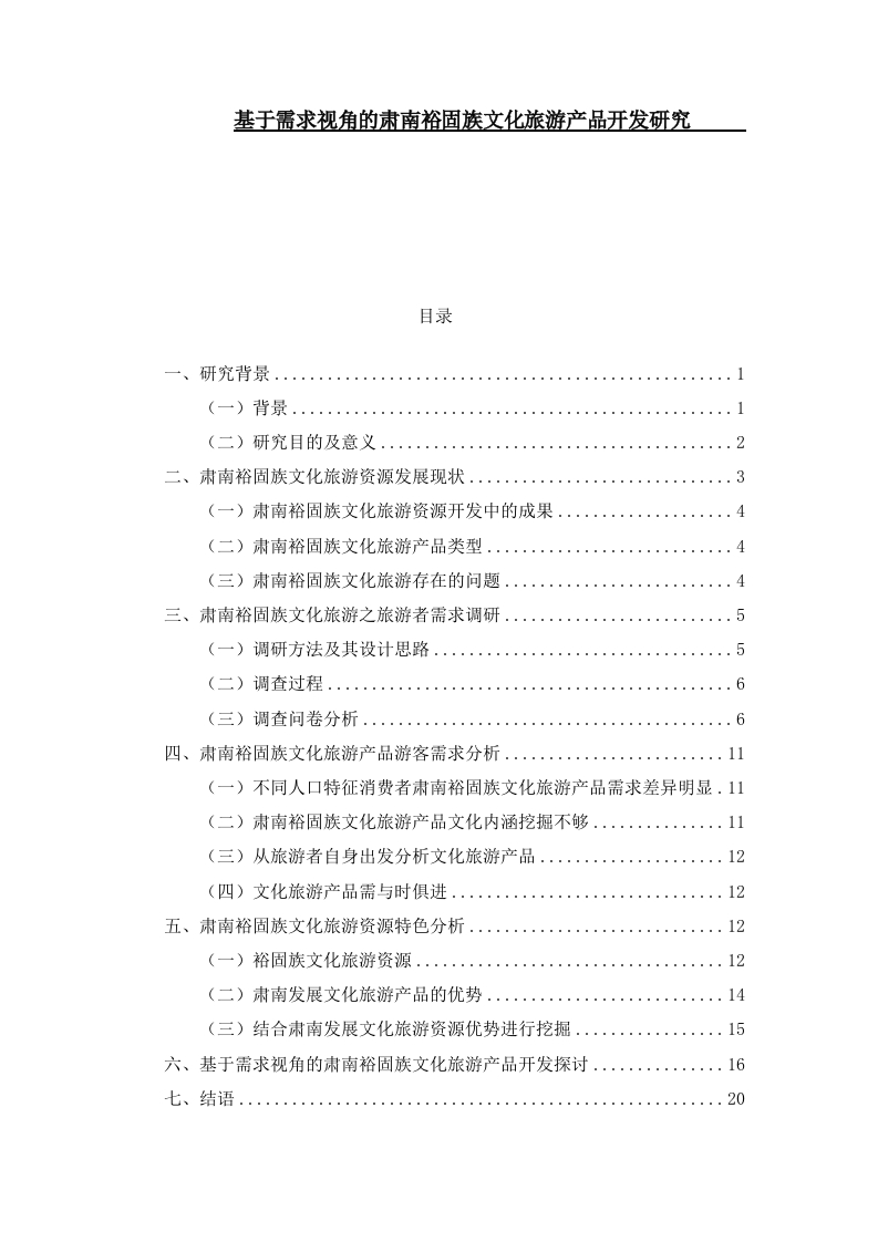 基于需求视角的肃南裕固族文化旅游产品开发研究目录一、(二)研究目的及意义..2(一)肃南裕固族文化旅游资源开发中的成果…4(三)肃南裕固族文化旅游存在的问题.….4三、肃南裕固族文化旅游之旅游者需求调研..(一)不同人口特征消费者肃南裕固族文化旅游产品需求差异明显.11(二)肃南裕固族文化旅游产品文化内涵挖掘不够....11五、肃南裕固族文化旅游资源特色分析....·(三)结合肃南发展文化旅游资源优势进行挖掘…15六、基于需求视角的肃南裕固族文化旅游产品开发探讨..16七、结语.参考文献:20致谢:21基于需求视角的肃南裕固族文化旅游产品开发研究郭勇摘要:近年来,随着文化旅游的兴起,越来越多的旅游者渴望精神层面的满足,获得新奇的文化体验,而我国文化旅游仍处于单层次的观赏旅游。所以只有牢牢抓住旅游者的心理需求,才能更好的研究文化旅游产品。本文采用问卷调查的方法收集相关数据,并通过数据分析肃南裕固族文化旅游产品现状和存在的问题,同时分析旅游者对肃南裕固族文化旅游产品需求。在此基础上提出肃南裕固族文化旅游产品开发措施,希望对肃南裕固族文化旅游产品的的进一步发展提供帮助。关键词:文化旅游:旅游产品开发:旅游者需求一、研究背景(一)背景20世纪60年代,大众旅游开始在发达国家流行,自1923年,我国国内第一家旅行社建立,旅游业却一直处于较弱态势,建国后又被赋予政治性质,直到改革开放1978年之后才开始出现一定规模的以观光为主体的大众旅游。社会经济得到飞速发展,这也体现在旅游规模的不断扩大以及旅游景点的不断增多,就甘肃省而言,到目前2020年,共有A级旅游景区289家,其中:5A级旅游景区5家,4A级旅游景区90家,3A级旅游景区107家,2A级旅游景区85家,1A级旅游景区2家0。面对旅游景区数量的突飞猛进,随之而来的是旅游热潮以迅雷不及掩耳之势的涌现,这不但引起了政府部门和企业单位的重视,而且学着们也开始密切关注起来,不管是政府部门还是企业单位,亦或是众多学者的关注,都使得我国的旅游产品得到了不同层面的开发,同时又刺激着人们的旅游需求。而对于人们的需求来说,备受瞩目的往往是旅游产品。这就需要大力发展旅游产品。旅游产品的开发经历了各个不同的阶段,很多的学者也从不同的角度研究了旅游产品的相关概念。谢彦军于1999年界定了旅游产品以及相关范畴的定义,明确之余,又有据可依;刘峰在1999年提出充分开发旅游产品应遵循资源导向、市场导向,产品导向和形象驱动这四大阶段:邓明艳则在2003年对于中国东部旅游产品的竞争优势进行着重探析并提出旅游产品自身特点和