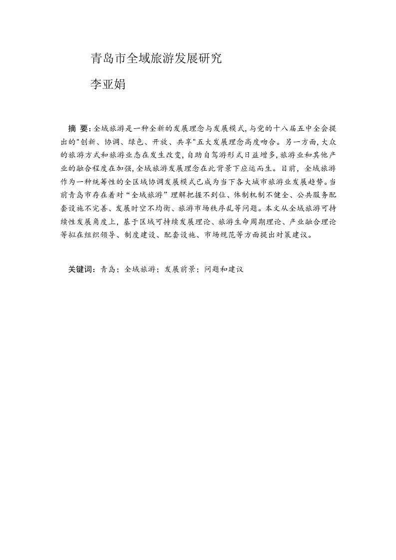 青岛市全域旅游发展研究李亚娟摘要:全域旅游是一种全新的发展理念与发展模式,与党的十八届五中全会提出的"创新、协调、绿色、开放、共享"五大发展理念高度吻合。另一方面,大众的旅游方式和旅游业态在发生改变,自助自驾游形式日益增多,旅游业和其他产业的融合程度在加强,全域旅游发展理念在此背景下应运而生。目前,全域旅游作为一种统筹性的全区域协调发展模式已成为当下各大城市旅游业发展趋势。当前青岛市存在着对“全域旅游”理解把握不到位、体制机制不健全、公共服务配套设施不完善、发展时空不均衡、旅游市场秩序乱等问题。本文从全域旅游可持续性发展角度上,基于区域可持续发展理论、旅游生命周期理论、产业融合理论等拟在组织领导、制度建设、配套设施、市场规范等方面提出对策建议。关键词:青岛;全域旅游:发展前景;问题和建议Abstract:Global tourism is a brand-new development concept and developmentmodel,which is highly consistent with the five major development concepts of"innovation,coordination,green,openness and sharing"put forward by the FifthPlenary session of the 18th CPC Central Committee.On the other hand,the public'sway of tourism and the form of tourism are changing,the form of self-driving travel isincreasing,and the degree of integration of tourism and other industries is beingstrengthened.under this background,the concept of global tourism developmentarises at the historic moment.At present,as a coordinated development model of thewhole region,global tourism has become the development trend of tourism in majorcities.At present,there are some problems in Qingdao,such as inadequateunderstanding of "global tourism",imperfect system and mechanism,imperfect publicservice facilities,uneven development of time and space,disorderly tourism marketand so on.In this paper,from the point of view of the sustainable development ofglobal tourism,based on regional sustainable development theory,tourism life cycletheory,industrial integration theory and so on,this paper puts forward somecountermeasures and suggestions in the aspects of organizational leadership,systemconstruction,supporting facilities,market norms and so on.Key words:Qingdao;Global tourism;Development prospects;Problems andsuggestions目录引言…(一)研究背景(二)研究意义(三)研究方法2-(四)研究思路2-3-(一)全域旅游的概念及理论基础3-1.全域旅游的概念3-2.区域可持续发展理论...-3-3.旅游生命周期理论...-3-4.产业融合理论....-4-(二)国内外研究综述-4-二、青岛市旅游资源分析6-(一)区位和交通条件-6-6-(二)自然条件分析6-6--7-三、国内外全域旅游的经典案例..8-(一)新加坡城市全域辐射型8-8-2.构建产旅融合的旅游体系.…8-8-(二)山东省五莲县龙头景区带动型9-1.龙头景区带动提升景区整体水平..-9--9-3.加强品牌宣传.…-9-四、青岛市全域旅游发展SW0T分析....