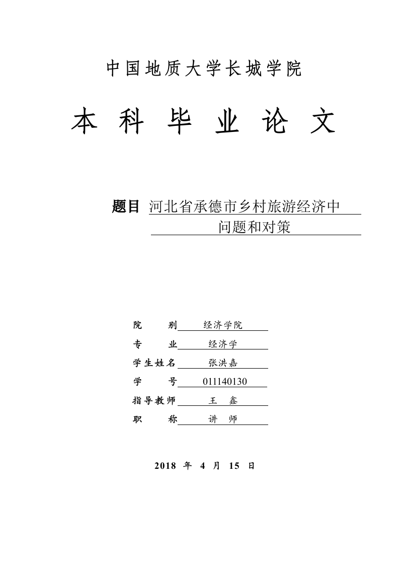 中国地质大学长城学院本科毕业论文题目河北省承德市乡村旅游经济中问题和对策院别经济学院专业经济学学生姓名张洪嘉学011140130指导教师王鑫职称讲师2018年4月15日本科毕业生毕业论文(设计)诚信承诺书毕业论文河北省承德市乡村旅游经济中的问题和对策(设计)题目学生姓名张洪嘉专业经济学学号011140130指导老师王倩职称讲师所在院别经济学院诚信承诺本人慎重承诺和声明:我承诺在毕业论文(设计)活动中遵守学校有关规定,恪守学术规范,在本人的毕业论文中不剽窃、抄袭他人的学术观点、思想和成果,不篡改研究数据,如有违规行为发生,我愿承担一切责任,接受学校的处理。学生(签名)张洪嘉2018年5月22日中国地质大学长城学院毕业论文任务书学生姓名张洪嘉学号011140130专业班级14级经济学1班指导教师王鑫职称讲师单位中国地质大学长城学院毕业论文河北省承德市乡村旅游经济中的问题和对策题目毕业论文主要内容和要求:主要内容:本文通过研究河北省承德市乡村旅游经济的近况来说明乡村旅游经济中存在的问题,运用具体问题具体分析的方法对旅游经济的主要问题进行分析,提出对策。论文首先大体叙述了河北省承德市乡村旅游经济的具体现状,搜集各种资料及数据,通过对河北省承德市乡村旅游经济的现状进行分析,结合国家政府所提出的政策和措施提出自己的建议和对策,进一步实现乡村旅游经济的可持续发展。要求:论文撰写要求思路清晰、内容充实、论点明确,论据充分,论证严密,语言通顺。撰写论文前应首先阅读相关的研究资料,掌握学术前沿动态,对相关理论著作要很好的把握,提高理论水平及思想深度。根据开题报告和老师提出的意见对论文提纲进行修改,确定大纲后认真撰写毕业论文。撰写论文结束后要根据老师的修改意见,认真反复的修改论文,并按照要求参加毕业论文的答辩,严格按照论文进度安排进行论文的写作。论文的格式、字数等撰写方面的要求参照《中国地质大学长城学院毕业论文(设计)撰写规范》。毕业论文主要参考资料:[1]方荣辉.新常态视角下乡村旅游发展探析[J刀.成都行政学院学报,2017(06):50-52.[2]王敬超.新常态下乡村文化旅游产品供给侧改革研究[J刀.内蒙古财经大学学报,2017,15(06):1-4.[3]项利华.浅淡乡村旅游与乡村经济发展[J刀.南方农业,2017,11(30):56-57.[4]侯燚.当前我国乡村旅游发展中面临的障碍因素与对策探讨[J刀.统计与管理,2017(10):132-134.[5]李涛,周衍庆.基于模糊层次法的乡村旅游经济社会综合效益评价[J刀.潍坊工程职业学院学报,2017,30(05):79-84+87.[6]汪正彬.我国乡村旅游经济发展研究[J刀.改革与战略,2017,33(08):131-133+162.[7]陈瑞萍.乡村旅游经济对区域转型带动作用分析与研究[J刀.工程经济,2015(07):120-124.[8]田水莲.关于我国乡村旅游经济可持续发展的讨论[J刀.农村经济与科技,2017,28(20):54.[9]马嘉声.乡村旅游业发展对农村经济的影响研究[J刀.农村经济与科技,2017,28(11):89-91.[10]倪雅珍.探析乡村旅游与农村经济互动可持续发展模式[J].山西农经,2017(21):57-58.[11]周莉.乡村旅游经济发展问题探究[J刀.经贸实践,2016(05):57.[12]彭喆.我国特色旅游经济理论的形成与发展[J刀].商,2016(18):294.[13]Katia Laura Sidali,Elisabeth Kastenholz,Rossella Bianchi.Food tourism,niche markets and products inrural tourism:combining the intimacy model and the experience economy as a rural developmentstrategy[J].Journal of Sustainable Tourism,2015,23(8-9).