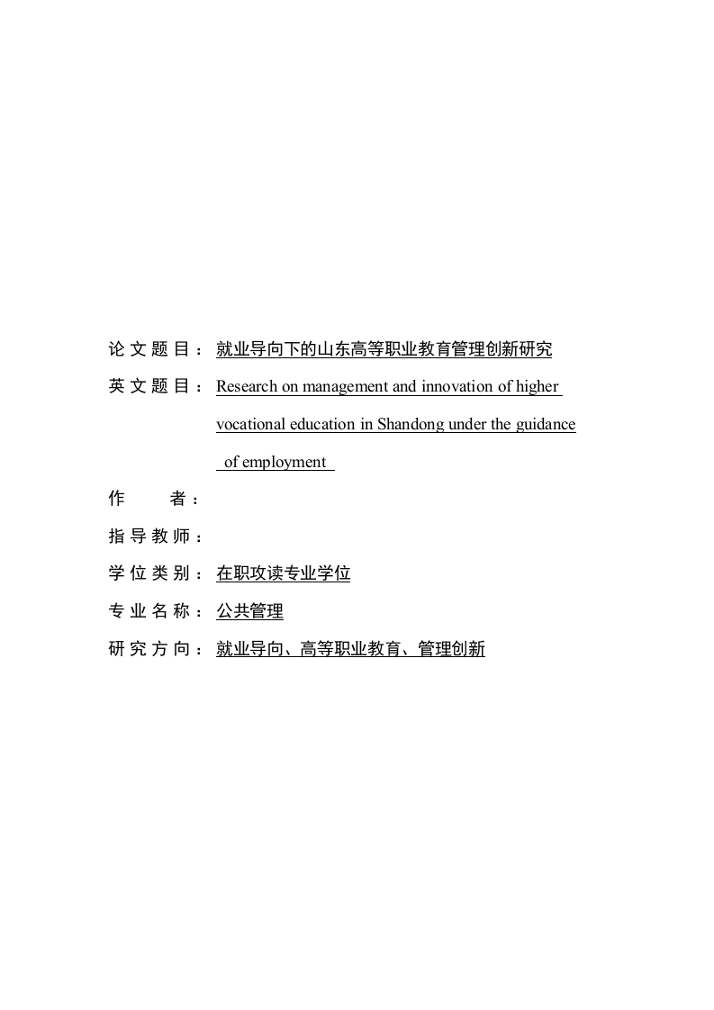 论文题目:就业导向下的山东高等职业教育管理创新研究英文题目:Research on management and innovation of highervocational education in Shandong under the guidanceof employment作者:指导教师:学位类别:在职攻读专业学位专业名称:公共管理研究方向:就业导向、高等职业教育、管理创新谨以此文献给中国海洋大学