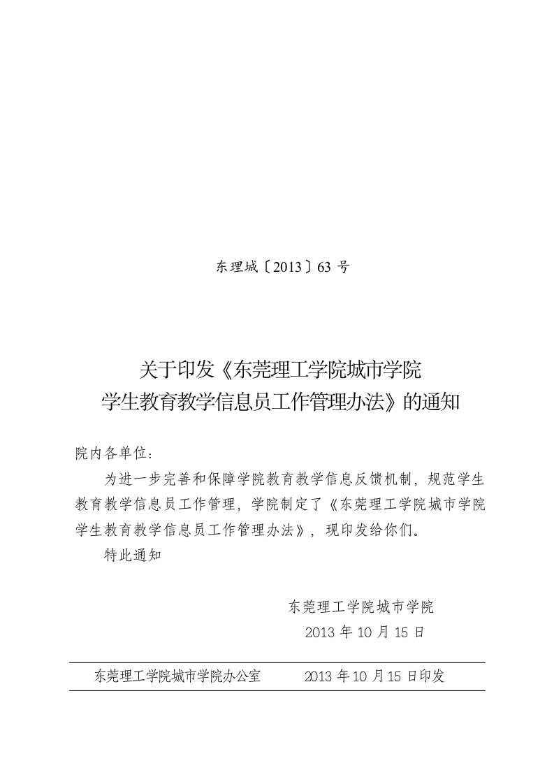 东理城〔2013〕63号关于印发《东莞理工学院城市学院学生教育教学信息员工作管理办法》的通知院内各单位:为进一步完善和保障学院教育教学信息反馈机制,规范学生教育教学信息员工作管理,学院制定了《东莞理工学院城市学院学生教育教学信息员工作管理办法》,现印发给你们。特此通知东莞理工学院城市学院2013年10月15日东莞理工学院城市学院办公室2013年10月15日印发东莞理工学院城市学院学生教育教学信息员工作管理办法一、组织机构1.学院设立院学生教育教学信息员中心,设主席1名,副主席2名,负责统筹管理全院教育教学信息员中心日常工作;2.各系、高职部设立系(部)学生教育教学信息员中心,并设主任1名,副主任4名,在学生信息员中选拔聘任,负责本系(部)教育教学信息员中心的日常管理工作;3.每个教学班设学生教育教学信息员1名,原则上从各班级的学习委员中聘任,根据工作需要,也可从其他学生中聘任;4.学生教育教学信息员工作由院督导办公室负责管理。二、学生教育教学信息员的任职资格1.坚持原则,严格遵守学院各项规章制度,热心为同学和班级服务,在同学中有较高的威信;2.品行优良,办事公正,尊敬师长,团结同学,能够深入同学开展工作,有良好的沟通能力和思辨能力;3.勤奋好学,学习成绩优良;4.工作责任心强,有较好的组织能力和文字表达能力。三、学生教育教学信息员的主要任务-2-1.教师的教学方面:客观公正地收集学生对任课教师的教学态度、教学内容、教学方法、教学手段、教学水平和教学过程各个环节的意见和建议,如:教师上课迟到、提前下课、请人代课、随意停课等影响教学秩序稳定的行为;作业批改极不负责、学生学习成绩评定明显不公正、故意泄露考试题目;实验教学走过场。违反教师职业道德、讲课内容陈旧、照本(屏)宣科、放任学生不管、引起多数学生反感的行为等。发现深受学生欢迎的教师及其特点,优秀教师的感人事迹,如:带病上课、教学认真负责,关爱学生,教学效果好,克服重大困难坚持上课的感人行为等。2.学生的学习及思想情况:反馈学风状况,包括上课出勤情况、课堂纪律、课堂参与、课外自习、课外作业、考风考纪等;有可能影响学校稳定或学生安全的情绪状态或异常行为等。3.教学管理方面:反馈学生对学院教学管理制度、教学活动的组织安排、教学质量管理、人才培养方案的执行情况以及本年级各专业的课程设置等方面的意见和建议。4.教学条件方面:反馈学生对教学条件,包括教材、教学仪器设备、图书资料、设备维修,教学场所等的意见和建议。5.学生生活与学校后勤服务方面:反馈学生对课外科技文化活动、校园环境、基础设施、宿舍管理、饭堂管理等方面的意见和建议。四、工作方式-3-