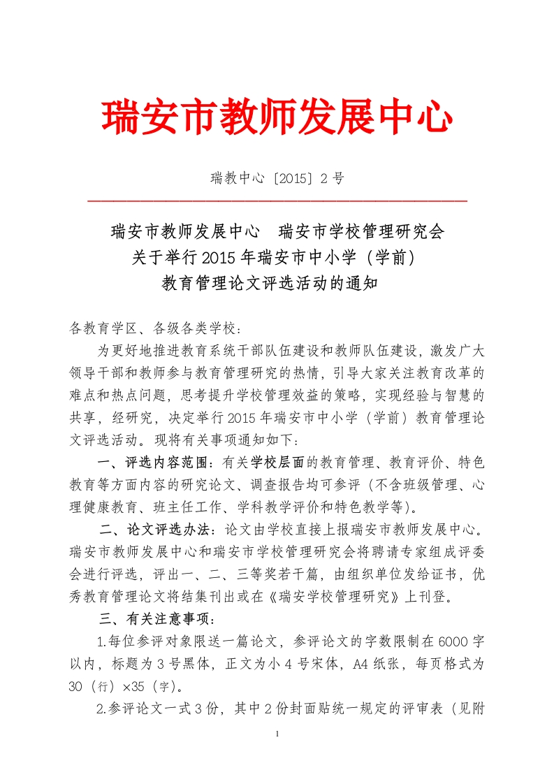 瑞安市教师发展中心瑞教中心[2015]2号瑞安市教师发展中心瑞安市学校管理研究会关于举行2015年瑞安市中小学(学前)教育管理论文评选活动的通知各教育学区、各级各类学校:为更好地推进教育系统干部队伍建设和教师队伍建设,激发广大领导干部和教师参与教育管理研究的热情,引导大家关注教育改革的难点和热点问题,思考提升学校管理效益的策略,实现经验与智慧的共享,经研究,决定举行2015年瑞安市中小学(学前)教育管理论文评选活动。现将有关事项通知如下:一、评选内容范围:有关学校层面的教育管理、教育评价、特色教育等方面内容的研究论文、调查报告均可参评(不含班级管理、心理健康教育、班主任工作、学科教学评价和特色教学等)。二、论文评选办法:论文由学校直接上报瑞安市教师发展中心。瑞安市教师发展中心和瑞安市学校管理研究会将聘请专家组成评委会进行评选,评出一、二、三等奖若干篇,由组织单位发给证书,优秀教育管理论文将结集刊出或在《瑞安学校管理研究》上刊登。三、有关注意事项:1.每位参评对象限送一篇论文,参评论文的字数限制在6000字以内,标题为3号黑体,正文为小4号宋体,A4纸张,每页格式为2.参评论文一式3份,其中2份封面贴统一规定的评审表(见附1件1),另外1份不贴封面,所有正文内不署学校及作者姓名。3.各校于2015年3月30日前将纸质参评论文一式3份(附1份打印好的推荐清单),送瑞安市教师发展中心(教育局622室)陈荣老师收,联系电话:66802018;手机:651270。并将《论文推荐清单》(Excel格式,见附件2)及参评论文内容电子稿(word格式,教师论文电子稿以个人姓名命名,再以学校为单位命名文件包)发至以下邮箱:raks603@163.com,附件1:2015年瑞安市中小学教育管理论文封面附件2:2015年瑞安市中小学教育管理论文推荐清单瑞安市教师发展中心2015年3月5日2附件12015年瑞安市中小学教育管理论文学段:口普高口职高口初中口小学口幼教论文题目:学校:姓名:手机全号:(内页不要署名)3