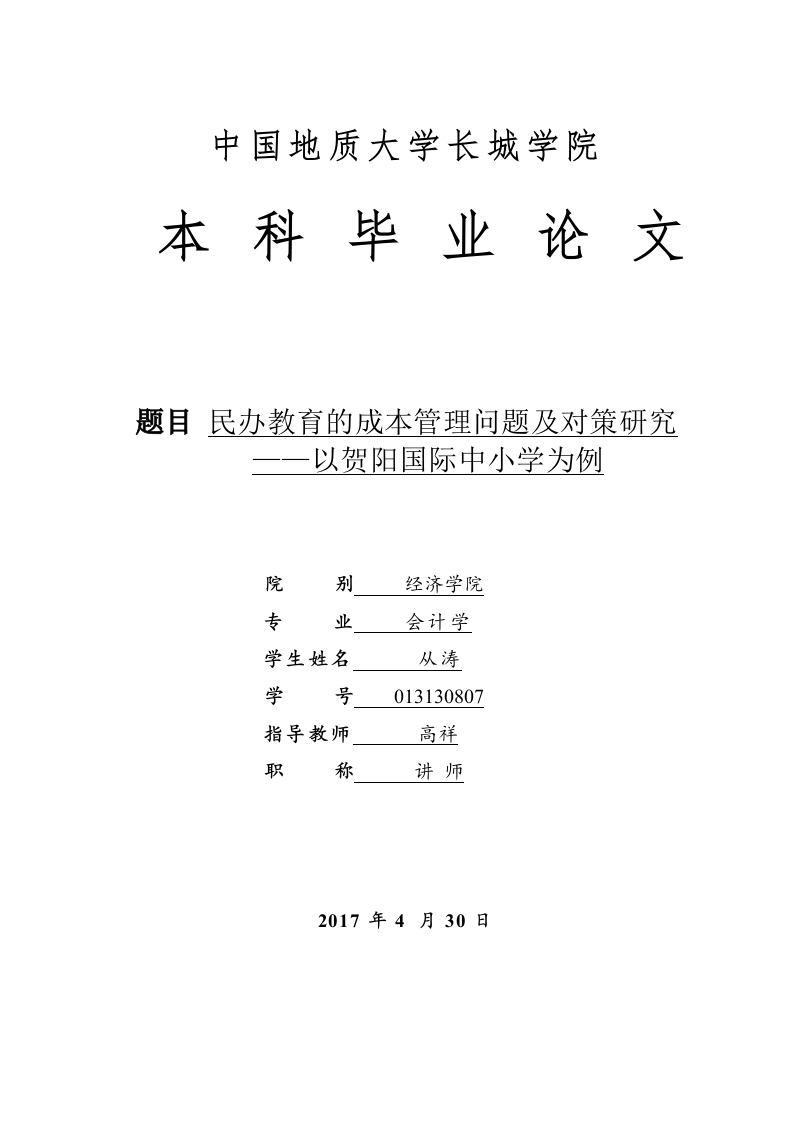 中国地质大学长城学院本科毕业论文题目民办教育的成本管理问题及对策研究一一以贺阳国际中小学为例院别经济学院专业会计学学生姓名从涛学号013130807指导教师高祥职称讲师2017年4月30日本科毕业生毕业论文(设计)诚信承诺书毕业论文民办教育的成本管理问题及对策研究(设计)题目以贺阳国际中小学为例学生姓名从涛专业会计学学号013130807指导老师高祥职称讲师所在院别经济学院诚信承诺本人慎重承诺和声明:我承诺在毕业论文(设计)活动中遵守学校有关规定,恪守学术规范,在本人的毕业论文中不剽窃、抄袭他人的学术观点、思想和成果,不篡改研究数据,如有违规行为发生,我愿承担一切责任,接受学校的处理。年月日中国地质大学长城学院毕业论文任务书学生姓名从涛学号013130807专业班级会计学八班指导教师高祥职称讲师单位中国地质大学长城学院毕业论文题目民办教育的成本管理问题及对策研究一以贺阳国际中小学为例毕业论文主要内容和要求:主要内容:本文从贺阳国际中小学概况入手,先简述其成本管理现状。以其固定资产投资及折旧、日常公用费用、广告宣传费用、应付职工薪酬、成本管理活动等五个方面对贺阳国际中小学教育成本管理及控制问题进行分析,总结学校教育成本中固定成本、变动成本等主要成本的控制管理上存在的问题,并从成本管理的视角对教育集团成本问题提出一系列对策研究和改善措施。从而为民办教育提高经济效益、减少教育成本,促进民办教育机构高效运营并实现教育教学目标长远发展进行一系列的对策研究。要求:论文撰写要求思路清晰、内容充实、论点明确,论据充分,论证严密,语言通顺。撰写论文前应首先阅读相关的研究资料,掌握学术前沿动态,对相关理论著作要很好的把握,提高理论水平及思想深度。根据开题报告和老师提出的意见对论文提纲进行修改,确定大纲后认真撰写毕业论文。撰写论文结束后要根据老师的修改意见,认真反复的修改论文,并按照要求参加毕业论文的答辩,严格按照论文进度安排进行论文的写作。论文的格式、字数等撰写方面的要求参照《中国地质大学长城学院毕业论文(设计)撰写规范》。毕业论文主要参考资料:《关于修改<中华人民共和国民办教育促进法>的决定》,2016年11月7日,第十二届全国人民代表大会常务委员会第二十四次会议.[2]陈金秀.民办高等职业教育管理体制研究[D].山东师范大学,2014.[3]孟利,李军卫,宋祺.以质量为核心,推动内涵式发展一一黑龙江省民办高校教育质量探索[].深化教学改革·提升高等教育质量(上册)[C].2015[4]张晓云.民办高校办学风险防范研究[D].沈阳师范大学,2014.武珂.我国民办高校教育成本管理研究[D].河南大学,2014.[6】陈仕萍.价值链分析在高校成本管理中的应用研究[J刀.金融经济,2014(02)[7]杨苑.D公司成本管理问题诊断研究[D].江苏大学,2016.[8]郭丽.高校财务管理工作若干问题的研究与对策[D].华中师范大学,2014.[9]李龙.成本管控与企业经营的变革创新[N].中国航空报.2016-10-22(005)[10]作业成本法在民办高校教育成本核算的应用可行性分析[J刀.经济研究导刊,2017-01-15