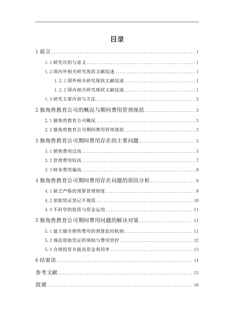 目录1.2国内外相关研究现状文献综述.·1.2.1国外相关研究现状文献综述1.2.2国内相关研究现状文献综述.....2独角兽教育公司的概况与期间费用管理现状32.1独角兽教育公司概况...2.2独角兽教育公司期间费用管理现状33独角兽教育公司期间费用存在的主要问题.…3.3财务费用偏高....4.1缺乏严格的预算管理制度4.2原始凭证登记不规范5独角兽教育公司期间费用问题的解决对策..…115.1建立健全销售费用的预算监控机制..5.2规范原始凭证的填制与费用管控5.3合理投资并提高资金利用率.136结束语...141516独角兽教育公司期间费用管理研究杨翠丽摘要:如今,教育辅导行业在期间费用上逐年攀高的现象较为普遍,直接或间接地影响了公司的获利能力,财务状况与资金流动。随着独角兽教育公司办学规模的持续扩张,其期间费呈现刚性增长。广告销售投入过猛,租赁费用占比较高,资金理财机制不健全等,都逐渐压缩了企业的利润,造成资源浪费。如何正确控制期间费用的支出,显得愈加迫切。本文对独角兽教育公司期间费用过高的问题进行研究,提出了科学减少销售费用、管理费用、财务费用的相应对策,对提高教育机构的经济效益与管理水平具有一定的研究价值。关键词:期间费用:教育机构;预算控制;监督机制Research on Period Cost Management ofUnicorn Education CompanyByYANG Cui-liMarch,2020Abstract:Nowadays,it is common that the cost of education and counseling industryincreases year by year,which directly or indirectly affects the profitability,financialstatus and cash flow of enterprises.The reason lies in not paying enough attention tothe budget management,not strict examination and approval of expenses,not highprofessional level of management personnel,lack of supervision mechanism and soon.Effective control of period cost can reduce product cost,optimize capital structureand improve enterprise profit.With the continuous expansion of Unicorn educationcompany's scale,its period fee shows a rigid growth.The excessive investment inadvertising sales,the high proportion of leasing costs,and the imperfect financialmanagement mechanism have gradually reduced the profits of enterprises,resulting inwaste of resources,so it is more and more urgent to correctly control the periodexpenses.This article studies the high cost of Unicorn education company during theperiod,and puts forward the corresponding countermeasures to reduce the sales cost,management cost and financial cost scientifically,which has certain research value forimproving the economic efficiency and management level of education institutions.Keywords:period expenses;educational institutions;budget control;monitoringmechanism